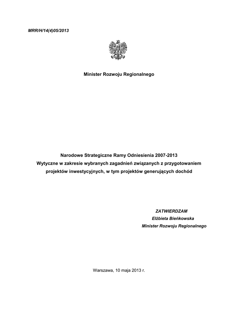 MRR/H/14(4)05/2013 Minister Rozwoju Regionalnego Narodowe Strategiczne Ramy Odniesienia 2007-2013 Wytyczne w zakresie wybranych zagadnień związanych z przygotowaniem projektów inwestycyjnych, w tym projektów generujących dochód ZATWIERDZAM Elżbieta Bieńkowska Minister Rozwoju Regionalnego Warszawa, 10 maja 2013 r. Spis treści Rozdział 1 – Podstawa prawna i zakres Wytycznych ................................................................................... 3 Rozdział 2 – Słownik stosowanych pojęć ..................................................................................................... 3 Rozdział 3 – Warunki ogólne ...................................................................................................................... 16 Rozdział 4 – Definicja celów projektu ......................................................................................................... 18 Rozdział 5 – Identyfikacja projektu ............................................................................................................. 19 Rozdział 6 – Analiza wykonalności i rozwiązań alternatywnych................................................................. 20 Rozdział 7 – Analiza finansowa .................................................................................................................. 20 7.1 Podrozdział 1 – Cele ...................................................................................................................... 20 7.2 Podrozdział 2 – Etapy analizy finansowej...................................................................................... 21 7.3 Podrozdział 3 – Ogólna metodyka przeprowadzania analizy finansowej ...................................... 21 7.4 Podrozdział 4 – Założenia do analizy finansowej .......................................................................... 22 7.5 Podrozdział 5 – Metody analizy finansowej w zależności od kategorii inwestycji ........................ 25 7.6 Podrozdział 6 – Obliczanie wartości dofinansowania z funduszy UE............................................ 28 7.7 Podrozdział 7 – Ustalenie wartości wskaźników efektywności ...................................................... 32 7.8 Podrozdział 8 – Analiza trwałości finansowej ................................................................................ 34 Rozdział 8 – Analiza kosztów i korzyści...................................................................................................... 35 8.1 Podrozdział 1 – Analiza kosztów i korzyści dużych projektów....................................................... 35 8.2 Podrozdział 2 – Analiza kosztów i korzyści projektów nie zaliczanych do dużych projektów ....... 37 Rozdział 9 – Analiza wrażliwości i ryzyka ................................................................................................... 38 Rozdział 10 – Stosowanie podejścia sektorowego ..................................................................................... 40 Rozdział 11 – Monitorowanie kosztów kwalifikowalnych (EC) oraz dochodów w przypadku projektów generujących dochód .................................................................................................................................. 41 11.1 Podrozdział 1 – Monitorowanie dochodów w przypadku projektów, o których mowa w art. 55 ust. 2 rozporządzenia Rady (WE) nr 1083/2006 .................................................................................. 41 11.2 Podrozdział 2 – Monitorowanie dochodów w przypadku projektów, o których mowa w art. 55 ust. 3 rozporządzenia Rady (WE) nr 1083/2006 .................................................................................. 44 Załącznik 1 – Zestawienie kategorii przepływów pieniężnych branych pod uwagę w celu wyliczenia wskaźników efektywności finansowej i ekonomicznej oraz wzory do obliczenia tych wskaźników............ 47 Załącznik 2 – Zakres studium wykonalności opisany w Wytycznych ......................................................... 51 Załącznik 3 – Obliczanie dofinansowania z funduszy UE dla projektów generujących dochód................. 52 Załącznik 4 – Szczegółowe zasady przygotowania inwestycji w zakresie środowiska współfinansowanych przez Fundusz Spójności i Europejski Fundusz Rozwoju Regionalnego w latach 2007-2013………........54 2 Rozdział 1 – Podstawa prawna i zakres Wytycznych 1) Niniejszy dokument, zwany dalej „Wytycznymi”, został wydany na podstawie art. 35 ust. 3 pkt 4b ustawy z dnia 6 grudnia 2006 r. o zasadach prowadzenia polityki rozwoju1. 2) Wytyczne skierowane są do wszystkich podmiotów uczestniczących we wdrażaniu pomocy w ramach programów operacyjnych. 3) Wytyczne określają sposób opracowania wybranych elementów studium wykonalności lub innego dokumentu określonego przez właściwą Instytucję Zarządzającą przygotowywanego na potrzeby analizy i oceny projektów inwestycyjnych, w tym w szczególności dużych projektów, o których mowa w art. 39 rozporządzenia Rady (WE) nr 1083/2006 z dnia 11 lipca 2006 r. ustanawiającego przepisy ogólne dotyczące Europejskiego Funduszu Rozwoju Regionalnego, Europejskiego Funduszu Społecznego oraz Funduszu Spójności i uchylającego rozporządzenie (WE) nr 1260/19992, zwanego dalej „rozporządzeniem Rady (WE) nr 1083/2006”, oraz projektów generujących dochód, o których mowa w art. 55 rozporządzenia Rady (WE) nr 1083/2006. 4) Wytyczne wskazują sposoby określania maksymalnej wysokości dofinansowania w oparciu o metodę luki w finansowaniu, o której mowa w rozdziale 7.6, mającej zastosowanie do projektów generujących dochód zgodnie z art. 55 rozporządzenia Rady (WE) nr 1083/2006. 5) Wytyczne określają kwestie związane z monitorowaniem dochodu generowanego przez projekty spełniające kryteria art. 55 rozporządzenia Rady (WE) nr 