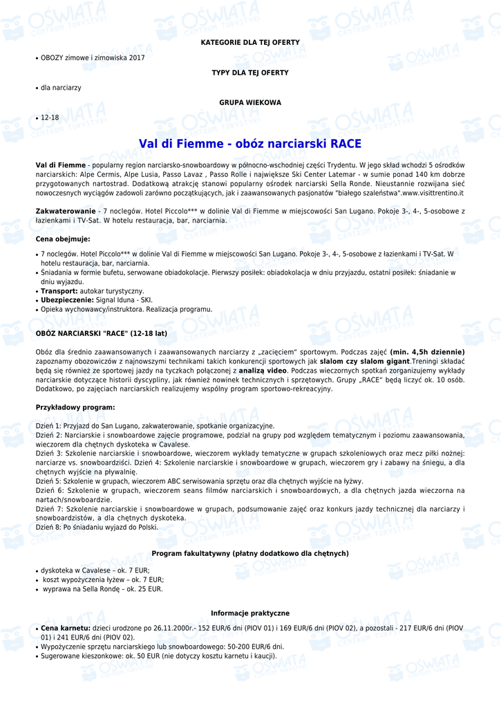 KATEGORIE DLA TEJ OFERTY ● OBOZY zimowe i zimowiska 2017 TYPY DLA TEJ OFERTY ● dla narciarzy GRUPA WIEKOWA ● 12-18 Val di Fiemme - obóz narciarski RACE Val di Fiemme - popularny region narciarsko-snowboardowy w północno-wschodniej części Trydentu. W jego skład wchodzi 5 ośrodków narciarskich: Alpe Cermis, Alpe Lusia, Passo Lavaz , Passo Rolle i największe Ski Center Latemar - w sumie ponad 140 km dobrze przygotowanych nartostrad. Dodatkową atrakcję stanowi popularny ośrodek narciarski Sella Ronde. Nieustannie rozwijana sieć nowoczesnych wyciągów zadowoli zarówno początkujących, jak i zaawansowanych pasjonatów "białego szaleństwa".www.visittrentino.it Zakwaterowanie - 7 noclegów. Hotel Piccolo*** w dolinie Val di Fiemme w miejscowości San Lugano. Pokoje 3-, 4-, 5-osobowe z łazienkami i TV-Sat. W hotelu restauracja, bar, narciarnia. Cena obejmuje: ● ● ● ● ● 7 noclegów. Hotel Piccolo*** w dolinie Val di Fiemme w miejscowości San Lugano. Pokoje 3-, 4-, 5-osobowe z łazienkami i TV-Sat. W hotelu restauracja, bar, narciarnia. Śniadania w formie bufetu, serwowane obiadokolacje. Pierwszy posiłek: obiadokolacja w dniu przyjazdu, ostatni posiłek: śniadanie w dniu wyjazdu. Transport: autokar turystyczny. Ubezpieczenie: Signal Iduna - SKI. Opieka wychowawcy/instruktora. Realizacja programu. OBÓZ NARCIARSKI "RACE" (12-18 lat) Obóz dla średnio zaawansowanych i zaawansowanych narciarzy z „zacięciem“ sportowym. Podczas zajęć (min. 4,5h dziennie) zapoznamy obozowiczów z najnowszymi technikami takich konkurencji sportowych jak slalom czy slalom gigant.Treningi składać będą się również ze sportowej jazdy na tyczkach połączonej z analizą video. Podczas wieczornych spotkań zorganizujemy wykłady narciarskie dotyczące historii dyscypliny, jak również nowinek technicznych i sprzętowych. Grupy „RACE“ będą liczyć ok. 10 osób. Dodatkowo, po zajęciach narciarskich realizujemy wspólny program sportowo-rekreacyjny. Przykładowy program: Dzień 1: Przyjazd do San Lugano, zakwaterowanie, spotkanie organizacyjne. Dzień 2: Narciarskie i snowboardowe zajęcie programowe, podział na grupy pod względem tematycznym i poziomu zaawansowania, wieczorem dla chętnych dyskoteka w Cavalese. Dzień 3: Szkolenie narciarskie i snowboardowe, wieczorem wykłady tematyczne w grupach szkoleniowych oraz mecz piłki nożnej: narciarze vs. snowboardziści. Dzień 4: Szkolenie narciarskie i snowboardowe w grupach, wieczorem gry i zabawy na śniegu, a dla chętnych wyjście na pływalnię. Dzień 5: Szkolenie w grupach, wieczorem ABC serwisowania sprzętu oraz dla chętnych wyjście na łyżwy. Dzień 6: Szkolenie w grupach, wieczorem seans filmów narciarskich i snowboardowych, a dla chętnych jazda wieczorna na nartach/snowboardzie. Dzień 7: Szkolenie narciarskie i snowboardowe w grupach, podsumowanie zajęć oraz konkurs jazdy technicznej dla narciarzy i snowboardzistów, a dla chętnych dyskoteka. Dzień 8: Po śniadaniu wyjazd do Polski. Program fakultatywny (płatny dodatkowo dla chętnych) ● ● ● dyskoteka w Cavalese – ok. 7 EUR; koszt wypożyczenia łyżew – ok. 7 EUR; wyprawa na Sella Rondę – ok. 25 EUR. Informacje praktyczne ● ● ● Cena karnetu: dzieci urodzone po 26.11.2000r.- 152 EUR/6 dni (PIOV 01) i 169 EUR/6 dni (PIOV 02), a pozostali - 217 EUR/6 dni (PIOV 01) i 241 EUR/6 dni (PIOV 02). Wypożyczenie sprzętu narciarskiego lub snowboardowego: 50-200 EUR/6 dni. Sugerowane kieszonkowe: ok. 50 EUR (nie dotyczy kosztu karnetu i kaucji). ● ● ● ● ● ● ● Przy zakwaterowaniu pobierana jest kaucja 25 EUR zwracana w dniu wyjazdu, o ile nie zostały wyrządzone żadne szkody. Obóz nie jest przeznaczony dla osób, które rozpoczynają naukę jazdy na nartach lub snowboardzie. W przypadku złych warunków atmosferycznych zajęcia programowe oraz uzupełniające mogą ulec modyfikacji. Na obóz należy zabrać ze sobą paszport/dowód osobisty, kaski ochronne, które są obowiązkowe poniżej 18 roku życia, snowboardziści ochraniacze na nadgarstki; stroje kąpielowe. Organizator nie ponosi odpowiedzialności za ewentualne zmiany ceny karnetów wprowadzone przez ośrodek narciarski. Cena nie obejmuje: napojów do obiadokolacji, dopłaty za transport z miast wyszczególnionych w planie podróży oraz kosztów karnetów. Obowiązują warunki uczestnictwa organizatora imprezy Możliwe terminy wyjazdu Lp. Data początku Data końca Cena Wolne miejsca 1. 13-01-2017 22-01-2017 1899 zł termin jest niedostępny 2. 10-02-2017 19-02-2017 1999 zł termin jest niedostępny Możliwe miejsca wyjazdu Lp. Miasto Adres Dopłata Wyjazd 1. Katowice ul. Piotra Skargi 4, Dworzec Autobusowy, stanowiska 1-4 (obok Supersamu) +80 zł 23:00 2. Łódź al. Włókniarzy 227, Dworzec PKS Łódź Kaliska, przy stanowiskach 4,5,6 (wjazd od ulicy Karolewskiej) +100 zł 19:30 3. Wrocław ul. Joannitów 13, Tymczasowy Dworzec Autobusowy (za budynkiem dyrekcji PKP), stanowiska 12,13 +100 zł 23:00 4. Warszawa Al. Jerozolimskie 144, Dworzec Autobusowy Warszawa Zachodnia, stanowisko 10 +150 zł 16:30