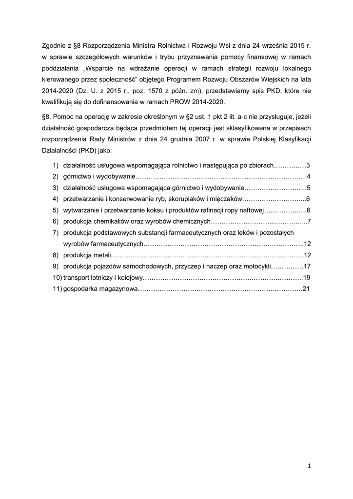 Zgodnie z §8 Rozporządzenia Ministra Rolnictwa i Rozwoju Wsi z dnia 24 września 2015 r. w sprawie szczegółowych warunków i trybu przyznawania pomocy finansowej w ramach poddziałania „Wsparcie na wdrażanie operacji w ramach strategii rozwoju lokalnego kierowanego przez społeczność” objętego Programem Rozwoju Obszarów Wiejskich na lata 2014-2020 (Dz. U. z 2015 r., poz. 1570 z późn. zm), przedstawiamy spis PKD, które nie kwalifikują się do dofinansowania w ramach PROW 2014-2020. §8. Pomoc na operację w zakresie określonym w §2 ust. 1 pkt 2 lit. a-c nie przysługuje, jeżeli działalność gospodarcza będąca przedmiotem tej operacji jest sklasyfikowana w przepisach rozporządzenia Rady Ministrów z dnia 24 grudnia 2007 r. w sprawie Polskiej Klasyfikacji Działalności (PKD) jako: 1) działalność usługowa wspomagająca rolnictwo i następująca po zbiorach……………3 2) górnictwo i wydobywanie…………………………………………………………………….4 3) działalność usługowa wspomagająca górnictwo i wydobywanie………………………..5 4) przetwarzanie i konserwowanie ryb, skorupiaków i mięczaków………………………...6 5) wytwarzanie i przetwarzanie koksu i produktów rafinacji ropy naftowej………………..6 6) produkcja chemikaliów oraz wyrobów chemicznych……………………………………...7 7) produkcja podstawowych substancji farmaceutycznych oraz leków i pozostałych wyrobów farmaceutycznych………………………………………………………………..12 8) produkcja metali……………………………………………………………………………..12 9) produkcja pojazdów samochodowych, przyczep i naczep oraz motocykli……………17 10) transport lotniczy i kolejowy………………………………………………………………..19 11) gospodarka magazynowa………………………………………………………………….21 1 PKD wykluczone z dofinansowania PROW 2014-2020 (zgodnie z §8 rozporządzenia Ministra Rolnictwa i Rozwoju Wsi z dnia 24 września 2015 r. (Dz. U. z 2015 r., poz. 1570) Sekcja/dział PKD wykluczone 01.6 działalność usługowa wspomagająca rolnictwo i 01.6 01.61.Z 01.62.Z 01.63.Z 01.64.Z 01.70.Z następująca po zbiorach sekcja B górnictwo i wydobywanie dział 05 dział 06 dział 07 dział 08 dział 09 dział 09 działalność usługowa wspomagająca dział 09 09.10.Z 09.90.Z górnictwo i wydobywanie 10.20.Z przetwarzanie i konserwowanie ryb, 10.20.Z skorupiaków i mieczaków dział 19 wytwarzanie i przetwarzanie koksu i dział 19 19.10.Z 19.20.Z produktów rafinacji ropy naftowej dział 20 produkcja chemikaliów i wyrobów dział 20 20.11.Z 20.12.Z 20.13.Z 20.14.Z 20.15.Z 20.16.Z 20.17.Z chemicznych 20.20.Z 20.30.Z 20.41.Z 20.42.Z 20.5 20.51.Z 20.52.Z 20.53.Z 20.59.Z 20.60.Z dział 21 produkcja podstawowych substancji 21.10.Z 21.20.Z farmaceutycznych oraz leków i pozostałych wyrobów farmaceutycznych dział 24 produkcja metali dział 29 produkcja pojazdów samochodowych, przyczep i naczep, z wyłączeniem motocykli 30.91.Z produkcja motocykli sekcja H transport i gospodarka magazynowa 24.10.Z 24.42.B 24.53.Z dział 29 24.20.Z 24.43.Z 24.54.A 29.10.A 24.31.Z 24.44.Z 24.54.B 29.10.B 24.32.Z 24.45.Z 24.33.Z 24.46.Z 24.34.Z 24.5 24.41.Z 24.51.Z 24.42.A 24.52.Z 29.10.C 29.10.D 29.10.E 29.20.Z 29.31.Z 29.32.Z 30.91.Z 49.10.Z 52.10.A 49.20.Z 52.10.B 49.31.Z 49.39.Z dział 51 51.10.Z 51.21.Z 51.22.Z 2 1) Działalność usługowa wspomagająca rolnictwo i następująca po zbiorach. 01.6Działalność usługowa wspomagająca rolnictwo i następująca po zbiorach Grupa ta obejmuje: • • działalność usługową wspomagającą świadczoną na zlecenie, związaną z rolnictwem, ale nie podejmowaną dla celów produkcyjnych (w sensie zbiorów produktów rolniczych), czynności następujące po zbiorach, mające na celu przygotowanie produktów rolnych na rynek pierwotny 01.61.ZDziałalność usługowa wspomagająca produkcję roślinną Podklasa ta obejmuje: • • • • działalność rolniczą świadczoną na zlecenie, w zakresie: przygotowania pól do upraw, siewu i sadzenia, pielęgnowania, zraszania, opryskiwania upraw, włączając usługi agrolotnicze, przycinania drzew owocowych oraz winorośli, przesadzania ryżu, przerywania buraków, zbiorów, zwalczania szkodników (włączając króliki) związanego z rolnictwem, utrzymanie terenów rolniczych w dobrym stanie ekologicznym, eksploatację systemów irygacyjnych dla celów rolniczych, wynajem maszyn rolniczych z obsługą. 01.62.Z Działalność usługowa wspomagająca chów i hodowlę zwierząt gospodarskich Podklasa ta obejmuje: • • działalność rolniczą świadczoną na zlecenie, w zakresie: działań promujących wzrost produkcji zwierząt, opieki nad stadem, wypasania cudzego inwentarza, trzebienia kogutów, czyszczenia kojców itp., działalności związanych ze sztucznym unasiennianiem, kolczykowania zwierząt, korekty racic, usuwania poroża, obcinania kiełków u prosiąt, kurtyzacji zwierząt gospodarskich (obcinanie ogonków), przygotowania zwierząt gospodarskich do wystaw i pokazów, strzyżenia owiec, prowadzenia schronisk dla zwierząt gospodarskich. usługi podkuwania koni. 01.63.Z Działalność usługowa następująca po zbiorach Podklasa ta obejmuje: • • • • • przygotowanie plonów do sprzedaży na rynek pierwotny przez: czyszczenie, obcinanie, sortowanie, odkażanie, odziarnianie bawełny, przygotowanie liści tytoniowych, szyszek chmielowych, ziół, np. suszenie, przygotowanie ziaren kakaowych, np. łuskanie woskowanie owoców. 3 01.64.Z Obróbka nasion dla celów rozmnażania roślin Podklasa ta obejmuje: • • • działalność usługową następującą po zbiorach skierowaną na polepszenie jakości nasion przeznaczonych na siew poprzez usunięcie nasion niewyrośniętych, uszkodzonych mechanicznie lub przez insekty, nasi