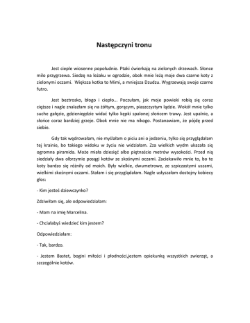 Następczyni tronu Jest cieple wiosenne popołudnie. Ptaki ćwierkają na zielonych drzewach. Słonce milo przygrzewa. Siedzę na leżaku w ogrodzie, obok mnie leżą moje dwa czarne koty z zielonymi oczami. Większa kotka to Mimi, a mniejsza Dzudzu. Wygrzewają swoje czarne futro. Jest beztrosko, błogo i ciepło... Poczułam, jak moje powieki robią się coraz cięższe i nagle znalazłam się na żółtym, gorącym, piaszczystym lądzie. Wokół mnie tylko suche gałęzie, gdzieniegdzie widać tylko kępki spalonej słońcem trawy. Jest upalnie, a słońce coraz bardziej grzeje. Obok mnie nie ma nikogo. Postanawiam, że pójdę przed siebie. Gdy tak wędrowałam, nie myślałam o piciu ani o jedzeniu, tylko się przyglądałam tej krainie, bo takiego widoku w życiu nie widziałam. Zza wielkich wydm ukazała się ogromna piramida. Może miała dziesięć albo piętnaście metrów wysokości. Przed nią siedziały dwa olbrzymie posągi kotów ze skośnymi oczami. Zaciekawiło mnie to, bo te koty bardzo się różniły od moich. Były wielkie, dwumetrowe, ze szpiczastymi uszami, wielkimi skośnymi oczami. Stałam i się przyglądałam. Nagle usłyszałam dostojny kobiecy głos: - Kim jesteś dziewczynko? Zdziwiłam się, ale odpowiedziałam: - Mam na imię Marcelina. - Chciałabyś wiedzieć kim jestem? Odpowiedziałam: - Tak, bardzo. - Jestem Bastet, bogini miłości i płodności,jestem opiekunką wszystkich zwierząt, a szczególnie kotów. Ucieszyłam się, bo bardzo lubię koty i ich tajemniczą naturę i te zielone oczy. Miałam tyle pytań do bogini, ale jej głos umilkł. Zapytałam: - Co się stało, czemu do mnie nic nie mówisz? Pomyślałam sobie, że rozejrzę się po okolicy. Po jakimś czasie dotarłam do małych zabudowań. Te domki były dziwne. Jakby posklejane z błota albo z kamieni. Dziwne, bo nie było w nich ludzi. Jak się okazało, dzieci były w szkole, uczyły się hieroglifów, a dorośli uprawiali zboże. Wszystko bardzo się różniło od naszego kraju, ale było w tym miejscu coś wyjątkowego – nie czuło się ani pragnienia ani głodu. Wszyscy ludzie się czymś zajmowali. Mieli dziwne, czarne fryzury, prawie jednakowe. Kobiety nosiły białe prześcieradła upięte w sukienkę, a mężczyźni białe niby-spódniczki. Byłam też zdziwiona, jak zobaczyłam krowę z wielkimi rogami, która pracowała w polu. Zupełnie różniły się od naszych krów, bo były chude, białe i miały wielkie rogi. Mieszkańcy przy domach mieli psy, które były podobne do lisów. Co było najdziwniejsze, nikt nie zwracał na mnie uwagi, zupełnie jakbym była niewidzialna. To było bardzo dziwne uczucie. Czułam się jakbym oglądała film przyrodniczy w kinie. Nagle coś miłego otarło się o moją nogę. Spojrzałam w dół i zobaczyłam czarnego kota, zupełnie takiego samego jak moja Dzudzu. Ucieszyłam się, bo pomyślałam, że to ona. Wtedy kot odezwał się ludzkim głosem: - To ty jesteś Marcelina? Trochę się przestraszyłam mówiącego kota, ale odpowiedziałam: - Tak,a skąd wiesz, jak mam na imię ? - Bogini Bastet nam powiedziała. - To ten głos, który słyszałam w piramidzie? - Tak, dokładnie... Ten głos. - Czekaliśmy na ten dzień bardzo długo. Bastet mówiła, że pewnego dnia przybędzie biała dziewczynko o imieniu Marcelina, która przekaże wiadomość wszystkim europejskim kotom, że ich bogini Bastet czeka na nich na końcu ich kociego życia. A gdy już tam się znajdą, nie będą musiały łowić myszy. Jeden z nich będzie następcą tronu. Będzie to kot z zielonymi oczami, a na imię będzie miała Dzudzu. Jej siostra Mimi będzie jej prawą reka. Zdziwiłam się, bo przecież mówiła o moich dwóch pupilkach. To nieprawdopodobne, jaka przyszłość je czeka! Bardzo posmutniałam, bo mnie już przy nich nie będzie. Ale myśl o cudownej przyszłości moich kotów wynagrodziła mi smutek. Zapadł już zmrok. Byłam już bardzo zmęczona i śpiąca. Oparłam głowę o wiklinowy kosz i usnęłam. Gdy otwarłam oczy, zobaczyłam Dzudzu i Mimi, jak słodko sobie śpią. Pomyślałam: „Ale miałam sen! Przecież to niemożliwe, aby mój kot został następcą tronu!” Ale czasami sny spełniają, gdy się w nie bardzo wierzy... Marcelina Szybalska, kl. 4a