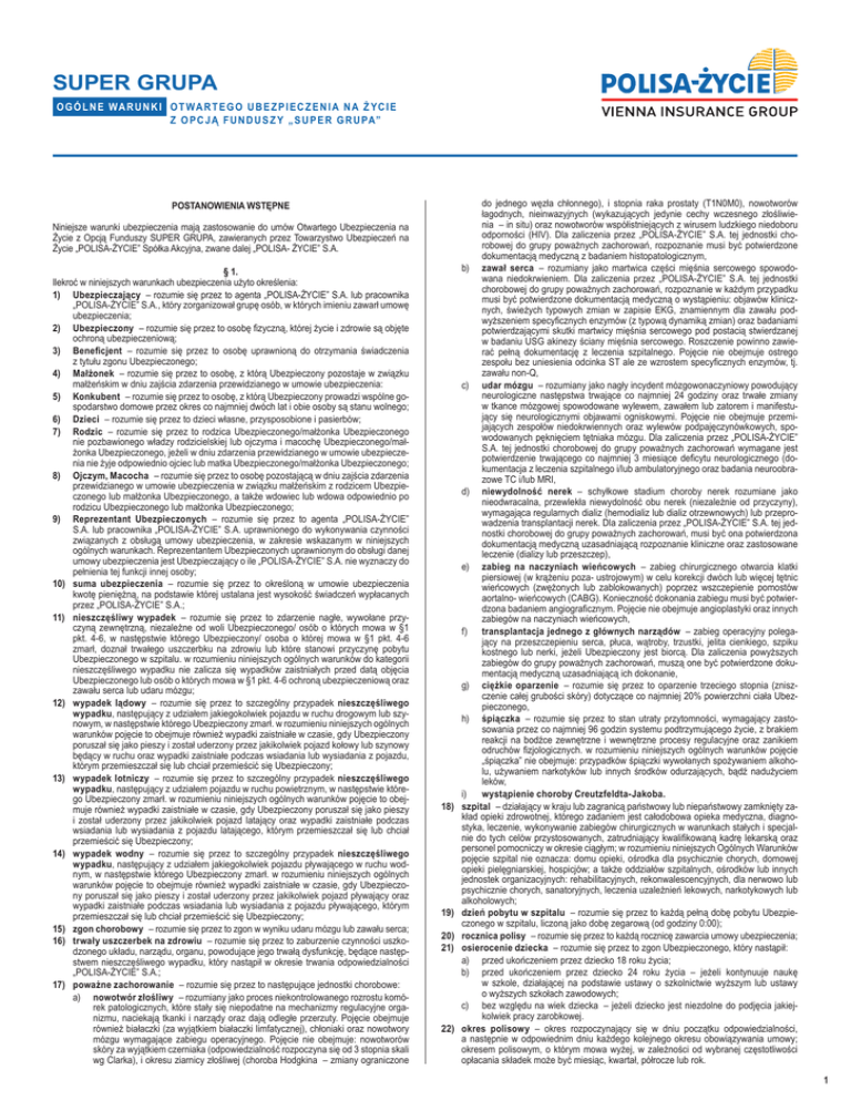 SUPER GRUPA O G Ó L N E WA R U N K I O T WA R T E G O U B E Z P I E C Z E N I A N A Ż YC I E Z O P C JĄ F U N D U S Z Y „ S U P E R G R U PA” POSTANOWIENIA WSTĘPNE Niniejsze warunki ubezpieczenia mają zastosowanie do umów Otwartego Ubezpieczenia na Życie z Opcją Funduszy SUPER GRUPA, zawieranych przez Towarzystwo Ubezpieczeń na Życie „POLISA-ŻYCIE” Spółka Akcyjna, zwane dalej „POLISA- ŻYCIE” S.A. § 1. Ilekroć w niniejszych warunkach ubezpieczenia użyto określenia: 1) Ubezpieczający – rozumie się przez to agenta „POLISA-ŻYCIE” S.A. lub pracownika „POLISA-ŻYCIE” S.A., który zorganizował grupę osób, w których imieniu zawarł umowę ubezpieczenia; 2) Ubezpieczony – rozumie się przez to osobę fizyczną, której życie i zdrowie są objęte ochroną ubezpieczeniową; 3) Beneficjent – rozumie się przez to osobę uprawnioną do otrzymania świadczenia z tytułu zgonu Ubezpieczonego; 4) Małżonek – rozumie się przez to osobę, z którą Ubezpieczony pozostaje w związku małżeńskim w dniu zajścia zdarzenia przewidzianego w umowie ubezpieczenia: 5) Konkubent – rozumie się przez to osobę, z którą Ubezpieczony prowadzi wspólne gospodarstwo domowe przez okres co najmniej dwóch lat i obie osoby są stanu wolnego; 6) Dzieci – rozumie się przez to dzieci własne, przysposobione i pasierbów; 7) Rodzic – rozumie się przez to rodzica Ubezpieczonego/małżonka Ubezpieczonego nie pozbawionego władzy rodzicielskiej lub ojczyma i macochę Ubezpieczonego/małżonka Ubezpieczonego, jeżeli w dniu zdarzenia przewidzianego w umowie ubezpieczenia nie żyje odpowiednio ojciec lub matka Ubezpieczonego/małżonka Ubezpieczonego; 8) Ojczym, Macocha – rozumie się przez to osobę pozostającą w dniu zajścia zdarzenia przewidzianego w umowie ubezpieczenia w związku małżeńskim z rodzicem Ubezpieczonego lub małżonka Ubezpieczonego, a także wdowiec lub wdowa odpowiednio po rodzicu Ubezpieczonego lub małżonka Ubezpieczonego; 9) Reprezentant Ubezpieczonych – rozumie się przez to agenta „POLISA-ŻYCIE” S.A. lub pracownika „POLISA-ŻYCIE” S.A. uprawnionego do wykonywania czynności związanych z obsługą umowy ubezpieczenia, w zakresie wskazanym w niniejszych ogólnych warunkach. Reprezentantem Ubezpieczonych uprawnionym do obsługi danej umowy ubezpieczenia jest Ubezpieczający o ile „POLISA-ŻYCIE” S.A. nie wyznaczy do pełnienia tej funkcji innej osoby; 10) suma ubezpieczenia – rozumie się przez to określoną w umowie ubezpieczenia kwotę pieniężną, na podstawie której ustalana jest wysokość świadczeń wypłacanych przez „POLISA-ŻYCIE” S.A.; 11) nieszczęśliwy wypadek – rozumie się przez to zdarzenie nagłe, wywołane przyczyną zewnętrzną, niezależne od woli Ubezpieczonego/ osób o których mowa w §1 pkt. 4-6, w następstwie którego Ubezpieczony/ osoba o której mowa w §1 pkt. 4-6 zmarł, doznał trwałego uszczerbku na zdrowiu lub które stanowi przyczynę pobytu Ubezpieczonego w szpitalu. w rozumieniu niniejszych ogólnych warunków do kategorii nieszczęśliwego wypadku nie zalicza się wypadków zaistniałych przed datą objęcia Ubezpieczonego lub osób o których mowa w §1 pkt. 4-6 ochroną ubezpieczeniową oraz zawału serca lub udaru mózgu; 12) wypadek lądowy – rozumie się przez to szczególny przypadek nieszczęśliwego wypadku, następujący z udziałem jakiegokolwiek pojazdu w ruchu drogowym lub szynowym, w następstwie którego Ubezpieczony zmarł. w rozumieniu niniejszych ogólnych warunków pojęcie to obejmuje również wypadki zaistniałe w czasie, gdy Ubezpieczony poruszał się jako pieszy i został uderzony przez jakikolwiek pojazd kołowy lub szynowy będący w ruchu oraz wypadki zaistniałe podczas wsiadania lub wysiadania z pojazdu, którym przemieszczał się lub chciał przemieścić się Ubezpieczony; 13) wypadek lotniczy – rozumie się przez to szczególny przypadek nieszczęśliwego wypadku, następujący z udziałem pojazdu w ruchu powietrznym, w następstwie którego Ubezpieczony zmarł. w rozumieniu niniejszych ogólnych warunków pojęcie to obejmuje również wypadki zaistniałe w czasie, gdy Ubezpieczony poruszał się jako pieszy i został uderzony przez jakikolwiek pojazd latający oraz wypadki zaistniałe podczas wsiadania lub wysiadania z pojazdu latającego, którym przemieszczał się lub chciał przemieścić się Ubezpieczony; 14) wypadek wodny – rozumie się przez to szczególny przypadek nieszczęśliwego wypadku, następujący z udziałem jakiegokolwiek pojazdu pływającego w ruchu wodnym, w następstwie którego Ubezpieczony zmarł. w rozumieniu niniejszych ogólnych warunków pojęcie to obejmuje również wypadki zaistniałe w czasie, gdy Ubezpieczony poruszał się jako pieszy i został uderzony przez jakikolwiek pojazd pływający oraz wypadki zaistniałe podczas wsiadania lub wysiadania z pojazdu pływającego, którym przemieszczał się lub chciał przemieścić się Ubezpieczony; 15) zgon chorobowy – rozumie się przez to zgon w wyniku udaru mózgu lub zawału serca; 16) trwały uszczerbek na zdrowiu – rozumie się przez to zaburzenie czynności uszkodzonego układu, narządu, organu, powodujące jego trwałą dysfunkcję, będące następstwem nieszczęśliwego wypadku, który nastąpił w okresie trwania odpowiedzialności „POLISA-ŻYCIE” S.A.; 17) poważne zachorowanie – rozumie się przez to następujące jednostki chorobowe: a) nowotwór złośliwy – rozumiany jako proces niekontrolowanego rozrostu komórek patologicznych, które stały się niepodatne na mechanizmy regulacyjne organizmu, naciekają tkanki i narządy oraz dają odległe przerzuty. Pojęcie obejmuje również białaczki (za wyjątkiem białaczki limfatycznej), chłoniaki oraz nowotwory mózgu wymagające zabiegu operacyjnego. Pojęcie nie obejmuje: nowotworów skóry za wyjątkiem czerniaka (odpowiedzialność rozpoczyna się od 3 stopnia skali wg