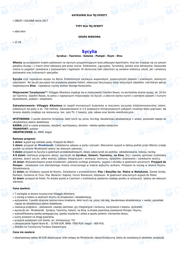 KATEGORIE DLA TEJ OFERTY ● OBOZY i KOLONIE letnie 2017 TYPY DLA TEJ OFERTY ● obóz letni GRUPA WIEKOWA ● 12-18 Sycylia Syrakuz - Taormina - Katania - Pompei - Rzym - Etna Włochy są europejskim krajem położonym na słynnym przypominającym buta półwyspie Apenińskim. Kraj ten znajduje się na samym południu Europy i z trzech stron oblewany jest przez morza: Śródziemne, Liguryjskie, Tyrreńskie, Jońskie oraz Adriatyckie. Doskonale można tu pogodzić zwiedzanie z plażowaniem i kąpielami. W słonecznej Italii zakochani są zarówno miłośnicy sztuki, jak i amatorzy plażowania oraz kulinarnych specjałów. Sycylia czyli największa wyspa na Morzu Śródziemnym zachwyca wspaniałymi, piaszczystymi plażami i urokliwymi, skalistymi zatoczkami. Na Sycylii poczujesz też prawdziwy powiew historii, zobaczysz fascynujący świat antycznych zabytków, nad którym góruje majestatyczna Etna – największy czynny wulkan Starego Kontynentu. Miejscowość Turystyczna*** Villaggio Alkantara znajduje się w miejscowości Giardini Naxos, na wschodniej stronie wyspy, ok. 10 km od Taorminy. Giardini Naxos, to jedna z najstarszych miejscowości na Sycylii, a obecnie słynny kurort z szerokimi plażami i licznymi dyskotekami, pubami i sklepikami. Zakwaterowanie: Villaggio Alkantara to zespół murowanych budynków w otoczeniu soczystej śródziemnomorskiej zieleni, oddalonych od plaży o ok. 750 metrów. Zakwaterowanie w 3-4 osobowych klimatyzowanych pokojach (możliwe łóżka piętrowe). Na terenie obiektu znajduje się restauracja, bar, sala TV, 2 baseny, plac zabaw oraz boisko wielofunkcyjne. WYŻYWIENIE: 3 posiłki dziennie (śniadanie, lekki lunch np. pizza, hot-dog, dwudaniowa obiadokolacja + woda), pozostałe napoje do obiadokolacji płatne dodatkowo KADRA: pilot w czasie przejazdu, rezydent, wychowawcy, doraźna - włoska opieka medyczna TRANSPORT: autokar UBEZPIECZENIE: KL, NNW, bagaż Ramowy program: 1 dzień: wyjazd wg rozkładu jazdy. Przejazd do Włoch. 2 dzień: przyjazd do Mirabilandii. Całodzienna zabawa w parku rozrywki. Wieczorem wyjazd w dalszą podróż przez Włochy (ciepły posiłek na terenie Mirabilandii płatny we własnym zakresie), 3 dzień: przyjazd na Sycylię w godzinach przedpołudniowych, obiad, odpoczynek po podróży, zakwaterowanie, kolacja, nocleg. 4-9 dzień: realizacja programu obozu: wycieczki do Syrakuz, Katanii, Taorminy, na Etnę. Gry i zawody sportowe (siatkówka plażowa, beach soccer, piłka wodna), zabawy integracyjne i animacje, konkursy, dyskoteki; plażowanie i zwiedzanie okolicy. 10 dzień: Wykwaterowanie przed śniadaniem, pobranie suchego prowiantu, wyjazd z ośrodka w godzinach porannych. Przyjazd do Pompei - zwiedzanie ruin starożytnego miasta zniszczonego w trakcie wybuchu wulkanu. Przejazd na nocleg w okolice Rzymu. Obiadokolacja. 11 dzień: po śniadaniu wyjazd do Rzymu. Zwiedzanie z przewodnikiem: Plac i Bazylika św. Piotra w Watykanie, Zamek Anioła, Panteon, Fontanna di Trevi, Plac Wenecki i Kapitol, Forum Romanum, Koloseum. W godzinach wieczornych wyjazd do Polski. 12 dzień: przejazd do Polski. Po drodze postój w Czechach z możliwością zjedzenia ciepłego posiłku w restauracji (płatny we własnym zakresie). Cena zawiera: ● ● ● ● ● ● ● ● ● ● 7 noclegów w wiosce turystycznej Villaggio Alkantara, 1 nocleg w hotelu w okolicach Rzymu ze śniadaniem i obiadokolacją, wyżywienie: 3 posiłki dziennie (wzmocnione śniadanie, lekki lunch np. pizza, hot-dog, dwudaniowa obiadokolacja + woda), pozostałe napoje do obiadokolacji płatne dodatkowo, realizacja programu – plażowanie, zawody sportowe, gry integracyjne i konkursy, korzystanie z basenu, dyskoteki, wycieczki do: Mirabilandii, Syrakuz, Taorminy, Katanii, na Etnę, w drodze powrotnej zwiedzanie Pompei i Rzymu, wykwalifikowaną opiekę pedagogiczną, opiekę rezydenta i pilota w języku polskim, kierownika obozu, suchy prowiant na drogę powrotną, przejazd autokarem LUX (barek, wc, klimatyzacja, TV) ubezpieczenie Signal Iduna KL - 10 000 EUR, NNW -7000 PLN i bagaż – 800 PLN, Składka na Turystyczny Fundusz Gwarancyjny Cena nie zawiera: ● obowiązkowej opłaty 60 EUR obejmującej: bilet wstępu do Mirabilandii, taksę klimatyczną, bilety do zwiedzanych obiektów, przejazdy ● ● środkami komunikacji miejskiej, przewodnika w Rzymie, przewodnika w Pompejach świadczeń nie wymienionych w ofercie, napoi do obiadokolacji (oprócz wody). WAŻNE INFORMACJE: ● ● ● ● ● ● ● ● ● prosimy o zabranie karty kolonijno - obozowej z nr PESEL, dowodu osobistego lub paszportu, ponadto odpowiedniej odzieży i obuwia (obuwie sportowe i obuwie do wędrówek górskich), kostiumu kąpielowego, klapek, nakrycia głowy, kremu z filtrem do opalania, okularów przeciwsłonecznych, przyborów higienicznych, dwóch ręczników, małego plecaka, bagaż prosimy zapakować do miękkich toreb - wykluczone twarde walizy. Ilość bagażu ograniczona! (bagaż podręczny i jedna torba). Duże, twarde walizy zajmują przestrzeń w pokojach. prosimy o zaopatrzenie uczestników w podstawowe leki (przeziębienie, ból gardła, uczulenia, środki na oparzenia słoneczne) oraz leki które dziecko zażywa prosimy o zabranie karty EKUZ (EUROPEJSKIEJ KARTY UBEZPIECZENIA ZDROWOTNEGO - dostępnych w oddziałach wojewódzkich NFZ) podane miejsca zbiórek i wyjazdów zależeć będą od ilości chętnych oraz sprzedaży na poszczególnych turnusach, podane zostaną na stronie www.turystyka.edu.pl na 72h przed wyjazdem. Prosimy o kontakt z biurem, celem potwierdzenia dokładnego miejsca i godziny na 2 dni przed wyjazdem na trasach krajowych dojazdowych (tzw. antenkach) istnieje możliwość przejazdu mikrobusem lub samochodem osobowym oraz możliwość związanych z tym ewentualnych przesiadek. Biuro zastrzega sobie możliwość odwołania bez żadnych konsekwencji transportu z danej miejscowości w przypadku zbyt małej ilości uczestników (min. 6 osób) zbiórka uczestnik