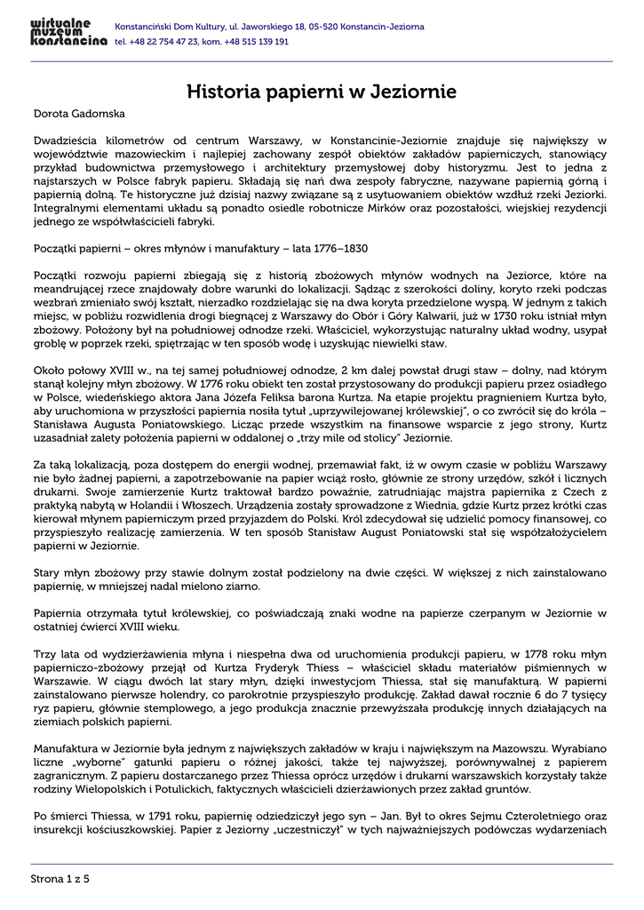 Konstanciński Dom Kultury, ul. Jaworskiego 18, 05-520 Konstancin-Jeziorna tel. +48 22 754 47 23, kom. +48 515 139 191 Historia papierni w Jeziornie Dorota Gadomska Dwadzieścia kilometrów od centrum Warszawy, w Konstancinie-Jeziornie znajduje się największy w województwie mazowieckim i najlepiej zachowany zespół obiektów zakładów papierniczych, stanowiący przykład budownictwa przemysłowego i architektury przemysłowej doby historyzmu. Jest to jedna z najstarszych w Polsce fabryk papieru. Składają się nań dwa zespoły fabryczne, nazywane papiernią górną i papiernią dolną. Te historyczne już dzisiaj nazwy związane są z usytuowaniem obiektów wzdłuż rzeki Jeziorki. Integralnymi elementami układu są ponadto osiedle robotnicze Mirków oraz pozostałości, wiejskiej rezydencji jednego ze współwłaścicieli fabryki. Początki papierni – okres młynów i manufaktury – lata 1776–1830 Początki rozwoju papierni zbiegają się z historią zbożowych młynów wodnych na Jeziorce, które na meandrującej rzece znajdowały dobre warunki do lokalizacji. Sądząc z szerokości doliny, koryto rzeki podczas wezbrań zmieniało swój kształt, nierzadko rozdzielając się na dwa koryta przedzielone wyspą. W jednym z takich miejsc, w pobliżu rozwidlenia drogi biegnącej z Warszawy do Obór i Góry Kalwarii, już w 1730 roku istniał młyn zbożowy. Położony był na południowej odnodze rzeki. Właściciel, wykorzystując naturalny układ wodny, usypał groblę w poprzek rzeki, spiętrzając w ten sposób wodę i uzyskując niewielki staw. Około połowy XVIII w., na tej samej południowej odnodze, 2 km dalej powstał drugi staw – dolny, nad którym stanął kolejny młyn zbożowy. W 1776 roku obiekt ten został przystosowany do produkcji papieru przez osiadłego w Polsce, wiedeńskiego aktora Jana Józefa Feliksa barona Kurtza. Na etapie projektu pragnieniem Kurtza było, aby uruchomiona w przyszłości papiernia nosiła tytuł „uprzywilejowanej królewskiej”, o co zwrócił się do króla – Stanisława Augusta Poniatowskiego. Licząc przede wszystkim na finansowe wsparcie z jego strony, Kurtz uzasadniał zalety położenia papierni w oddalonej o „trzy mile od stolicy” Jeziornie. Za taką lokalizacją, poza dostępem do energii wodnej, przemawiał fakt, iż w owym czasie w pobliżu Warszawy nie było żadnej papierni, a zapotrzebowanie na papier wciąż rosło, głównie ze strony urzędów, szkół i licznych drukarni. Swoje zamierzenie Kurtz traktował bardzo poważnie, zatrudniając majstra papiernika z Czech z praktyką nabytą w Holandii i Włoszech. Urządzenia zostały sprowadzone z Wiednia, gdzie Kurtz przez krótki czas kierował młynem papierniczym przed przyjazdem do Polski. Król zdecydował się udzielić pomocy finansowej, co przyspieszyło realizację zamierzenia. W ten sposób Stanisław August Poniatowski stał się współzałożycielem papierni w Jeziornie. Stary młyn zbożowy przy stawie dolnym został podzielony na dwie części. W większej z nich zainstalowano papiernię, w mniejszej nadal mielono ziarno. Papiernia otrzymała tytuł królewskiej, co poświadczają znaki wodne na papierze czerpanym w Jeziornie w ostatniej ćwierci XVIII wieku. Trzy lata od wydzierżawienia młyna i niespełna dwa od uruchomienia produkcji papieru, w 1778 roku młyn papierniczo-zbożowy przejął od Kurtza Fryderyk Thiess – właściciel składu materiałów piśmiennych w Warszawie. W ciągu dwóch lat stary młyn, dzięki inwestycjom Thiessa, stał się manufakturą. W papierni zainstalowano pierwsze holendry, co parokrotnie przyspieszyło produkcję. Zakład dawał rocznie 6 do 7 tysięcy ryz papieru, głównie stemplowego, a jego produkcja znacznie przewyższała produkcję innych działających na ziemiach polskich papierni. Manufaktura w Jeziornie była jednym z największych zakładów w kraju i największym na Mazowszu. Wyrabiano liczne „wyborne” gatunki papieru o różnej jakości, także tej najwyższej, porównywalnej z papierem zagranicznym. Z papieru dostarczanego przez Thiessa oprócz urzędów i drukarni warszawskich korzystały także rodziny Wielopolskich i Potulickich, faktycznych właścicieli dzierżawionych przez zakład gruntów. Po śmierci Thiessa, w 1791 roku, papiernię odziedziczył jego syn – Jan. Był to okres Sejmu Czteroletniego oraz insurekcji kościuszkowskiej. Papier z Jeziorny „uczestniczył” w tych najważniejszych podówczas wydarzeniach Strona 1 z 5 Konstanciński Dom Kultury, ul. Jaworskiego 18, 05-520 Konstancin-Jeziorna tel. +48 22 754 47 23, kom. +48 515 139 191 historii Polski – pisano na nim w czasie Sejmu Czteroletniego, utrwalił treść Konstytucji 3-go Maja. Na tym papierze rząd powstańczy emitował „bilety skarbowe”, pierwsze polskie pieniądze papierowe. Wraz z trzecim rozbiorem Polski w 1795 roku nadeszły dla papierni ciężkie czasy. Warszawa przestała być stolicą kraju i znalazła się w granicach zaboru pruskiego. Rząd pruski nie przyznał Jeziornie przywileju produkcji papieru stemplowego, a silną konkurencją stały się papiernie pomorskie i mazurskie. Jan Thiess z powodu zmniejszenia się popytu na papier znalazł się w trudnościach finansowych, które pogłębił w 1804 pożar papierni. Właściciel nie miał pieniędzy na odbudowę i zakład został zamknięty. W 1811 r., już za czasów Księstwa Warszawskiego i poprawy koniunktury na sprzedaż papieru, prawa do wieczystej dzierżawy nabył szwagier Jana Thiessa – Samuel Bruschke, wkrótce mianowany nadwornym dostawcą Księcia Księstwa Warszawskiego Fryderyka Augusta Wettyna. W 1812 r. odbudowany zakład w Jeziornie uzyskał tytuł Fabryki Królewskiej Papieru. Bruschke planował manufakturę unowocześnić i rozbudować. Prawdopodobnie ilość energii dostarczanej z dolnego stawu nie wystarczała na potrzeby rozrastającego się zakładu. Stanęło to u podstaw – niestety wówczas niezrealizowanej – idei