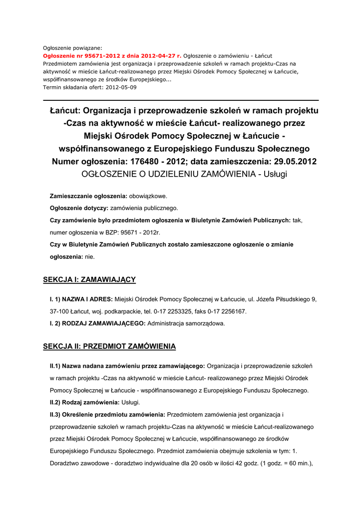 Ogłoszenie powiązane: Ogłoszenie nr 95671-2012 z dnia 2012-04-27 r. Ogłoszenie o zamówieniu - Łańcut Przedmiotem zamówienia jest organizacja i przeprowadzenie szkoleń w ramach projektu-Czas na aktywność w mieście Łańcut-realizowanego przez Miejski Ośrodek Pomocy Społecznej w Łańcucie, współfinansowanego ze środków Europejskiego... Termin składania ofert: 2012-05-09 Łańcut: Organizacja i przeprowadzenie szkoleń w ramach projektu -Czas na aktywność w mieście Łańcut- realizowanego przez Miejski Ośrodek Pomocy Społecznej w Łańcucie współfinansowanego z Europejskiego Funduszu Społecznego Numer ogłoszenia: 176480 - 2012; data zamieszczenia: 29.05.2012 OGŁOSZENIE O UDZIELENIU ZAMÓWIENIA - Usługi Zamieszczanie ogłoszenia: obowiązkowe. Ogłoszenie dotyczy: zamówienia publicznego. Czy zamówienie było przedmiotem ogłoszenia w Biuletynie Zamówień Publicznych: tak, numer ogłoszenia w BZP: 95671 - 2012r. Czy w Biuletynie Zamówień Publicznych zostało zamieszczone ogłoszenie o zmianie ogłoszenia: nie. SEKCJA I: ZAMAWIAJĄCY I. 1) NAZWA I ADRES: Miejski Ośrodek Pomocy Społecznej w Łańcucie, ul. Józefa Piłsudskiego 9, 37-100 Łańcut, woj. podkarpackie, tel. 0-17 2253325, faks 0-17 2256167. I. 2) RODZAJ ZAMAWIAJĄCEGO: Administracja samorządowa. SEKCJA II: PRZEDMIOT ZAMÓWIENIA II.1) Nazwa nadana zamówieniu przez zamawiającego: Organizacja i przeprowadzenie szkoleń w ramach projektu -Czas na aktywność w mieście Łańcut- realizowanego przez Miejski Ośrodek Pomocy Społecznej w Łańcucie - współfinansowanego z Europejskiego Funduszu Społecznego. II.2) Rodzaj zamówienia: Usługi. II.3) Określenie przedmiotu zamówienia: Przedmiotem zamówienia jest organizacja i przeprowadzenie szkoleń w ramach projektu-Czas na aktywność w mieście Łańcut-realizowanego przez Miejski Ośrodek Pomocy Społecznej w Łańcucie, współfinansowanego ze środków Europejskiego Funduszu Społecznego. Przedmiot zamówienia obejmuje szkolenia w tym: 1. Doradztwo zawodowe - doradztwo indywidualne dla 20 osób w ilości 42 godz. (1 godz. = 60 min.), tj. 2 godziny na osobę oraz dodatkowo 2 godz. do konsultacji - łącznie 42 godz. Miejsce szkolenia: miasto Łańcut. Indywidualne konsultacje, w tym diagnoza możliwości zawodowych: rozpoznanie potencjału zawodowego, urealnienie samooceny i rozwiniecie wglądu we własne możliwości, rozpoznanie indywidualnych obszarów trudności, kwalifikacje zawodowe wymagane na konkretnych stanowiskach pracy, utwierdzenie podjętej decyzji przez uczestnika projektu, dotyczącej ścieżki szkoleń zawodowych oraz przyszłej pracy, opracowanie indywidualnego planu działania, analiza potrzeb klienta, samodzielne opracowanie przez uczestnika projektu aplikacji zawodowych tematyka dostosowana do indywidualnych potrzeb uczestników zależeć będzie od ich oczekiwań, poziomu wiedzy i umiejętności, doradztwa. Termin: do 10 dni od podpisania umowy. 2. Trening kompetencji i umiejętności społecznych Miejsce szkolenia: miasto Łańcut. Liczba uczestników: 20 osób Ilość godzin: 2 grupy po 80 godz. dydaktycznych, tj. razem 160 godz. dydaktycznych. Zajęcia mają być prowadzone przez trenera dla 2 grup. Zajęcia dla drugiej grupy rozpoczynają się tydzień później od zajęć pierwszej grupy. Instrument ten obejmuje m. in. komunikację interpersonalną i perswazję, zarządzanie sobą w czasie, zarządzanie stresem, asertywność, trening rozwiązywania problemów w trudnych sytuacjach międzyludzkich, trening budżetowy, trening umiejętności społecznych - przygotowanie do podjęcia pracy, podejmowanie decyzji i przewidywanie konsekwencji, siła pozytywnego myślenia. Termin realizacji: rozpoczęcie - po zakończeniu doradztwa zawodowego przez daną grupę; 3. Poradnictwo specjalistyczne: 1) wsparcie specjalistyczne grupowe a) 2 spotkania tematyczne, każde po 2 godziny dydaktyczne - tj. razem 4 godziny dydaktyczne, połączone z prezentacjami, które poprowadzą specjaliści np. z zakresu medycyny, promocji zdrowia i zdrowego trybu życia, uzależnień , interwencji kryzysowych, mediacji rodzinnych b) Poradnictwo i wsparcie na temat zakładania i prowadzenia działalności gospodarczej i spółdzielni socjalnych - 8 godz. dydaktycznych Liczba uczestników: 20 osób Termin realizacji: czerwiec/lipiec 2012r Miejsce szkolenia: miasto Łańcut. 2) indywidualne poradnictwo specjalistyczne (w tym indywidualne diagnozy/informacje/oceny z wykazaniem mocnych i słabych stron uczestnika projektu - opracowane przez osobę prowadzącą) np. z zakresu: a) poradnictwa psychologicznego - dla osobistej pracy nad zmianą przy jednoczesnym wsparciu specjalisty dla 20 osób w ilości 1 godz. (60 min.) na 1 osobę = 20 godz. łącznie. Termin: czerwiec-lipiec 2012 b) poradnictwa prawnego - 5 godz. (1 godz. = 60 min). Termin: czerwiec -lipiec 2012 c) interwencji kryzysowej - 2 godz./1osoba (1 godz. = 60 min), tj. łącznie 6 godz. Termin: czerwiec -lipiec 2012 d) psychopedagogicznej pomocy rodzinie - 2 godz./rodzina (1 godz. = 60 min), tj. łącznie 8 godz. Termin: czerwiec -lipiec 2012 e) profilaktyki kryzysów życiowych - 2 godz./1osoba, tj. łącznie 24 godz. (1 godz. = 60 min) Termin: czerwiec -lipiec 2012 f) wspomagania funkcji wychowawczej rodziny (stymulowanie osobistego potencjału w radzeniu sobie w życiu, wzbudzanie motywacji do zmiany, przezwyciężanie schematów poznawczych, itp.) - 4 godz./1 osoba, łącznie 40 godz. (1 godz. = 60 min) Termin czerwiec-lipiec 2012 g) Terapia psychologiczna krótkoterminowa, rodzinna lub psychospołeczna dla rodzin lub osób - np. konsultacja rodzinna (łącznie 72 godz. - 1 godz.=60 min; ) Termin: lipiec - sierpień 2012 Liczba osób biorących udział w poradnictwie indywidualnym wymienionym w punktach od lit. b) -do g) będzie wynikać z rozeznanych potrzeb wynikających z problemów wyłonionych przez psychologa/trenera/doradcę po przeprowadzeniu wcześniejszych działań(zakłada s