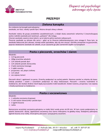 PRZEPISY Zielona kanapka Do zrobienia tej kanapki potrzebujemy : awokado, ser kozi, rukolę i pestki dyni. Można skropić oliwą z oliwek. Awokado należy do grupy produktów zasadotwórczych, a dzięki dużej zawartości witaminy E (neutralizującej wolne rodniki) awokado jest świetnym „paliwem” dla mózgu. Chociaż awokado zawiera dużo kalorii, są to kalorie pełne wartości odżywczych. Tłuszcze awokado są zdrowe dla serca – gdyż są to tłuszcze jednonienasycone oraz omega-3. Poza tym, że awokado faktycznie jest zdrowe, istnieje wiele sposobów, aby się nim cieszyć. Od kilku przepisów na guacamole, poprzez dodawanie awokado do sałatek, aż po używanie go jako zamiennik wędlin na kanapkach Pasta z pieczarek, orzechów i ziaren Składniki: • 1/2 kg pieczarek • 200g orzechów włoskich • 1/4 szklanki pestek dyni • 1/4 szklanki pestek słonecznika • 3 łyżki siemienia lnianego • 2 ząbki czosnku • przyprawy- sól, pieprz ziołowy • 1/2 cebuli • sos sojowy tamari Pieczarki obrać i ugotować na parze. Orzechy podprażyć na suchej patelni. Nasiona zemleć w młynku do kawy. Cebulę posiekać i razem z czosnkiem podprażyć na oleju kokosowym. Pieczarki i orzechy rozdrobnić w malakserze, ale niezbyt drobno-niech będą wyczuwalne małe kawałeczki. Dodać nasiona, przyprawy i sos sojowy i chwilę wymieszać w malakserze. Pasta z soczewicowa Składniki: • 1 szklanka soczewicy brązowej • ½ szkl nasion słonecznika i pestek dyni • 2 ogórki kiszone • natka Namoczona wcześniej soczewicę gotujemy w małej ilości wody przez ok.30 min. W tym czasie podprażamy na patelni słonecznik i dynię. Ugotowana soczewicę oraz ziarna miksujemy na gładką masę. Dodajemy pokrojony ogórek kiszony oraz natkę. Smarujemy pieczywo i posypujemy sezamem. PRZEPISY Buraczane carpaccio Składniki: • 3 średnie buraki • ⅓ szklanki octu balsamicznego i 2 łyżeczki oliwy z oliwek • świeżo mielony pieprz • 100 gr sera feta • 3 łyżki prażonych pestek dyni Buraki gotujemy ze skórką lub pieczemy godzinę w 180 stopniach. Pozostawiamy do ostudzenia. Gdy całkiem ostygną, kroimy je w cienkie plasterki i układamy na dużych talerzach tak, by plasterki zachodziły na siebie. Ocet balsamiczny wlewamy do małego rondelka, doprowadzamy do wrzenia, zmniejszamy ogień i gotujemy, aż mniej więcej połowa płynu odparuje i ocet zagęści się do konsystencji rzadkiego syropu. Plastry buraka skrapiamy syropem balsamicznym i oliwą, posypujemy świeżo mielonym pieprzem, przykrywamy i odstawiamy do lodówki na co najmniej pół godziny. Przed podaniem carpaccio posypujemy pokruszonym serem i prażonymi pestkami dyni. Zupa z pieczarek, selera naciowego z komosą ryżową Składniki na 4 porcje: • 2 łyżki oliwy • 2 łyżki mąki orkiszowej • sól, pieprz • 1 por • 2 marchewki • 2 łodygi selera naciowego • 1 litr bulionu • 500g grzybów ( pieczarek lub boczniaków) • 80 g komosy ryżowej (quinoa) Masło rozpuścić i dodać mąkę, rozbijając grudy. Dodajemy szczyptę soli i pieprzu. Gdy zasmażka zbrązowieje lekko i będzie gotowa, dodaj pokrojone drobno warzywa. Zalej bulionem i dodaj posiekane grzyby. Gotuj ok 10 min, po czym dodaj komosę. Gotuj ok 30 min, dopraw wedle gustu i gotowe. PRZEPISY Potrawka dyniowo-kalafiorowa Składniki: • 500g dyni pokrojonej w kostkę • 1 mały kalafior • 2 szklanki ugotowanej ciecierzycy • 2 szklanki pokrojonych pomidorów • 1 cebula, czosnek, 1 łyżka kurkumy, 1łyżka tymianku, 1 łyżka kolendry, 1/2 łyżki gałki muszkatołowej • sól, oliwa Na oliwie smażymy cebulę i czosnek, po chwili dodajemy kalafiora i dynię, pomidory, doprawiamy, zalewamy litrem bulionu i dusimy na małym ogniu, aż zmiękną. Na koniec dodajemy ciecierzycę. Można posypać natką. Smacznego! Kotleciki z kaszy i ziaren Składniki: • 200g kaszy jaglanej • 2 duże marchewki • 100g słonecznika • 100g sezamu • przyprawy: kurkuma, kolendra, kminek, tymianek, sól, pieprz kolorowy • 1/2 pęczka natki • 1/4 szklanki oleju nierafinowanego Kaszę gotujemy, marchewkę ścieramy na tarce o dużych oczkach. Nasiona delikatnie prażymy na suchej patelni. Dodajemy olej , natkę i przyprawy. Wszystkie składniki łączymy i ugniatamy w rękach do uzyskania klejącej masy. Formujemy kotleciki i pieczemy ok. 25min w temp 200C. Na Zdrowie! Nerkowce otulone cukinią Składniki: • 2 małe cukinie • 200g orzechów nerkowca • 1/3 szklanki mleka migdałowego • sok z połówki cytryny • 2 łyżki sosu sojowego tamari • oliwa z oliwek • przyprawy: sól, pieprz ziołowy, czosnek, zioła prowansalskie Cukinie pokroić na cienkie plastry wzdłuż, za pomocą obieraczki. Ułożyć na blasze do pieczenia, posmarować pędzelkiem maczanym w oliwie z oliwek (wymieszanej z solą). Włożyć do piekarnika na ok.10 min. Orzechy nerkowca włożyć do malaksera i zmiksować na proszek. Dodać mleko, sok z cytryny, sos sojowy i przyprawy, wyciśnięty ząbek czosnku. Paski cukinii smarować serkiem i zwijać w ruloniki. Posypać świeżo zmielonym pieprzem. Podajemy z musem pomidorowym z bazylią. PRZEPISY Krem dyniowy z paluchami sezamowymi Składniki: • 500g miąższu z dyni • 2 marchewki • 1 cebula • 2 ząbki czosnku • 750 ml bulionu warzywnego • 150 ml mleka kokosowego • 2 łyżeczki curry • szczypta kolendry, gałki muszkatołowej, kminu • masło • sól, pieprz Na oliwie i maśle zeszklić posiekaną cebulę i czosnek. Dodać dynię i marchewkę pokrojone w kostkę. Po kilku minutach dodać curry i przyprawy. Zalać bulionem. Gotować do momentu aż warzywa będą miękkie. Zmiksować dodając mleko kokosowe. Doprawić solą i pieprzem, posypać pestkami dyni. Paluchy sezamowe Składniki: • 1 szkl ciepłej wody • 2 łyżeczki suszonych drożdży • ½ łyżeczki miodu • 2 szkl mąki orkiszowej • 2 łyżki oliwy • sól • sezam Połączyć wodę z drożdżami i miodem i odstawić 