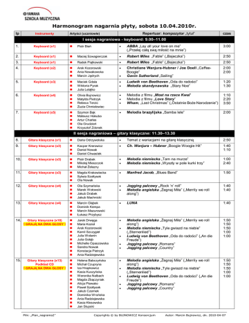 Harmonogram nagarnia płyty, sobota 10.04.2010r. lp Instrumenty Repertuar: kompozytor „tytuł” Artyści (uczniowie) czas I sesja nagraniowa - keyboard: 9.00–11.00 1. Keyboard (x1) n Piotr Bień · ABBA „Lay all your love on me” („Przelej całą swą miłość na mnie”) 3:00 2. Keyboard (x1) n Maciej Szwagierczak · Robert Miles „Fable” („Bajeczka”) 2:50 3. Keyboard (x1) n Radek Piątkowski · Robert Miles „Fable” („Bajeczka”) 2:50 4. Keyboard (x2) n n n Arek Kozorowski Ania Nowakowska Marcin Jędrych · 2:00 2:00 · Christiane Wanjura-Hubner / Joe Doell „CaffeeBoogie” Gavin Sutherland „Sailing” 5. Keyboard (x3) n n n Maciek Gdala Wiktoria Pyrak Julia Lelątko · · Ludwik von Beethoven „Oda do radości” Melodia skandynawska „Stary Noe” 1:20 1:30 6. Keyboard (x4) n n n n Olivia Bujnowicz Matylda Pietrzyk Rebeca Terzic Zuzia Chmielowiec · · · Melodia z filmu „Most na rzece Kwai” Melodia z filmu „Love Story” Wham, „Last Christmas” („Ostatnie Boże Narodzenie”) 1:10 2:20 3:50 7. Keyboard (x5) n n n n n Szymon Bąk Mateusz Hakuba Artur Charles Ola Grudzień Krzysztof Zdonek · Melodia brazylijska „Samba lele” 2:00 II sesja nagraniowa – gitary klasyczne: 11.30–13.30 8. Gitara klasyczna (x1) n Daria Odrzywolska · Temat z wariacjami na gitarę klasyczną 2:50 9. Gitary klasyczne (x3) n n n Kacper Krerowicz Daniel Nowak Daniel Chwastek · Ch. Wanjura – Hubner „Boogie Woogie Hit” 1:40 1:10 10. Gitary klasyczne (x3) n n n Piotr Drabek Mikołaj Mieszczok Michał Żelazny · · Melodia niemiecka „Tam na murze” Melodia niemiecka „Wyszły w pole kurki trzy” 1:00 2:40 11. Gitary klasyczne (x3) n n n Magda Krakowiecka Sylwia Szołtysek Ola Nowak · Manfred Jacob, „Blues Band” 1:50 12. Gitary klasyczne (x4) n n n n Ola Szymańska Marek Wołowski Jakub Drabek Jakub Machnicki · · Jogging palcowy „Rock ‘n’ roll” Melodia angielska „Żegnaj Miła” („Merrily we roll along”) 1:40 1:40 13. Gitary klasyczne (x4) n n n n Marcin Głąbek Dominik Kempa Marcin Mazurowski Łukasz Przybysz · LUNA 1:40 14. Gitary klasyczne (x10) ! GRAJĄ NA DWA GŁOSY ! n n n n n n n n n n Jarek Drwęga Maria Kozioł Arek Koziorowski Kamil Szczygieł Julia Wolanin Julia Gołąb Michelle Opaszowska Sandra Nowak Konstacja Pietrzyk Ania Radziejewska · Melodia angielska „Żegnaj Miła” („Merrily we roll along”) Melodia niemiecka „Tyle gwiazd na niebie” („Sternenlied”) Ludwig von Beethoven „Oda do radości” („An die Freude”) Jogging palcowy „Romans” Jogging palcowy „Country” 1:50 1:50 1:50 1:00 1:00 n n n n n n n n n n n n n Helena Babczyńska Michał Czupryna Iza Hrapkowicz Kasia Kuszyńska Weronika Nalbach Magda Zbączyniak Alicja Plewako Paweł Szołtysek Jakub Czernek Dominika Wrońska Ania Radziejewska Kasia Kłosowska Jan Słupski Melodia angielska „Żegnaj Miła” („Merrily we roll along”) Melodia niemiecka „Tyle gwiazd na niebie” („Sternenlied”) Ludwig von Beethoven „Oda do radości” („An die Freude”) Jogging palcowy „Romans” Jogging palcowy „Country” 1:50 1:50 1:50 1:00 1:00 15. Gitary klasyczne (x13) Podkład CD ! GRAJĄ NA DWA GŁOSY ! Plik: „Plan_nagrania2” · · · · · · · · · Copyrights © by BUJNOWICZ Konsorcjum Autor: Marcin Bujnowicz, dn. 2010-04-07 16. Gitara klasyczna (x7) n n n n n n n Głąbek M., D. Kempa, M. Mazurowski, Ł. Przybysz, M. Krakowiecka, S. Szołtysek, O. Nowak · Metallica „Nothing Else Matter” 5:00 III sesja nagraniowa – gitary elektryczne: 14.00–15.00 17. Gitary elektryczne (x3) Gitara basowa (x1) n n n n Dmitrzak Natalia Król Ola Filipowska Maura Maciej Wiśniewski · Metallica „Nothing Else Matter” 5:00 18. Gitara elektryczna (x1) n Damian Cieślak · Kings of Leon „Use somebody” („Kogoś wykorzystać) 4:00 19. Gitary elektryczne (x2) n n Karol Fujarski Damian Cieślak · Jan Sebastian Bach „Marsz Turecki” 2:00 20. Gitary elektryczne (x2) n n Krzysztof Wożniak Michał Żeromski · Lady Pank „Kryzysowa narzeczona” 4:00 21. Gitary elektryczne (x2) n n Katarzyna Zawisza Ines Łatacz · Jogging palcowy „Blues” 2:20 22. Gitary elektryczne (x2) n n Marcin Grzywacz, Mateusz Andryszczyk · The Who „I can’t explain” 2:00 23. Gitary elektryczne (x3) n n n Dmitrzak Natalia Król Ola Filipowska Maura · Lady Pank „Zawsze tam gdzie Ty” 4:00 IV sesja nagraniowa – zespoły muzyczne: 16.00–18.00 24. Gitary elektryczne (x3) Gitara basowa (x1) n n n n Sebastian Kurdziel Dominka Danielczyk Oskar Gryska Maciej Wiśniewski · Red Hot Chilli Peppers „The Otherside” 4:10 25. Gitary elektryczne (x4) Gitara basowa (x1) Keyboard (x1) n n n n Marcin Frackowiak Rafał Kochański Jakub Mizeracki gitara basowa: Wiśniewski Maciej Mateusz Okrajni keyboard: Szwagierczak Maciek · Scorpions „Wind of change” („Wiatr zmian”) 4:00 n n V sesja nagraniowa – wokale: 18.30–do skutku 26. Wokal (x2) n n Dominika Piotrowska Kaja Bodio · Piosenka „Kaczka Dziwaczka” z filmu Akademia Pana Kleksa 2:30 27. Wokal (x2) n n Zuzanna Rokita Ola Piętka · Piosenka „Na wyspach Bergamutach” z filmu Akademia Pana Kleksa 1:50 28. Wokal (x1) n Agata Stolorz · Budka Suflera „Takie tango” 4:10 29. Wokal (x1) n Mateusz Jakubiec · Varius Manx „Piosenka Księżycowa” 2:50 30. Wokal PMS (x2) n n Roksana Wilganowicz Inez Bodio · Lady Pank „Zawsze tam gdzie Ty” 4:00 31. Wokal PMS (x1) n Oskar Nowak · Metallica „Nothing Else Matter” 5:00 32. Wokal PMS (x1) n Mateusz Jakubiec · Lady Pank „Kryzysowa narzeczona” 4:00 33. Wokal PMS (x1) n Małgorzata Kujawska · Kings of Leon „Use somebody” („Kogoś wykorzystać) 4:00 34. Wokal PMS (x1) n Małgorzata Kujawska · The Who „I can’t explain” 2:00 35. Wokal PMS (x1) n Małgorzata Kujawska · Red Hot Chilli Peppers „The Otherside” 4:10 36. Wokal PMS (x1) n Kujawska Małgorzata · Scorpions „Wind of change” („Wiatr zmian”) 4:00 UW