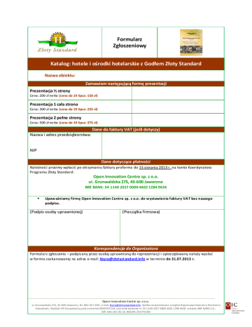 Formularz Zgłoszeniowy Katalog: hotele i ośrodki hotelarskie z Godłem Złoty Standard Nazwa obiektu: Zamawiam następującą formę prezentacji Prezentacja ½ strony Cena : 200 zł netto (cena do 19 lipca: 150 zł) Prezentacja 1 cała strona Cena : 300 zł netto (cena do 19 lipca: 225 zł) Prezentacja 2 pełne strony Cena : 500 zł netto (cena do 19 lipca: 375 zł) Dane do faktury VAT (jeśli dotyczy) Nazwa i adres przedsiębiorstwa: NIP Dane dotyczące płatności Należność prosimy wpłacić po otrzymaniu faktury proforma do 15 sierpnia 2013 r. na konto Koordynatora Programu Złoty Standard: Open Innovation Centre sp. z o.o. ul. Grunwaldzka 275, 43-600 Jaworzno BRE BANK: 34 1140 2017 0000 4602 1284 9626 Upow ażniamy firmę Open Innovation Centre sp. z o.o. do w ystawienia faktury VAT bez naszego podpisu. (Podpis osoby uprawnionej) (Pieczątka firmowa) Korespondencja do Organizatora Formularz zgłoszenia – podpisany przez osobę uprawnioną do reprezentacji i opieczętowany należy wysłać w formie zeskanowanej na adres e-mail: biuro@zlotyst andard.info w ter minie do 31.07.2013 r. Open Innovation Centre sp. z o.o. ul. Grunwaldzka 275, 43-600 Jaworzno, Tel. 883 357 209:, e-mai l: biuro@zlot ystandard.info. Spółka zarejestrowana w Sądzie R ejono wym Kato wic e-Wschód w Katowicach, Wydział VIII Gospodarczy, pod numerem 0000397524, rachunek bankowy n r 34 1140 2017 0000 4602 1284 9626 w banku BRE BANK S.A., NIP: 646-292-42-33, REGON: 242745340