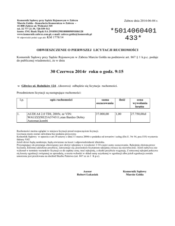 Komornik Sądowy przy Sądzie Rejonowym w Zabrzu Marcin Gołda - Kancelaria Komornicza w Zabrzu 41-800 Zabrze ul. Wolności 345 tel. 32 777 21 39, 728 559 512 konto: ING Bank Śląski SA 29105012981000009091004128 www.komornik-zabrze.com.pl, e-mail: [email protected] W odpowiedzi podać sygn.akt: KM Zabrze dnia 2014-06-04 r. *5014060401 433* 1778/14 OBWIESZCZENIE O PIERWSZEJ LICYTACJI RUCHOMOŚCI Komornik Sądowy przy Sądzie Rejonowym w Zabrzu Marcin Gołda na podstawie art. 867 § 1 k.p.c. podaje do publicznej wiadomości, że w dniu 30 Czerwca 2014r roku o godz. 9:15 w Gliwice ul. Rolników 124 , (dozorca) odbędzie się licytacja ruchomości. Przedmiotem licytacji są następujące ruchomości: l.p. 1. opis ruchomości suma oszacowania AUDI A4 2.0 TDI, 2005r, nr VIN: WAUZZZ8E25A574311,stan Bardzo Dobry Automat,kombi 37.000,00 ilość 1,00 cena wywołania brutto 27.750,00zł Ruchomości można oglądać w miejscu licytacji przed rozpoczęciem licytacji. Licytacja może zostać odwołana bez podania przyczyny. Komornik Sądowy w oparciu o art.18 ustawy z dnia 11 marca 2004r o podatku od towarów i usług (Dz.U. Nr 54, poz.535) wystawia faktury VAT. Jeżeli drzwi będą zamknięte, będą otwierane na koszt i odpowiedzialność dłużnika. Przystępujący do przetargu obowiązany jest złożyć rękojmię w wysokości 1/10 części sumy oszacowania. Rękojmię złożoną przez licytanta, któremu udzielono przybicia, zatrzymuje się; pozostałym licytantom rękojmię zwraca się niezwłocznie. Jeżeli nabywca nie wykonał w terminie warunków licytacji co do zapłaty ceny, traci rękojmię, a skutki przybicia wygasają. Z utraconej rękojmi pokrywa się koszty egzekucji związanej ze sprzedażą, a reszta wchodzi w skład sumy uzyskanej w egzekucji albo jeżeli egzekucja została umorzona jest przelewana na dochód Skarbu Państwa (art. 867 ze zn 1 K.p.c). Asesor Robert Łukasiak Komornik Sądowy Marcin Gołda