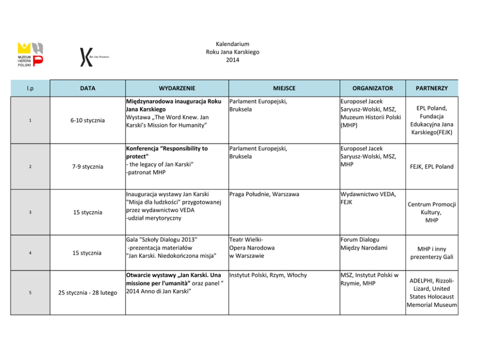 Kalendarium Roku Jana Karskiego 2014 l.p 1 2 3 4 5 DATA 6-10 stycznia 7-9 stycznia 15 stycznia 15 stycznia 25 stycznia - 28 lutego WYDARZENIE MIEJSCE ORGANIZATOR Międzynarodowa inauguracja Roku Jana Karskiego Wystawa „The Word Knew. Jan Karski’s Mission for Humanity" Parlament Europejski, Bruksela Europoseł Jacek Saryusz-Wolski, MSZ, Muzeum Historii Polski (MHP) Konferencja “Responsibility to protect" - the legacy of Jan Karski“ -patronat MHP Parlament Europejski, Bruksela Europoseł Jacek Saryusz-Wolski, MSZ, MHP Inauguracja wystawy Jan Karski "Misja dla ludzkości" przygotowanej przez wydawnictwo VEDA -udział merytoryczny Praga Południe, Warszawa Gala "Szkoły Dialogu 2013" -prezentacja materiałów "Jan Karski. Niedokończona misja" Teatr WielkiOpera Narodowa w Warszawie Otwarcie wystawy „Jan Karski. Una Instytut Polski, Rzym, Włochy missione per l'umanità” oraz panel ” 2014 Anno di Jan Karski” Wydawnictwo VEDA, FEJK Forum Dialogu Między Narodami MSZ, Instytut Polski w Rzymie, MHP PARTNERZY EPL Poland, Fundacja Edukacyjna Jana Karskiego(FEJK) FEJK, EPL Poland Centrum Promocji Kultury, MHP MHP i inny prezenterzy Gali ADELPHI, RizzoliLizard, United States Holocaust Memorial Museum 6 7 8 9 10 27 stycznia - 13 lutego 29 stycznia 7 lutego 20 lutego 21-23 lutego 11 28 lutego-15 marca 12 1-31 marca Otwarcie wystawy “LE MONDE SAVAIT – La mission de Jan Karski pour l’Humanité” Siedziba UNESCO, Paryż MSZ, Instytut Polski w Paryżu, Ambasada RP w Paryżu, Stałe Przedstawicielstwo RP przy UNESCO, MHP Projekcja filmu Martina Smitha o Janie Centralna Synagoga w Londynie Karskim “Messenger from Poland” MSZ, Ambasada RP w Londynie Gościnny wykład Profesora Luchi Bernardiniego o Janie Karskim -dostarczenie materiałów merytorycznych Centrum Polonicum UW, Warszawa Centrum Polonicum UW Promocja książki "Fotobiografia Jan Karski" -udział w panelu dyskusyjnym o Janie Karskim Muzeum Historii Żydów Polskich (MHŻP), Wydawnictwo VEDA, Warszawa FEJK Projekt "Pamięć dla Przyszłości" "Jan Karski- Sprawiedliwy wśród Narodów Świata" -udział merytoryczny w projekcie -wykład otwierający Sulejówek, ośrodek ORE Ośrodek Rozwoju Edukacji, MHP, Stowarzyszenie "Dzieci Holocaustu", MHŻP, Żydowski Instytut Żydowski (ŻIH) Otwarcie wystawy "Jan Karski. Człowiek wolności" Centrum Synagoga, Zamość Fundacja Ochrony Dziedzictwa Żydowskiego(FODŻ), MHP Wystawa o Janie Karskim w oparciu o materiały MHP i własne Pedagogiczna Biblioteka Wojewódzka(PBW) im. Marii Grzegorzewskiej w Zielonej Górze PBW w Zielonej Górze, MHP MHP MHP, MHŻP MHP 13 14 6 marca 6 marca 15 7-9 marca 16 10-21 marca 17 15 marca 18 16-30 marca Obchody Europejskiego Dnia Pamięci Dom Spotkań z Historią(DSH), Warszawa DSH o Sprawiedliwych Konferencja prasowa: upamiętnienie Jana Karskiego Warsztaty edukacyjne dla nauczycieli i uczniów -udział merytoryczny Udział w otwarciu wystawy "Z narażeniem życia -Polacy ratujący Żydów podczas Zagłady" oraz prezentacja pamiątek "Sprawiedliwych wśród Narodów Świata" Muzeum Historii Żydów Polskich, Warszawa VII Kongres Polskich Stowarzyszeń Studenckich/Polish Oxford Union Panel dyskusyjny „Why should we study Poland” - dostarczenie materiałów merytorycznych Budynek Oxford U., Wielka Brytania MHP MHŻP, DSH MHP FEJK, Ambasada RP w Londynie MHP Otwarcie wystawy „ La mission de Liceum Montaigne, Paryż, Francja Jan Karski pour l’Humanité” Warsztaty. Pakiet edukacyjny "Karski i MHP, Warszawa jego czasy" Instytut Polski w Paryżu, MHP MHP Otwarcie wystawy "Jan Karski. Człowiek wolności" MBP im. A. Próchnika, MHP Czytelnia dla Dorosłych Miejska Biblioteka Publiczna(MPB), Piotrków Trybunalski 19 20 21 22 26 marca MSZ, Instytut Polski w Berlinie, Fundacja Pomordowanych Żydów Europy, MHP Panel o Janie Karski na festiwalu Kino Sao Jorge, Lizbona, Portugalia filmów i kultury żydowskiej w Lizbonie Ambasada RP w Lizbonie, Lisbon Jewish Film and Cultural Festival, VEDA, FEJK 27-30 marca 29-30 marca 2 kwietnia 2-21 kwietnia 23 Panel poświęcony Janowi Karskiemu Budynek Stiftung Denkmal Berlin, i Witoldowi Pileckiemu z udziałem T. Niemcy Snydera i G. Gnaucka - udział merytoryczny Targi Kielce- Spotkanie miłośników Kielce historii, rekonstrukcji historycznych, militariów - prezentacja materiałów o Janie Karskim Targi Kielce Nadanie sztandaru szkole Gimnazjum Miejski Dom Kultury(MDK),Ruda Śląska nr 14. im. Prof.. Jana Karskiego Spotkanie szkół z Rudy Śląskiej, Kielc, Łodzi MDK Otwarcie wystawy „Jan Karski. Una missione per l'umanità” MSZ, Konsulat RP w Mediolanie. Stowarzyszenie Polaków w Udine Polonik, Instytut Polski w Rzymie, MHP Galeria Tina Moddoti, Udine,Włochy MHP MHP MHP 24 7-30 kwietnia 25 7 kwietnia - 17 kwietnia Seminarium : "Jak Karski - humanity's Uniwersytet Amsterdamski hero - the Polish Secret Agent, Wartime Emissary and the First Witness of the Holocaust" projekcja filmów o Janie Karskim Ambasada RP w Hadze, sekcja polska Slawistyki Uniwersytetu Amsterdamskiego, MHP Warszawa MHP Warszawa BUW, MHP 10 kwietnia Warsztaty. Pakiet edukacyjny "Jan Karski i jego czasy" Pokazy filmowe "Emisariusze" "Wysłannik z Polski" oraz fragmenty wywiadu C. Lanzmanna z Karskim Filharmonia Narodowa 10 kwietnia Koncert dedykowany Janowi Karskiemu podczas Wielkanocnego Festiwalu Ludviga van Beethovena FEJK, Stowarzyszenie im. Ludwiga van Beethovena Panel o Janie Karskim, projekcja filmów - udział i oprawa graficzna Biblioteka Joppi, Udine, Włochy Inauguracja wznowienia "Tajnego Państwa" Konferencja prasowa -patronat MHP Kraków/Warszawa 27 9 kwietnia 30 31 MHM Zduńska Wola, MHP Instytut Polski w Paryżu (IP), MHP 8 kwietnia 29 Muzeum Historii Miasta Zduńska Wola(MHM) Otwarcie wystawy „La mission de Jan Uniwersytet Grenoble Karski pour l’Humanité” 26 28 Otwarcie wystawy "Jan Karski. Człowiek wolności" 10-11 kwietnia 14 kwietnia MHP MHP "Polonik" MSZ, MHP gmina żydowska, samorząd Udine Wydawnictwo ZNA