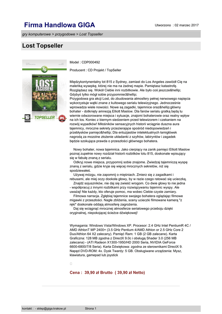 Firma Handlowa GIGA Utworzono : 02 marzec 2017 gry komputerowe > przygodowe > Lost Topseller Lost Topseller Model : CDP000492 Producent : CD Projekt / TopSeller Międzykontynentalny lot 815 z Sydney, zamiast do Los Angeles zawiódł Cię na maleńką wysepkę, której nie ma na żadnej mapie. Pamiętasz katastrofę. Rozglądasz się. Wokół Ciebie inni rozbitkowie. Ale było coś jeszcze… Gdybyś tylko mógł sobie przypomnieć… Przygodowa gra akcji Lost, do zbudowania atmosfery pełnej nerwowego napięcia wykorzystuje wątki znane z kultowego serialu telewizyjnego. Jednocześnie wprowadza wiele nowości. Nowe są zagadki, tajemnice oraz…główny bohater - dotknięty amnezją Elliott Maslow. Dla fanów serialu gratką będą tu wiernie odwzorowane miejsca i sytuacje, znajomi bohaterowie oraz realny wpływ na ich los. Koniec z biernym siedzeniem przed telewizorem i czekaniem na rozwój wypadków! Miłośników sensacyjnych historii wciągnie duszna aura tajemnicy, mroczne sekrety przezierające spośród niedopowiedzeń i przebłysków pamięci… Dla entuzjastów intelektualnych łamigłówek nagrodą za mozolne złożenie układanki z szyfrów, labiryntów i zagadek będzie szokująca prawda o przeszłości głównego bohatera. Nowy bohater, nowa tajemnica. Jako cierpiący na zanik pamięci Elliott Maslow poznaj zupełnie nowy rozdział historii rozbitków lotu 815, doskonale wpisujący się w fabułę znaną z serialu. Odkryj nowe miejsca, przypomnij sobie znajome. Zwiedzaj tajemniczą wyspę znaną z serialu, gdzie kryje się więcej mrocznych sekretów, niż się spodziewałeś. Używaj mózgu, nie zapomnij o mięśniach. Zmierz się z zagadkami i rebusami, ale miej oczy dookoła głowy, by w razie czego ratować się ucieczką. Znajdź sojuszników, nie daj się zwieść wrogom. Co dwie głowy to nie jedna - współpracuj z innymi rozbitkami przy rozwiązywaniu tajemnic wyspy. Ale uważaj! Nie każdy, kto oferuje pomoc, ma wobec Ciebie czyste zamiary. Filmowa narracja. Zgłębiaj tajemnice swojego bohatera oglądając filmowe migawki z przeszłości. Nagłe zbliżenia, sceny ucieczki filmowane kamerą "z ręki" doskonale oddają atmosferę zagrożenia. Daj się wciągnąć mrocznej atmosferze serialowego przeboju dzięki oryginalnej, niepokojącej ścieżce dźwiękowej! Wymagania: Windows Vista/Windows XP. Procesor: 2.4 GHz Intel PentiumR 4C / AMD AthlonT MP 2400+ (3.5 GHz Pentium 4/AMD Athlon or 2.5 GHz Core 2 Duo/Athlon 64 X2 zalecany). Pamięć Ram: 1 GB (2 GB zalecane). Karta Graficzna: 128 MB zgodna z DirectX 9.0c i obsługą Shader 3.0 (256 MB zalecana) - (ATI Radeon X1300-1950/HD 2000 Seria, NVIDIA GeForce 6600-6800/7/8 Seria). Karta Dźwiękowa: zgodna ze sterownikami DirectX 9. Napęd DVD-ROM: 4x. Dysk Twardy: 5 GB. Obsługiwane urządzenia: Mysz, klawiatura, gamepad lub joystick � Cena : 39,90 zł Brutto ( 39,90 zł Netto) kontakt : - [email protected] Strona 1