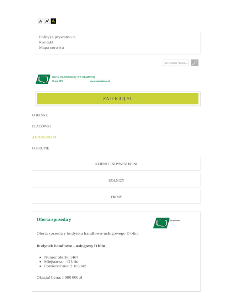 Polityka prywatno ci Kontakt Mapa serwisu szukana fraza... ZALOGUJ SI O BANKU PLACÓWKI AKTUALNO CI O GRUPIE KLIENCI INDYWIDUALNI ROLNICY FIRMY Oferta sprzeda y Oferta sprzeda y budynku handlowo-usługowego D blin. Budynek handlowo - usługowy D blin Numer oferty: 1467 Miejscowo : D blin Powierzchnia: 2 105 m2 Okazja! Cena: 1 500 000 zł Cena za m2: 712,59 zł Parametry ogólne Przeznaczenie lokalu: usługowo-handlowy, usługowy, handlowy, biurowy, produkcyjny, magazynowy Umiejscowienie lokalu: budynek wolnostoj cy Rok budowy: lata 80-te Technologia, wyposa enie Materiał wykonania budynku: cegła Otoczenie Miejsca parkingowe: na ulicy Nieruchomo komercyjna – budynek produkcyjno – usługowy, dwukondygnacyjny, podpiwniczony, składaj cy si z dwóch segmentów okalaj cych patio. Budynek znajduje si na działce o powierzchni 7067m2, w D blinie na os. Lotnisko (najwi ksze osiedle wielorodzinne w D blinie), ok. 2km od centrum miasta. Dojazd do nieruchomo ci drog utwardzon asfaltem, kostk i płytami betonowymi. Układ komunikacji wewn trznej zapewnia swobodny dost p do budynku oraz miejsca parkingowe. Otoczenie nieruchomo ci to: - od strony północnej ogródki działkowe - od strony południowej i wschodniej zabudowa jednorodzinna - od strony zachodniej osiedle domów wielorodzinnych. Według miejscowego planu zagospodarowania przestrzennego, działka w cało ci poło ona jest w terenie przeznaczonym pod usługi komercyjne. Istnieje projekt podziału nieruchomo ci na 2 lub 3 mniejsze działki. Mo liwy jest podział na 2 oddzielne budynki. Budynek mo e spełnia bardzo wiele funkcji: handlowo – usługowych (centrum handlowe), o wiatowych (przedszkole, szkoła prywatna), zdrowotnych (przychodnia, lecznica), lub inwestycje typu dom spokojnej staro ci, dom weselny, hotel, zajazd. Mo na go zaadaptowa według własnego pomysłu i potrzeb. Media dost pne – energia elektryczna, wodoci g, kanalizacja, gaz, telefon. Działka ogrodzona ze wszystkich stron ogrodzeniem z siatki stalowej na słupach stalowych, brama wjazdowa automatyczna stalowa. Budynek murowany, składaj cy si z 2 segmentów poł czonych ze sob korytarzami okalaj cymi patio, wybudowany w latach 80-tych w technologii wielkiej płyty. Forma przestrzenna nieregularna. Wi kszy segment jest wyko czony. Wyko czenie jest nast puj ce: tynki cementowo – wapienne, okna PCV, cz ciowo drewniane starszego typu, drzwi zewn trzne aluminiowe. Na posadzkach w kotłowni, sanitariatach i w biurze terakota, w pomieszczeniach produkcyjnych posadzka wyło ona specjaln ywic . W sanitariatach oraz w pomieszczeniach produkcyjnych glazura, w cz ci budynku posadzka z terakoty i paneli, ciany obło one cz ciowo płytk elewacyjn i panelami, w łazience i kuchni glazura i terakota. W piwnicy zaadoptowano pomieszczenia wykorzystywane jako mieszkalne: w pokojach panele podłogowe i cz ciowo terakota, w aneksach kuchennych, na korytarzach i w sanitariatach terakota. Mniejszy segment jest w stanie surowym zamkni tym. Całkowita powierzchnia zabudowy to 929,12 m2, powierzchnia u ytkowa 2104,60 m2. CENA DO NEGOCJACJI ZMIANA TABELI OPROCENTOWANIA BEZPIECZE STWO W BANKOWO CI ELEKTRONICZNEJ OFERTA SPRZEDA Y OFERTA SPRZEDA Y NIERUCHOMO CI ZMIANY W PŁATNO CIACH KART W INTERNECIE NAGRODA DLA BS PONIATOWA BANKOWO MOBILNA JU DOST PNA!!! UWAGA U YTKOWNICY SMARTFONÓW!!! UWAGA ZAGRO ENIE!!! AKTUALNO CI 17-11-2016 ZMIANA TABELI OPROCENTOWANIA Informujemy, e z dniem 01.01.2017r zmianie ulegnie Tabela Oprocentowania Rachunków Bankowych i Depozytów obowi zujaca w Banku Spółdzielczym w Poniatowej i... 26-08-2016 UWAGA ZAGRO ENIE!!! W zwi zku w pojawieniem si nowego zagro enia w postaci oprogramowania o nazwie "Gozi" loguj c si na na stron bankowo ci internetowej... 10-06-2016 WA NE!!! AKTYWACJA KART PŁATNICZYCH Infolinia Grupy BPS pod numerem telefonu +48 86 215 50 00 czynna jest przez 7 dni w tygodniu, 24... zobacz wszystkie KURSY WALUT Kursy walut 2017-02-28 obowi zuje od godziny: 16:00 1 EUR 4.1813 1 USD 3.9446 1 CHF 3.8993 1 GBP 4.8869 wi cej STAWKI REFERENCYJNE WIBOR 1M - rednia 1,66 WIBOR 3M - rednia 1,70 WIBOR 3M 1,72 wi cej Oprocentowanie Opłaty i prowizje Nagrody i wyró nienia Schemat organizacyjny Bankowo elektroniczna Internet Banking Doładowania telefonów SMS Banking Home Banking Karty Kontakt Sesje rozliczeniowe - godziny Rozpatrywanie skarg i reklamacji Podzi kowania Kontakt Copyright © Grupa BPS | 2017 Serwis bsponiatowa.pl u ywa plików cookie. Brak zmian ustawie przegl darki oznacza zgod na ich u ycie.