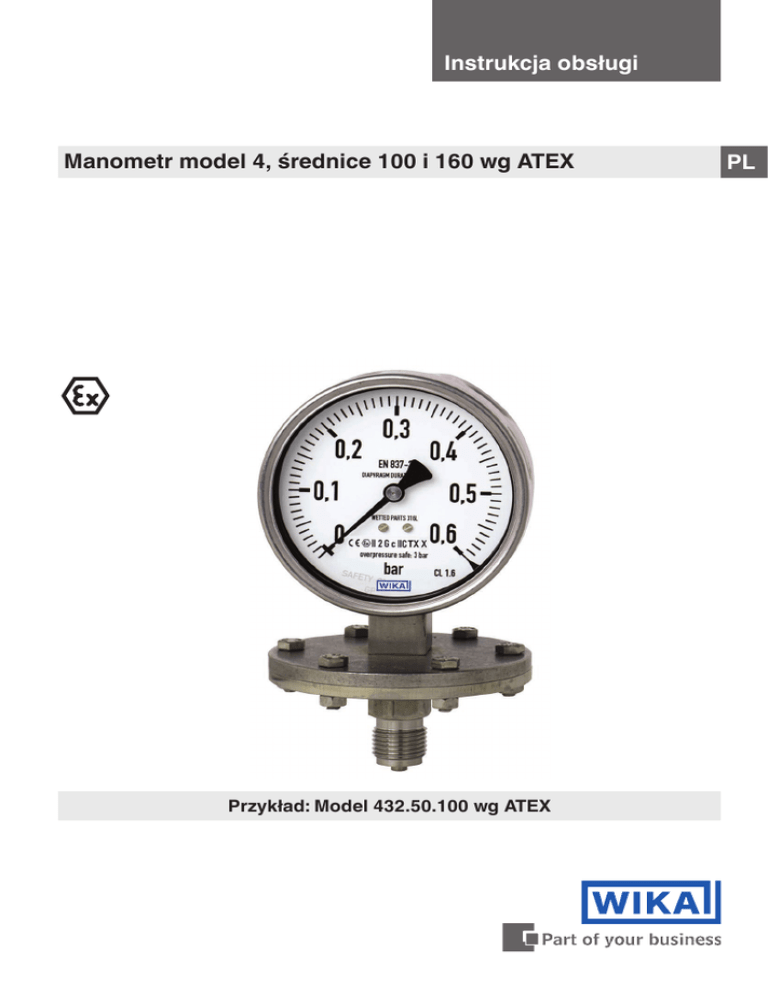 Instrukcja obsługi Manometr model 4, średnice 100 i 160 wg ATEX Przykład: Model 432.50.100 wg ATEX PL PL Instrukcja obsługi model 4 wg ATEX Strony 3-14 © 2010 WIKA Alexander Wiegand SE & Co. KG Wszystkie prawa zastrzeżone. WIKA® to zarejestrowany znak towarowy w różnych krajach. 2 WIKA operating instructions pressure gauge model 4 per ATEX 12/2016 PL based on 2080276.06 11/2016 EN Przed rozpoczęciem pracy przeczytać instrukcję obsługi! Przechowywać do późniejszego użytku! Spis treści Spis treści 1. Informacje ogólne 4 2. Bezpieczeństwo 5 3. Specyfikacje 9 4. Konstrukcja i działanie 10 5. Transport, opakowanie i przechowywanie 10 6. Uruchamianie, eksploatacja 11 7. Konserwacja i czyszczenie 13 8. Demontaż i złomowanie 13 12/2016 PL based on 2080276.06 11/2016 EN Deklaracje zgodności są dostępne na stronie www.wika.com. Instrukcja obsługi manometru WIKA, model 4 wg ATEX 3 PL 1. Informacje ogólne 1. Informacje ogólne Objaśnienie symboli OSTRZEŻENIE! ... wskazuje potencjalnie niebezpieczną sytuację, która może skutkować poważnymi obrażeniami ciała lub śmiercią, jeżeli się jej nie zapobiegnie. Informacje … wskazuje pożyteczne uwagi, zalecenia i informacje dotyczące wydajnej i niezawodnej pracy przyrządu. OSTRZEŻENIE! ... wskazuje potencjalnie niebezpieczną sytuację w obszarze zagrożenia, która skutkuje poważnymi obrażeniami ciała lub śmiercią, jeżeli się jej nie zapobiegnie. 4 Instrukcja obsługi manometru WIKA, model 4 wg ATEX 12/2016 PL based on 2080276.06 11/2016 EN PL Manometr opisany w niniejszej instrukcji obsługi został zaprojektowany i wyprodukowany zgodnie z najnowszą technologią. Wszystkie komponenty poddawane są w trakcie produkcji restrykcyjnym kryteriom jakościowym oraz środowiskowym. Nasze systemy zarządzania posiadają certyfikaty ISO 9001 oraz ISO 14001. Niniejsza instrukcja obsługi zawiera ważne informacje dotyczące użytkowania manometru. Bezpieczeństwo pracy wymaga, aby przestrzegane były wszystkie wskazówki bezpieczeństwa. Należy przestrzegać obowiązujących lokalnie przepisów BHP i ogólnych regulacji bezpieczeństwa dla zakresu zastosowań manometru. Instrukcja obsługi stanowi część składową produktu i musi być przechowywana blisko miejsca zamontowania manometru oraz być zawsze łatwo dostępna dla wykwalifikowanego personelu. Wykwalifikowany personel przed rozpoczęciem dowolnych prac musi dokładnie przeczytać oraz zrozumieć instrukcje obsługi. Odpowiedzialność producenta jest wyłączona w przypadku uszkodzenia przyrządu wskutek jego użytkowania niezgodnego z przeznaczeniem, nieprzestrzegania niniejszej instrukcji obsługi, powierzania prac przy przyrządzie personelowi o niedostatecznych kwalifikacjach lub nieautoryzowanych modyfikacji manometru. Należy stosować się do ogólnych zasad i warunków zawartych w dokumentacji sprzedaży. Przyrząd podlega zmianom technicznym. Dodatkowe informacje: - Adres internetowy: www.wikapolska.pl / www.wika.com - Związana karta katalogowa: PM 04.03, PM 04.07 2. Bezpieczeństwo 2. Bezpieczeństwo OSTRZEŻENIE! Przed instalowaniem, uruchamianiem oraz eksploatacją należy zapewnić dobór odpowiedniego manometru co do zakresu pomiarowego, konstrukcji oraz konkretnych warunków pomiaru. Sprawdzić zgodność z medium przewidzianym w materiałach poddawanych działaniu ciśnienia! Aby zagwarantować dokładność pomiaru i długoterminową niezawodność działania, należy przestrzegać odpowiednich obciążeń granicznych. Nieprzestrzeganie tych warunków może spowodować poważne obrażenia ciała i/lub uszkodzenie urządzeń. Dodatkowe wskazówki bezpieczeństwa znajdują się w poszczególnych rozdziałach niniejszej instrukcji obsługi. 2.1. Przeznaczenie Manometry te stosuje się do pomiaru ciśnienia w obrębie niebezpiecznych obszarów w zastosowaniach przemysłowych. Manometr został zaprojektowany i wykonany wyłącznie do opisanych tutaj zastosowań oraz można go wykorzystywać jedynie zgodnie z tym opisem. 12/2016 PL based on 2080276.06 11/2016 EN Producent nie odpowiada za reklamacje wynikające z użytkowania niezgodnego z przeznaczeniem. 2.2 Kwalifikacje personelu OSTRZEŻENIE! Niebezpieczeństwo zranienia - wymagane są odpowiednie kwalifikacje personelu! Niewłaściwa obsługa może skutkować poważnymi obrażeniami ciała i szkodami rzeczowymi. Czynności opisane w niniejszej instrukcji obsługi mogą być wykonywane tylko przez przeszkolony personel o kwalifikacjach podanych niżej. Wykwalifikowany personel Wykwalifikowany personel to personel, który na podstawie swoich kwalifikacji i wiedzy technicznej w zakresie technologii pomiarowej i kontrolnej oraz swego doświadczenia i znajomości przepisów krajowych, obowiązujących norm i dyrektyw jest w stanie wykonywać opisane prace i niezależnie rozpoznawać potencjalne zagrożenia. Instrukcja obsługi manometru WIKA, model 4 wg ATEX 5 PL 2. Bezpieczeństwo 2.3 Wskazówki bezpieczeństwa dotyczące manometrów wg ATEX OSTRZEŻENIE! Nieprzestrzeganie tych wskazówek i ich treści może skutkować utratą zabezpieczenia przeciwwybuchowego. PL OSTRZEŻENIE! Konieczne jest przestrzeganie warunków eksploatacji i wymogów bezpieczeństwa certyfikatu badania typu WE. ▶▶ Manometry muszą być uziemione za pomocą przyłącza procesowego. Dopuszczalna temperatura otoczenia -20 ... +60 °C (niewypełnione) -40 ... +60 °C (wypełnione olejem silikonowym) Uwaga! W przypadku mediów gazowych temperatura może wzrosnąć wskutek sprężania. W takim przypadku może być konieczne dławienie wskaźnika zmiany ciśnienia lub redukcja dopuszczalnej temperatury medium. Maksymalna temperatura powierzchni Temperatura powierzchni manometrów zależy w głównej mierze od temperatury medium używanego w danym przypadku. W celu określenia maksymalnej temperatury powierzchni, oprócz temperatury medium, uwzględnia się także wpływ wywoływany przez m.in. temperaturę otoczenia or