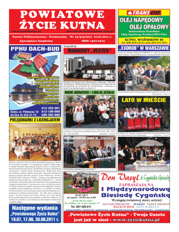 P OWIATO W E ŻYCIE KUTNA www.zyciekutna.pl [email protected] Gazeta Publicystyczno − Promocyjna Nr 13/313/2011 07.07.2011 r. Egzemplarz bezpłatny ISSN 1507−0212 To ju¿ XX lat MARKOWY „VESTER” „EXDROB” W WARSZAWIE Kutnowskie Zak³ady Drobiarskie EXDROB S.A. w dniu 18 czerwca bra³y udzia³ w pikniku - Poznaj Dobr¹ ¯ywnoæ - na terenach SGGW w Warszawie. Siedziba Przedsiêbiorstwa Budownictwa Ogólnego VESTER Handzelewicz, Spó³ka jawna przy ul. Granicznej 15 w Kutnie (tel./fax 24 253-34-56, tel. 24 253-51-18, 24 254-76-39) - informacje na temat firmy zamieszczamy na stronie 16. MARE ADRIATICO – LIDO DI JESOLO Premier Rz¹du Donald Tusk degustuje wyroby z gêsi KZD Exdrob S.A. (fotoreporta¿ - strona 2) LATO W MIEŚCIE PIELĘGNIARKI Z LICENCJATEM W dniach 19-24 czerwca br. Zespó³ Pieni i Tañca Ziemi Kutnowskiej przebywa³ we W³oszech na niekonkurencyjnym Festiwalu Mare Adriatico - Lido di Jesolo. (ci¹g dalszy - strona 4) PODSUMOWANIE ROKU W „STASZICU” Jednym z sukcesów Wy¿szej Szko³y Gospodarki Krajowej w Kutnie jest uzyskanie pieniêdzy z Europejskiego Funduszu Spo³ecznego w ramach Programu Operacyjnego Kapita³ Ludzki w realizacji Projektu Systemowego pod nazw¹ Kszta³cenie zawodowe pielêgniarek i po³o¿nych w ramach studiów pomostowych. Dziêki temu oko³o 80 studentek uzyska³o dyplom licencjacki. Wrêczania dokumentu (dwujêzycznego) dokona³a profesor Laura Wo³owicka, dziekan Wydzia³u Nauk o Zdrowiu w WSGK. Jestemy usatysfakcjonowani kontynuowaniem kszta³cenia w dziedzinie pielêgniarstwa - mówi³a pani dziekan. Zdobylimy du¿e dowiadczenie, a nasze programy pod wzglêdem praktycznym i teoretycznym s¹ na wysokim poziomie. W efekcie ukoñczenia studiów pomostowych pielêgniarki i po³o¿ne uzupe³ni³y swoje kwalifikacje zawodowe, a to umo¿liwi im dalszy rozwój zawodowy i stworzy kontynuowanie nauki na dwuletnich, uzupe³niaj¹cych studiach magisterskich. Do osób, które ukoñczy³y naukê z wysok¹ redni¹ ocen mo¿na zaliczyæ m.in. Ewê Pilzak, Krystynê Bawarsk¹, Dorotê Szczypiñsk¹, czy Katarzynê Bilczak. Na zakoñczenie spotkania, to ju¿ tradycyjnie, by³ szampan, wspomnienia i wspólne zdjêcia. /A.B./ Następne wydania „Powiatowego Życia Kutna” 19.07, 17.08, 30.08.2011 r. Fotoreporta¿ zamieszczamy na stronie 7. W Parku im. R. Traugutta w Kutnie Zespó³ Pieni i Tañca Ziemi Kutnowskiej by³ organizatorem Festynu Rodzinnego. (ci¹g dalszy - strona 5) ¯YCIE KOLOROWE „EXDROB” W WARSZAWIE Donald Tusk w rozmowie z cz³onkiem Rady Nadzorczej Exdrobu - Rajmundem Paczkowskim. Rzecznik Rz¹du Pawe³ Gra degustuje wyroby z Exdrobu. Grillowane smako³yki cieszy³y siê ogromnym uznaniem. Stoj¹ od lewej: Wojciech Kalinowski, Stanis³aw niecikowski, Kurt Scheller i Tomasz Tuliñski. ZAPRASZAMY DO NASZYCH SKLEPÓW FIRMOWYCH 2 POWIATOWE ŻYCIE KUTNA • NR 13/313 • 7 LIPCA 2011 R. ¯YCIE REGIONALNE NAJLEPSI Z NAJLEPSZYCH W sali konferencyjnej Urzêdu Miasta Kutna oficjalnie zakoñczono rok szkolny 2010/2011 szkó³ podstawowych i gimnazjów. Zebrani wys³uchali podsumowania wyników nauczania, a brawami dziêkowali Zbigniewowi Wdowiakowi, wiceprezydentowi miasta, za ¿yczenia i gratulacje pod adresem uczniów i ich rodziców. Szko³y podstawowe - Sprawdzian Natalia I¿yñska (SP5) - 40 pkt., Przemys³aw W³odarczyk (SP6) - 39 pkt., Patryk Wasilewski (SP9) - 39 pkt., Kamil Krukowski (SP1) - 38 pkt., Emil Tomczak (SP9) - 38 pkt., Agata Gawryszczak (SP9) - 38 pkt., Krzysztof Jaworski (SP9) - 38 pkt., Justyna Strzelecka (SP6) - 37 pkt., Dominik Marian Szczesiak (SP1) - 37 pkt., Miko³aj B¹k (SP9) - 37 pkt., Aleksandra Pawlak (SP9) - 37 pkt. Olimpiady i Konkursy - Szko³y Podstawowe David Sombati (SP1) - laureat I miejsca V Edycji Ogólnopolskiego Konkursu Stypendiada Wczesnoszkolna w konkursie matematycznym Plus Minus (opiekun Violetta Wojciechowska); Mateusz Narkiewicz (SP1) laureat 9 miejsca w Polsce Ogólnopolskiej Olimpiady Przedmiotowej z Przyrody OLIMPUS Sesja wiosenna 2011 (opiekun Ilona Starybrat); Maria Kalbarczyk (SP1) - laureat 8 miejsce w Polsce Ogólnopolskiej Olimpiady Przedmiotowej z Matematyki OLIMPUS sesja wiosenna 2011 (opiekun Sylwia Mujta); Emilia Mazur (SP4) - I miejsce w województwie ³ódzkim w Alfiku Humanistycznym (opiekun Beata Piñska); B³a¿ej Wilanowski (SP6) - III miejsce w województwie w MAT 2011 (opiekun Ma³gorzata Kilian); Wiktoria D¹browska (SP6) - III miejsce w województwie ³ódzkim w Alfiku Humanistycznym i IV miejsce w województwie ³ódzkim w Omnibusie Humanistycznym w 2011 r. (opiekun El¿bieta Tumiel); Katarzyna B¹k (SP9) - laureatka I stopnia z wyró¿nieniem (100 punktów na 100 mo¿liwych) w Ogólnopolskim Konkursie Jêzyka Angielskiego Test Oxford Plus (opiekun Edyta Woniak); Agnieszka Tybiñkowska (SP9) laureatka I stopnia Ogólnopolskiego Konkursu Jêzyka Angielskiego Test Oxford Plus (opiekun Edyta Woniak); Krzysztof Jaworski (SP9) - I miejsce w województwie i dyplom II stopnia za Ogólnopolski Konkurs Humanistyczny Omnibus (opiekun Ewa Szarata), I miejsce w województwie w Ogólnopolskim Konkursie Historycznym Klio 2011 (opiekun Ma³gorzata Borucka); Wiktoria Kostyniak (SP9) - laureatka I stopnia w Ogólnopolskim Konkursie Test Historia Plus (opiekun Ma³gorzata Borucka); Jakub Kopeæ (SP9) - laureat I stopnia Ogólnopolskigo Konkursu Test matematyka Plus (opiekun Agnieszka Bawarska); Adam Postolski (SP9) - laureat I stopnia z wyró¿nieniem (100 punktów na 100 mo¿liwych) w Ogólnopolskim Tecie z Matematyki Oxford Plus XV edycja (opiekun Agnieszka Bawarska). Gimnazja - Egzamin Jakub Lempke (GM1) - 45,7 pkt., Olga Stanik (GM2) - 45,66 pkt., Konrad Kusiak (GM1) - 45,3 pkt., Karolina Marciniak (GM1) - 45 pkt., Micha³ Stangreciak (GM1) - 44,3 pkt., Klementyna Kêpiñska (GM1) - 44,0 pkt., Artur Bielecki (GM1) - 43,3 pkt., Kacper Wasiak (GM2) - 43,3 pkt., Micha³ Limanowski (GM2) - 43,3 pkt., Oliwia Woniak (GM3) - 43 pkt., Paulina Kamiñska (GM3) - 43 pkt., Malwina Szczepañs