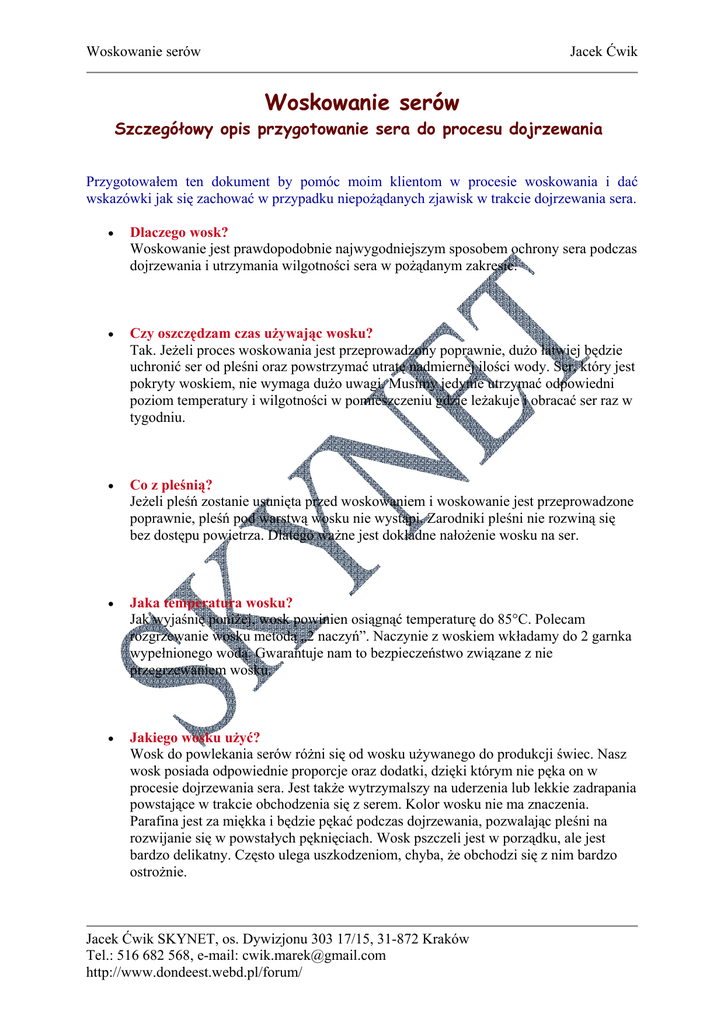 Woskowanie serów Jacek Ćwik Woskowanie serów Szczegółowy opis przygotowanie sera do procesu dojrzewania Przygotowałem ten dokument by pomóc moim klientom w procesie woskowania i dać wskazówki jak się zachować w przypadku niepożądanych zjawisk w trakcie dojrzewania sera. • Dlaczego wosk? Woskowanie jest prawdopodobnie najwygodniejszym sposobem ochrony sera podczas dojrzewania i utrzymania wilgotności sera w pożądanym zakresie. • Czy oszczędzam czas używając wosku? Tak. Jeżeli proces woskowania jest przeprowadzony poprawnie, dużo łatwiej będzie uchronić ser od pleśni oraz powstrzymać utratę nadmiernej ilości wody. Ser, który jest pokryty woskiem, nie wymaga dużo uwagi. Musimy jedynie utrzymać odpowiedni poziom temperatury i wilgotności w pomieszczeniu gdzie leżakuje i obracać ser raz w tygodniu. • Co z pleśnią? Jeżeli pleśń zostanie usunięta przed woskowaniem i woskowanie jest przeprowadzone poprawnie, pleśń pod warstwą wosku nie wystąpi. Zarodniki pleśni nie rozwiną się bez dostępu powietrza. Dlatego ważne jest dokładne nałożenie wosku na ser. • Jaka temperatura wosku? Jak wyjaśnię poniżej, wosk powinien osiągnąć temperaturę do 85°C. Polecam rozgrzewanie wosku metodą „2 naczyń”. Naczynie z woskiem wkładamy do 2 garnka wypełnionego wodą. Gwarantuje nam to bezpieczeństwo związane z nie przegrzewaniem wosku. • Jakiego wosku użyć? Wosk do powlekania serów różni się od wosku używanego do produkcji świec. Nasz wosk posiada odpowiednie proporcje oraz dodatki, dzięki którym nie pęka on w procesie dojrzewania sera. Jest także wytrzymalszy na uderzenia lub lekkie zadrapania powstające w trakcie obchodzenia się z serem. Kolor wosku nie ma znaczenia. Parafina jest za miękka i będzie pękać podczas dojrzewania, pozwalając pleśni na rozwijanie się w powstałych pęknięciach. Wosk pszczeli jest w porządku, ale jest bardzo delikatny. Często ulega uszkodzeniom, chyba, że obchodzi się z nim bardzo ostrożnie. Jacek Ćwik SKYNET, os. Dywizjonu 303 17/15, 31-872 Kraków Tel.: 516 682 568, e-mail: [email protected] http://www.dondeest.webd.pl/forum/ Woskowanie serów Jacek Ćwik Czyszczenie sera przed woskowaniem. Po wyjęciu sera z formy lub prasy, będzie trzeba go odłożyć na kilka dni by przesechł. Powinien leżeć w pomieszczeniu o niskiej temperaturze i dobrej cyrkulacji powietrza. Pod ser podkładamy kawałek chusty, która powstrzyma ser od kontaktu z kurzem i brudem. Po około tygodniu może jednak się wykształcić pleśń. Zanim zaczniemy woskować ser, trzeba usunąć ślady pleśni. Można tego dokonać przemywając ser roztworem soli. Do szklanki z chłodną wodą wsypujemy łyżeczkę soli. Nasączmy tym roztworem ściereczkę i zmywamy z łatwością powstałą pleśń. Ser pozostawiamy do przeschnięcia na 1 - 2 godzin. Po tym czasie możemy przystąpić do woskowania. Jacek Ćwik SKYNET, os. Dywizjonu 303 17/15, 31-872 Kraków Tel.: 516 682 568, e-mail: [email protected] http://www.dondeest.webd.pl/forum/ Woskowanie serów Jacek Ćwik Woskowanie pędzlem. Zaczynamy podgrzewając wosk w garnku z wodą. Używając tej metody, wosk nie osiągnie temperatury większej niż 96 °C. Gotująca się woda osiąga maks. 100 °C, co przy przenoszeniu ciepła pozwala na osiągnięcie temp. wosku tylko 96 °C. Gdy wosk się rozgrzeje, możesz rozpocząć nakładanie go przy pomocy pędzla. Kluczowe jest tu szybkie działanie i nakładanie dużo wosku by osiągnąć odpowiednią warstwę. Nałóż przynajmniej 2 warstwy by mieć pewność, że osłona jest wystarczająca. Metoda ta wymaga mniejszej ilości wosku, gdyż używamy naczynia wystarczająco wąskiego by zmieścił się do niego pędzel. Natomiast może wystąpić problem z czyszczeniem pędzla. Czyszczenie pędzla: Natychmiast po woskowaniu zeskrob zaschły wosk z boków pędzla a resztę, która jest jeszcze gorąca wytrzyj ręcznikiem papierowym lub szmatką. Zużyte ręczniki wyrzucamy. Pędzel nadal będzie twardy jednak łatwo się zmiękczy po włożeniu do rozgrzanego wosku przy następnym woskowaniu. Przechowuj wosk i pędzel zakryte by się nie kurzyły. Jacek Ćwik SKYNET, os. Dywizjonu 303 17/15, 31-872 Kraków Tel.: 516 682 568, e-mail: [email protected] http://www.dondeest.webd.pl/forum/ Woskowanie serów Jacek Ćwik Woskowanie zanurzeniowe. Proszę przeczytać notatkę na dole dokumentu o niebezpieczeństwach bezpośredniego podgrzewania wosku na kuchence. Na powyższych zdjęciach podgrzałem wosk do temperatury 85 °C. W tej temperaturze wosk jest bardzo gorący. Działaj z rozwagą i upewnij się, że dobrze trzymasz ser przed zanurzeniem go w wosku. Pierwszą czynnością, jaką robimy po podgrzaniu wosku jest zgaszenie palnika i podłożenie pod spód aluminiowej folii by „łapać” skapujące krople wosku (ułatwia to późniejsze sprzątanie). Zanurzamy wierzch sera, pozwalamy by ochłonął. Następnie robimy to samo ze spodem. Po ochłodzeniu się góry i dołu, obracamy ser tak by wosk pokrył połowę boku sera. Znów czekamy by się ochłodził i robimy to samo z drugą połową. Zalecam podwójne woskowanie. Sekwencja wygląda wtedy tak. Woskujemy górę, czekamy aż ostygnie. Znów ją zanurzamy. Czekamy aż ostygnie. Zanurzamy dół itd. ... Po zakończeniu woskowania zostawiamy ser aż do całkowitego schłodzenia. Po ochłodzeniu odkładamy do leżakowania. Możemy przykryć szmatką lub chustą by chronić przed kurzem. Jacek Ćwik SKYNET, os. Dywizjonu 303 17/15, 31-872 Kraków Tel.: 516 682 568, e-mail: [email protected] http://www.dondeest.webd.pl/forum/ Woskowanie serów Jacek Ćwik Jak przechowywać? Po woskowaniu, odkładamy ser do dalszego dojrzewania. Powinny być zachowane odpowiednia temperatura i wilgotność powietrza (zazwyczaj 11-13 °C i 85% wilgotności). Obracamy ser raz w tygodniu i sprawdzamy czy pod woskiem nie tworzy się pleśń. Co zrobić w przypadku wystąpienia pleśni? Jeżel