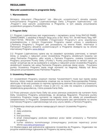 Delly, Uczestnicy Programu potwierdzają, że akceptują Regulamin. Przyznane punkty