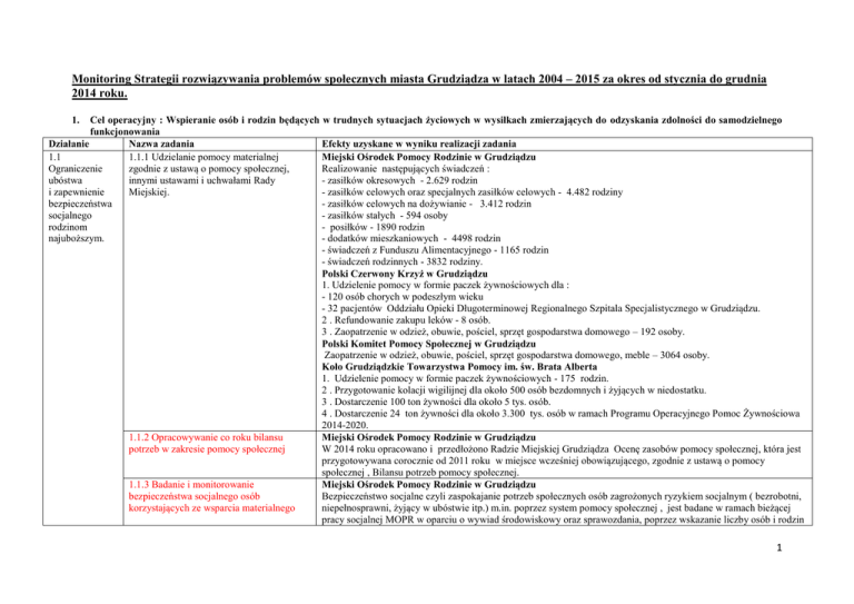 Monitoring Strategii rozwiązywania problemów społecznych miasta Grudziądza w latach 2004 – 2015 za okres od stycznia do grudnia 2014 roku. Cel operacyjny : Wspieranie osób i rodzin będących w trudnych sytuacjach życiowych w wysiłkach zmierzających do odzyskania zdolności do samodzielnego funkcjonowania Działanie Nazwa zadania Efekty uzyskane w wyniku realizacji zadania 1.1 1.1.1 Udzielanie pomocy materialnej Miejski Ośrodek Pomocy Rodzinie w Grudziądzu Ograniczenie zgodnie z ustawą o pomocy społecznej, Realizowanie następujących świadczeń : ubóstwa innymi ustawami i uchwałami Rady - zasiłków okresowych - 2.629 rodzin i zapewnienie Miejskiej. - zasiłków celowych oraz specjalnych zasiłków celowych - 4.482 rodziny bezpieczeństwa - zasiłków celowych na dożywianie - 3.412 rodzin socjalnego - zasiłków stałych - 594 osoby rodzinom - posiłków - 1890 rodzin najuboższym. - dodatków mieszkaniowych - 4498 rodzin - świadczeń z Funduszu Alimentacyjnego - 1165 rodzin - świadczeń rodzinnych - 3832 rodziny. Polski Czerwony Krzyż w Grudziądzu 1. Udzielenie pomocy w formie paczek żywnościowych dla : - 120 osób chorych w podeszłym wieku - 32 pacjentów Oddziału Opieki Długoterminowej Regionalnego Szpitala Specjalistycznego w Grudziądzu. 2 . Refundowanie zakupu leków - 8 osób. 3 . Zaopatrzenie w odzież, obuwie, pościel, sprzęt gospodarstwa domowego – 192 osoby. Polski Komitet Pomocy Społecznej w Grudziądzu Zaopatrzenie w odzież, obuwie, pościel, sprzęt gospodarstwa domowego, meble – 3064 osoby. Koło Grudziądzkie Towarzystwa Pomocy im. św. Brata Alberta 1. Udzielenie pomocy w formie paczek żywnościowych - 175 rodzin. 2 . Przygotowanie kolacji wigilijnej dla około 500 osób bezdomnych i żyjących w niedostatku. 3 . Dostarczenie 100 ton żywności dla około 5 tys. osób. 4 . Dostarczenie 24 ton żywności dla około 3.300 tys. osób w ramach Programu Operacyjnego Pomoc Żywnościowa 2014-2020. 1.1.2 Opracowywanie co roku bilansu Miejski Ośrodek Pomocy Rodzinie w Grudziądzu potrzeb w zakresie pomocy społecznej W 2014 roku opracowano i przedłożono Radzie Miejskiej Grudziądza Ocenę zasobów pomocy społecznej, która jest przygotowywana corocznie od 2011 roku w miejsce wcześniej obowiązującego, zgodnie z ustawą o pomocy społecznej , Bilansu potrzeb pomocy społecznej. 1.1.3 Badanie i monitorowanie Miejski Ośrodek Pomocy Rodzinie w Grudziądzu bezpieczeństwa socjalnego osób Bezpieczeństwo socjalne czyli zaspokajanie potrzeb społecznych osób zagrożonych ryzykiem socjalnym ( bezrobotni, korzystających ze wsparcia materialnego niepełnosprawni, żyjący w ubóstwie itp.) m.in. poprzez system pomocy społecznej , jest badane w ramach bieżącej pracy socjalnej MOPR w oparciu o wywiad środowiskowy oraz sprawozdania, poprzez wskazanie liczby osób i rodzin 1. 1 1.1.4 Rozwijanie szeroko rozumianego poradnictwa dla osób długotrwale korzystających z pomocy społecznej, w tym tworzenie biur porad społecznych, przeciwdziałanie bezradności tej grupy osób. 1.1.5 Realizowanie programów służących zaspokajaniu podstawowych potrzeb dzieci z rodzin ubogich - dożywianie w szkołach, wyprawka szkolna, dopłata do przedszkola, wypoczynek wakacyjny, bilety na imprezy sportowe i kulturalne. korzystających ze świadczeń pomocy społecznej, struktury rodzin, dysfunkcji itp. Miejski Ośrodek Pomocy Rodzinie w Grudziądzu 1. Prowadzenie pracy socjalnej – 5.645 rodzin. 2. Prowadzenie poradnictwa specjalistycznego (prawnego, psychologicznego, rodzinnego) – 2.028 rodzin. Miejski Ośrodek Pomocy Rodzinie w Grudziądzu 1. Zapewnienie gorącego posiłku 354 dzieciom do czasu rozpoczęcia nauki w szkole podstawowej, 1.437 uczniom do czasu ukończenia szkoły ponadgimnazjalnej. 2. Zorganizowanie wspólnie ze Związkiem Miast Nadwiślańskich wycieczki do Torunia dla 18 dzieci. Wydział Edukacji Urzędu Miejskiego w Grudziądzu 1. Dofinansowanie zakupu podręczników szkolnych w ramach rządowego programu pomocy uczniom „Wyprawka szkolna” dla: - 164 uczniów w klasach II szkoły podstawowej - 172 uczniów w klasach III szkoły podstawowej - 121 uczniów w klasach VI szkoły podstawowej - uczniów słabowidzących, słabosłyszących, niesłyszących, z autyzmem w tym z zespołem Aspergera, z niepełnosprawnością ruchową, w tym z afazją, upośledzeniem umysłowym w stopniu lekkim, posiadających orzeczenie o potrzebie kształcenia specjalnego realizujących obowiązek szkolny w : a) klasach II-III szkoły podstawowej - 56 uczniów b) klasach IV-VI szkoły podstawowej - 107 uczniów c) klasach I-III gimnazjum - 166 uczniów d) szkołach ponadgimnazjalnych - 115 uczniów e) szkołach specjalnych przysposabiających do pracy - 59 uczniów - 12 uczniów z upośledzeniem umysłowym w stopniu umiarkowanym lub znacznym, uczęszczających do klasy I szkoły podstawowej, nie korzystający z podręcznika do zajęć z zakresu edukacji: polonistycznej, matematycznej, przyrodniczej i społecznej 2. Zaopatrzenie w darmowe podręczniki opracowane przez MEN oraz materiały edukacyjne i ćwiczeniowe do danego języka obcego nowożytnego 1264 uczniów klas I szkół podstawowych w ramach dotacji celowej w wysokości 96.340,36 zł . 3. Dofinansowanie 50% do opłat za niektóre świadczenia przedszkoli miejskich - 22 rodziny znajdujące się w trudnej sytuacji materialnej. 4. Zapewnienie wypoczynku dla dzieci i młodzieży w okresie ferii: - zimowych - 300 dzieci i młodzieży na kwotę 19.530 zł - letnich - 552 dzieci na kwotę 33.230,25 zł . Wydział Kultury, Sportu i Promocji Urzędu Miejskiego w Grudziądzu 1. Udostępnienie bezpłatnych wejściówek na koncerty i spektakle dla 30 osób przez Centrum Kultury Teatr w ramach Grudziądzkiej Karty Dużej Rodziny i Karty Dużej Rodziny. 2 1.1.6 Tworzenie i wspieranie programów wsparcia rodzin wielodzietnych zagrożonych ubóstwem: pomoc materialna, poradnictwo, system ulg: komunikacja miejska, opł