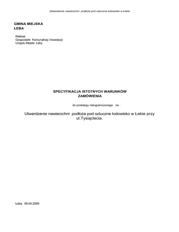 Utwardzenie nawierzchni podłoŜa pod sztuczne lodowisko w Łebie GMINA MIEJSKA ŁEBA Referat Gospodarki Komunalnej i Inwestycji Urzędu Miasta Łeby SPECYFIKACJA ISTOTNYCH WARUNKÓW ZAMÓWIENIA do przetargu nieograniczonego na : Utwardzenie nawierzchni podłoŜa pod sztuczne lodowisko w Łebie przy ul.Tysiąclecia. Łeba 06.04.2009 Utwardzenie nawierzchni podłoŜa pod sztuczne lodowisko w Łebie 1. Nazwa i adres Zamawiającego Gmina Miejska Łeba. Urząd Miasta Łeby 84-360 Łeba ul.Kościuszki 90 2. TRYB UDZIELENIA ZAMÓWIENIA Zamówienie jest udzielane w trybie przetargu nieograniczonego . 3. PRZEDMIOT ZAMÓWIENIA 3.1 Utwardzenie nawierzchni podłoŜa pod sztuczne lodowisko o wym. 29 x 22 m wraz z chodnikami o pow ok. 200 m2 3.2 Szczegółowy zakres robót jest zawarty w przedmiarze robót będącym składnikiem niniejszej specyfikacji . 3.3 Zamawiający nie dopuszcza składania ofert na część zamówienia 3.4. Zamawiający moŜe ograniczyć zakres wykonania zadania na etapie podpisania umowy z uwagi na przekroczenie w wybranej ofercie, przeznaczonej w budŜecie kwoty na wykonanie zadania . 4. PRZEWIDYWANE ZAMÓWIENIA UZUPEŁNIAJĄCE Zamawiający przewiduje , Ŝe udzieli wybranemu wykonawcy zamówienia uzupełniającego z wolnej ręki do wysokości 50% zamówienia podstawowego zgodnie z art. 67 ust 1 pkt 6 ustawy z dnia 29 stycznia 2004 r. - Prawo zamówień publicznych , pod warunkiem wystąpienia takiej potrzeby. 5. OFERTY WARIANTOWE Zamawiający nie dopuszcza składania ofert wariantowych 6. TERMIN WYKONANIA ZAMÓWIENIA Termin wykonania wymagany - do 18.05. 2008 r. 7. OPIS WARUNKÓW UDZIAŁU W POSTĘPOWANIU i OPIS SPOSOBU DOKONYWANIA OCENY SPEŁNIANIA TYCH WARUNKÓW 7.1 O udzielenie zamówienia mogą się ubiegać oferenci : a/ Spełniający warunki okr. w art. 22 ustawy Prawo zamówień publicznych i nie podlegający wykluczeniu na podstawie art. 24 ustawy b/ Prowadzą działalność gospodarczą zgodną z przedmiotem zamówienia. c/ Wykonają podstawowy zakres przedmiotu zamówienia samodzielnie (Zamawiający nie dopuszcza podwykonawstwa robót za wyjątkiem robót ziemnych. 7.2. Zamawiający ocenia spełnienie zadanych warunków poprzez : - sprawdzenie złoŜenia oświadczenia o spełnianiu przez oferenta warunków udziału w postępowaniu ( formularz w specyfikacji) oraz następujących dokumentów na potwierdzenie : a/ Odpowiedni dokument z właściwego rejestru, w zaleŜności od formy prowadzenia działalności gosp. wystawionego nie wcześniej niŜ 6 miesięcy przed upływem terminu składania ofert b/ Wykaz wykonanych zadań odpowiadających rodzajem i wartością robotom budowlanym stanowiącym przedmiot niniejszego zamówienia , w okresie ostatnich 5 lat , a jeśli okres prowadzenia działalności oferenta jest krótszy – w tym okresie ) , z podaniem ich wartości, daty i miejsca wykonania oraz z dołączeniem dokumentów potwierdzających, Ŝe roboty te zostały wykonane naleŜycie. c/ Wykaz ew. podmiotów ,jako podwykonawców, które będą uczestniczyć w wykonywaniu zamówienia wraz z określeniem planowanego zakresu wykonywanych przez nich czynności w niniejszym zamówieniu. 8. INFORMACJE O DOKUMENTACH, JAKIE MAJĄ DOSTARCZYĆ OFERENCI . 8.1. Oferent powinien złoŜyć następujące dokumenty a/ Formularz oferty Utwardzenie nawierzchni podłoŜa pod sztuczne lodowisko w Łebie b/ Kosztorys ofertowy c/ Oświadczenie o spełnianiu warunków udziału w postępowaniu okr. w pkt 7.1 a-c ( na podstawie art.44 ustawy Prawo zamówień publicznych d/(*)Zaświadczenie o występowaniu w obrocie prawnym ( aktualny odpis z właściwego rejestru, albo zaświadczenie o wpisie do ewidencji działalności gospodarczej ) e(*) Wykaz wykonanych zadań odpowiadających rodzajem i wartością robotom budowlanym stanowiącym przedmiot niniejszego zamówienia , w okresie ostatnich 5 lat , a jeśli okres prowadzenia działalności oferenta jest krótszy – w tym okresie ) , z podaniem ich wartości, daty i miejsca wykonania oraz z dołączeniem dokumentów potwierdzających, Ŝe roboty te zostały wykonane naleŜycie. f/ Wykaz ew. podmiotów ,jako podwykonawców, które będą uczestniczyć w wykonywaniu zamówienia wraz z określeniem planowanego zakresu wykonywanych przez nich czynności w niniejszym zamówieniu. (*) - dokument moŜe być przedstawiony w formie kopii z poświadczeniem przez oferenta zgodności z oryginałem 9. INFORMACJA O SPOSOBIE POROZUMIEWANIA SIĘ ZAMAWIAJĄCEGO Z WYKONAWCAMI I PRZEKAZYWANIA OŚWIADCZEŃ I DOKUMENTÓW Przyjmuje się podstawowy sposób – telefonicznie. Dokumenty i korespondencję moŜna przesyłać faxem. w charakterze informacyjnym , natomiast dla waŜności tych dokumentów zamawiający wymaga takŜe potwierdzenia ich poprzez przesłanie oryginału pocztą . 10. OSOBY UPRAWNIONE DO POROZUMIEWANIA SIĘ Z OFERENTAMI Osobą do udzielania wyjaśnień ze strony zamawiającego jest Marek Glegoła Komunalnej i Inwestycji tel. 86 61 513 wew, 28 1 1 . WADIUM -Referat Gosp. - nie obowiązuje 12. TERMIN ZWIĄZANIA Z OFERTĄ Ustala się termin związania z ofertą – 30 dni od daty złoŜenia oferty 13 . OPIS SPOSOBU PRZYGOTOWANIA OFERTY a. Ofertę naleŜy sporządzić na formularzu oryginalnym zawartym w niniejszej specyfikacji, jego kserokopii , lub na formularzu wydrukowanym ze specyfikacji z wersji elekrtonicznej. b. Oferta musi mieć formę pisemną i powinna być sporządzona w języku polskim c. Oferta powinna zawierać: nazwę ( imię , nazwisko, lub nazwę firmy ) i dokładny adres oferenta, datę sporządzenia oferty oraz imię i nazwisko osoby uprawnionej do reprezentowania w postępowaniu przetargowym, do oferty powinny być załączone wszystkie wymagane dokumenty załączniki okr w pkt 8.1 specyfikacji . d. Dokumenty – załączniki do oferty powinny być sporządzone zgodnie z zawartymi w części „B” SIWZ - wzorami. e. Na formularzach nie moŜna pomijać Ŝadnych miejsc przewidzianych do wypełnienia . jeŜeli zabraknie miejsca, na