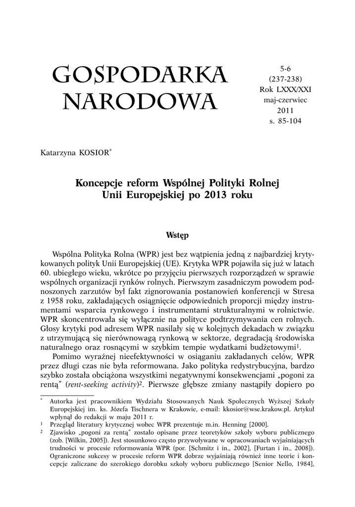 GOSPODARKA NARODOWA 5-6 (237-238) Rok LXXX/XXI maj-czerwiec 2011 s. 85-104 Katarzyna KOSIOR* Koncepcje reform Wspólnej Polityki Rolnej Unii Europejskiej po 2013 roku Wstęp Wspólna Polityka Rolna (WPR) jest bez wątpienia jedną z najbardziej krytykowanych polityk Unii Europejskiej (UE). Krytyka WPR pojawiła się już w latach 60. ubiegłego wieku, wkrótce po przyjęciu pierwszych rozporządzeń w sprawie wspólnych organizacji rynków rolnych. Pierwszym zasadniczym powodem podnoszonych zarzutów był fakt zignorowania postanowień konferencji w Stresa z 1958 roku, zakładających osiągnięcie odpowiednich proporcji między instrumentami wsparcia rynkowego i instrumentami strukturalnymi w rolnictwie. WPR skoncentrowała się wyłącznie na polityce podtrzymywania cen rolnych. Głosy krytyki pod adresem WPR nasilały się w kolejnych dekadach w związku z utrzymującą się nierównowagą rynkową w sektorze, degradacją środowiska naturalnego oraz rosnącymi w szybkim tempie wydatkami budżetowymi1. Pomimo wyraźnej nieefektywności w osiąganiu zakładanych celów, WPR przez długi czas nie była reformowana. Jako polityka redystrybucyjna, bardzo szybko została obciążona wszystkimi negatywnymi konsekwencjami „pogoni za rentą” (rent-seeking activity)2. Pierwsze głębsze zmiany nastąpiły dopiero po * 1 2 Autorka jest pracownikiem Wydziału Stosowanych Nauk Społecznych Wyższej Szkoły Europejskiej im. ks. Józefa Tischnera w Krakowie, e-mail: [email protected]. Artykuł wpłynął do redakcji w maju 2011 r. Przegląd literatury krytycznej wobec WPR prezentuje m.in. Henning [2000]. Zjawisko „pogoni za rentą” zostało opisane przez teoretyków szkoły wyboru publicznego (zob. [Wilkin, 2005]). Jest stosunkowo często przywoływane w opracowaniach wyjaśniających trudności w procesie reformowania WPR (por. [Schmitz i in., 2002], [Furtan i in., 2008]). Ograniczone sukcesy w procesie reform WPR dobrze wyjaśniają również inne teorie i koncepcje zaliczane do szerokiego dorobku szkoły wyboru publicznego [Senior Nello, 1984], 86 GOSPODARKA NARODOWA Nr 5-6/2011 trzydziestu latach od utworzenia polityki. Wyróżnić można trzy zasadnicze fazy w rozwoju WPR. W pierwszym etapie, od 1962 do 1992 roku, WPR opierała się przede wszystkim na wsparciu cenowym. W drugim okresie, od 1992 do 2003 roku, obok wsparcia cenowego pojawiły się powiązane z produkcją płatności bezpośrednie oraz działania skierowane na rozwój obszarów wiejskich. Trzeci etap zapoczątkowała reforma z 2003 roku, która oparła WPR na płatnościach jednolitych uniezależnionych od produkcji oraz na wzmocnionej polityce rozwoju obszarów wiejskich. Wszystko wskazuje na to, że po 2013 roku nastąpi kolejny przełom w funkcjonowaniu WPR. Celem artykułu jest przybliżenie toczącej się obecnie w UE debaty na temat kierunków i perspektyw rozwoju WPR po 2013 roku. Uwaga skoncentrowana zostanie na analizie propozycji środowisk naukowych. Ekonomiści rolni od co najmniej połowy lat 70. ubiegłego wieku wzywają do przeprowadzenia głębokich zmian w ramach WPR. Powolny i trudny proces reformowania polityki przyczynił się jednak do rozpowszechnienia opinii o niewielkim wpływie przedstawicieli świata nauki na decyzje podejmowane w UE. Istotnie, przyjmowane na szczeblu wspólnotowym rozwiązania legislacyjne były i są przede wszystkim wynikiem politycznej gry interesów poszczególnych graczy. Negocjacje opierają się na najniższym wspólnym mianowniku i handlu wymiennym (logrolling), który z reguły ogranicza możliwości przyjmowania decyzji efektywnych z ekonomicznego punktu widzenia. Bez wątpienia jednak znaczenie środowisk naukowych w UE rośnie. Z perspektywy czasu widać, że kluczowe propozycje ekonomistów rolnych, choć z opóźnieniem i nie zawsze w pełnym zakresie, były uwzględniane w kolejno przyjmowanych reformach WPR. Z tego względu warto zapoznać się z najnowszymi koncepcjami środowisk naukowych, które dotyczą przyszłości tej polityki wspólnotowej. Struktura artykułu jest następująca. W pierwszej części omówiony jest krótko wpływ środowisk naukowych na przeprowadzone dotąd reformy WPR. Przybliżenie historycznego wkładu ekonomistów rolnych i innych naukowców w reformowanie systemów wsparcia rolnictwa w UE pozwoli na pełniejsze zrozumienie wagi obecnie formułowanych propozycji. W zasadniczej części artykułu przedstawione są propozycje Bureau i Mahé [2008], koncepcja Heißenhubera [2009] oraz deklaracja czołowych ekonomistów rolnych [2009]. W ostatniej części podjęta jest próba oceny prezentowanych koncepcji z punktu widzenia interesów Polski. Od wsparcia cenowego do wsparcia bezpośredniego i polityki rozwoju obszarów wiejskich. Wkład środowisk naukowych w rozwój WPR Ekonomiści rolni głos w sprawie WPR oraz systemów wsparcia w rolnictwie zabierali wielokrotnie. W pierwszym wspólnym wystąpieniu w sprawie [Nedeergaard, 2006], [Wilkin, 2009]. Dodatkowe wyjaśnienia oferuje analiza sieciowa (policy network approach) [Pappi, Henning, 1999], [Daugbjerg, 1999]. Katarzyna Kosior, Koncepcje reform Wspólnej Polityki Rolnej Unii Europejskiej... 87 reform WPR, Memorandum z Wageningen z 1973 roku, nie proponowali radykalnych zmian w systemie interwencji rynkowej [Wageningen Memorandum, 1973]. Jednak już kilka lat później środowisko naukowe wyraźnie zaapelowało o obniżanie cen instytucjonalnych, ograniczanie subsydiów eksportowych oraz redukowanie stawek celnych w imporcie artykułów rolnych z krajów trzecich. Utracone dochody proponowano rekompensować rolnikom za pomocą płatności bezpośrednich. Zdawano sobie sprawę, że obniżki cen mają szansę uzyskać polityczną akceptację jedynie wówczas, gdy wprowadzone zostaną środki rekompensujące straty dla rolników. Zgodnie z założeniami, proponowane płatności, w przeciwieństwie do wsparcia cenowo-taryfowego, miały jednak nie wpływać na decyzje produkcyjne rolnikó