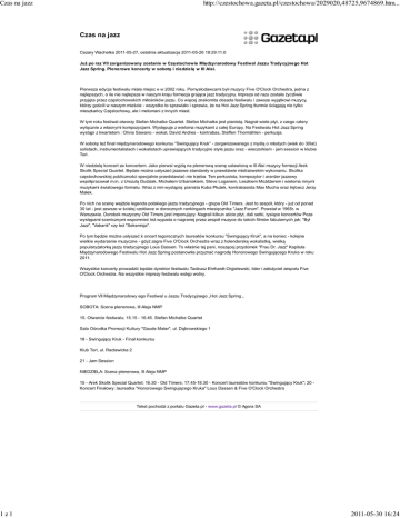 Czas na jazz 1z1 http://czestochowa.gazeta.pl/czestochowa/2029020,48725,9674869.htm... Czas na jazz Cezary Wachelka 2011-05-27, ostatnia aktualizacja 2011-05-26 19:29:11.0 Już po raz VII zorganizowany zostanie w Częstochowie Międzynarodowy Festiwal Jazzu Tradycyjnego Hot Jazz Spring. Plenerowe koncerty w sobotę i niedzielę w III Alei. Pierwsza edycja festiwalu miała miejsc e w 2002 roku. Pomysłodawcami byli muzycy Five O'Clock Orchestra, jedna z najlepszych, o ile nie najlepsza w naszym kraju formacja grająca jazz tradycyjny. Impreza od razu została życzliwie przyjęta przez częstochowskich miłośników jazzu. Co więcej znakomita obsada festiwalu i zawsze wyjątkowi muzycy, którzy gościli w naszym mieście - wszystko to sprawiało i sprawia, że na Hot Jazz Spring tłumnie ściągają nie tylko mieszkańcy Częstochowy, ale i melomani z innych miast. W tym roku festiwal otworzy Stefan Michalke Quartet. Stefan Michalke jest pianistą. Nagrał wiele płyt, z czego cztery wyłącznie z własnymi kompozycjami. Występuje z wieloma muzykami z całej Europy. Na Festiwalu Hot Jazz Spring wystąpi z kwartetem : Olivia Sawano - wokal, David Andres - kontrabas, Steffen Thormählen - perkusja. W sobotę też finał międzynarodowego konkursu "Swingujący Kruk" - zorganizowanego z myślą o młodych (wiek do 30lat) solistach, instrumentalistach i wokalistach uprawiających tradycyjne style jazzu oraz - wieczorkiem - jam session w klubie Tori. W niedzielę koncert za koncertem. Jako pierwsi wyjdą na plenerową scenę ustawioną w III Alei muzycy formacji Arek Skolik Special Quartet. Będzie można usłyszeć jazzowe standardy w prawdziwie mistrzowskim wykonaniu. Skolika częstochowskiej publiczności specjalnie przedstawiać nie trzeba. Ten perkusista, kompozytor i aranżer jazzowy współpracował m.in. z Urszulą Dudziak, Michałem Urbaniakiem, Steve Loganem, Leszkiem Możdżerem i wieloma innymi muzykami światowego formatu. Wraz z nim wystąpią: pianista Kuba Płużek, kontrabasista Max Mucha oraz trębacz Jerzy Małek. Po nich na scenę wejdzie legenda polskiego jazzu tradycyjnego - grupa Old Timers. Jest to zespół, który - już od ponad 30 lat - jest zawsze w ścisłej czołówce w dorocznych rankingach miesięcznika "Jazz Forum". Powstał w 1965r. w Warszawie. Dorobek muzyczny Old Timers jest imponujący. Nagrali kilkun aście płyt, dali setki, tysiące koncertów Poza występami scenicznymi wspomnieć też wypada o nagranej przez zespół muzyce do takich filmów fabularnych jak: "Był Jazz", "Vabank" czy też "Seksmisja". Po tym będzie można usłyszeć k oncert tegorocznych laureatów konkursu "Swingujący Kruk", a na koniec - kolejne wielkie wydarzenie muzyczne - gdyż zagra Five O'Clock Orchestra wraz z holenderską wokalistką, wielką popularyzatorką jazzu tradycyjnego Lous Dassen. To właśnie tej pani, noszącej przydomek "Frau Dr. Jazz" Kapituła Międzynarodowego Festiwalu Hot Jazz Spring postanowiła przyznać nagrodę Honorowego Swingującego Kruka w roku 2011. Wszystkie koncerty prowadzić będzie dyrektor festiwalu Tadeusz Ehrhardt-Orgielewski, lider i założyciel zespołu Five O'Clock Orchestra. Na wszystkie imprezy festiwalu wstęp wolny. Program VII Międzynarodowy ego Festiwal u Jazzu Tradycyjnego „Hot Jazz Spring „ SOBOTA: Scena plenerowa, III Aleja NMP 15. Otwarcie festiwalu; 15.15 - 16.45. Stefan Michalke Quartet Sala Ośrodka Promocji Kultury "Gaude Mater", ul. Dąbrowskiego 1 18 - Swingujący Kruk - Finał konkursu Klub Tori, ul. Racławicka 2 21 - Jam Session NIEDZIELA: Scena plenerowa, III Aleja NMP 15 - Arek Skolik Special Quartet; 16.30 - Old Timers; 17.45-18.30 - Koncert laureatów konkursu "Swingujący Kruk"; 20 Koncert Finałowy: laureatka "Honorowego Swingującego Kruka" Lous Dassen & Five O'Clock Orchestra Tekst pochodzi z portalu Gazeta.pl - www.gazeta.pl © Agora SA 2011-05-30 16:24
