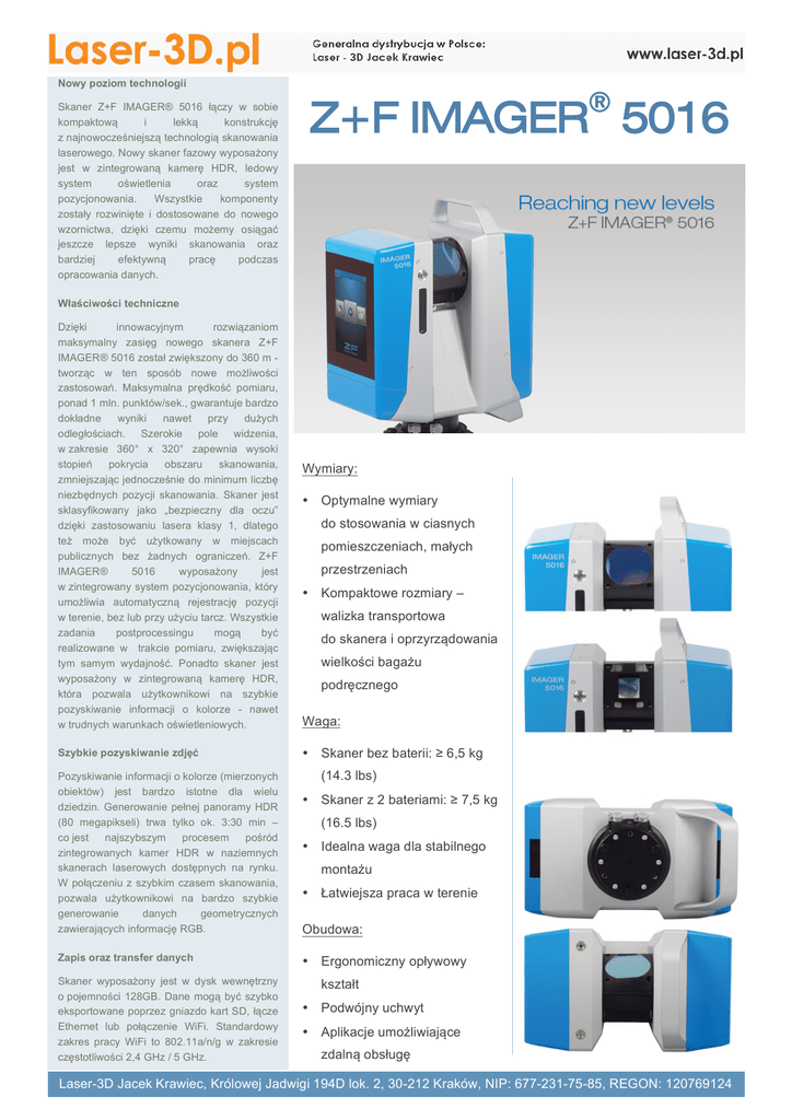1 2 Nowy poziom technologii Skaner Z+F IMAGER® 5016 łączy w sobie kompaktową i lekką konstrukcję z najnowocześniejszą technologią skanowania laserowego. Nowy skaner fazowy wyposażony jest w zintegrowaną kamerę HDR, ledowy system oświetlenia oraz system pozycjonowania. Wszystkie komponenty zostały rozwinięte i dostosowane do nowego wzornictwa, dzięki czemu możemy osiągać jeszcze lepsze wyniki skanowania oraz bardziej efektywną pracę podczas opracowania danych. Z+F IMAGER® 5016 Właściwości techniczne Dzięki innowacyjnym rozwiązaniom maksymalny zasięg nowego skanera Z+F IMAGER® 5016 został zwiększony do 360 m tworząc w ten sposób nowe możliwości zastosowań. Maksymalna prędkość pomiaru, ponad 1 mln. punktów/sek., gwarantuje bardzo dokładne wyniki nawet przy dużych odległościach. Szerokie pole widzenia, w zakresie 360° x 320° zapewnia wysoki stopień pokrycia obszaru skanowania, zmniejszając jednocześnie do minimum liczbę niezbędnych pozycji skanowania. Skaner jest sklasyfikowany jako „bezpieczny dla oczu” dzięki zastosowaniu lasera klasy 1, dlatego też może być użytkowany w miejscach publicznych bez żadnych ograniczeń. Z+F IMAGER® 5016 wyposażony jest w zintegrowany system pozycjonowania, który umożliwia automatyczną rejestrację pozycji w terenie, bez lub przy użyciu tarcz. Wszystkie zadania postprocessingu mogą być realizowane w trakcie pomiaru, zwiększając tym samym wydajność. Ponadto skaner jest wyposażony w zintegrowaną kamerę HDR, która pozwala użytkownikowi na szybkie pozyskiwanie informacji o kolorze - nawet w trudnych warunkach oświetleniowych. Szybkie pozyskiwanie zdjęć Pozyskiwanie informacji o kolorze (mierzonych obiektów) jest bardzo istotne dla wielu dziedzin. Generowanie pełnej panoramy HDR (80 megapikseli) trwa tylko ok. 3:30 min – co jest najszybszym procesem pośród zintegrowanych kamer HDR w naziemnych skanerach laserowych dostępnych na rynku. W połączeniu z szybkim czasem skanowania, pozwala użytkownikowi na bardzo szybkie generowanie danych geometrycznych zawierających informację RGB. Zapis oraz transfer danych Skaner wyposażony jest w dysk wewnętrzny o pojemności 128GB. Dane mogą być szybko eksportowane poprzez gniazdo kart SD, łącze Ethernet lub połączenie WiFi. Standardowy zakres pracy WiFi to 802.11a/n/g w zakresie częstotliwości 2,4 GHz / 5 GHz. Wymiary: • Optymalne wymiary do stosowania w ciasnych pomieszczeniach, małych przestrzeniach • Kompaktowe rozmiary – walizka transportowa do skanera i oprzyrządowania wielkości bagażu podręcznego Waga: • Skaner bez baterii: ≥ 6,5 kg (14.3 lbs) • Skaner z 2 bateriami: ≥ 7,5 kg (16.5 lbs) • Idealna waga dla stabilnego montażu • Łatwiejsza praca w terenie Obudowa: • Ergonomiczny opływowy kształt • Podwójny uchwyt • Aplikacje umożliwiające zdalną obsługę Laser-3D Jacek Krawiec, Królowej Jadwigi 194D lok. 2, 30-212 Kraków, NIP: 677-231-75-85, REGON: 120769124