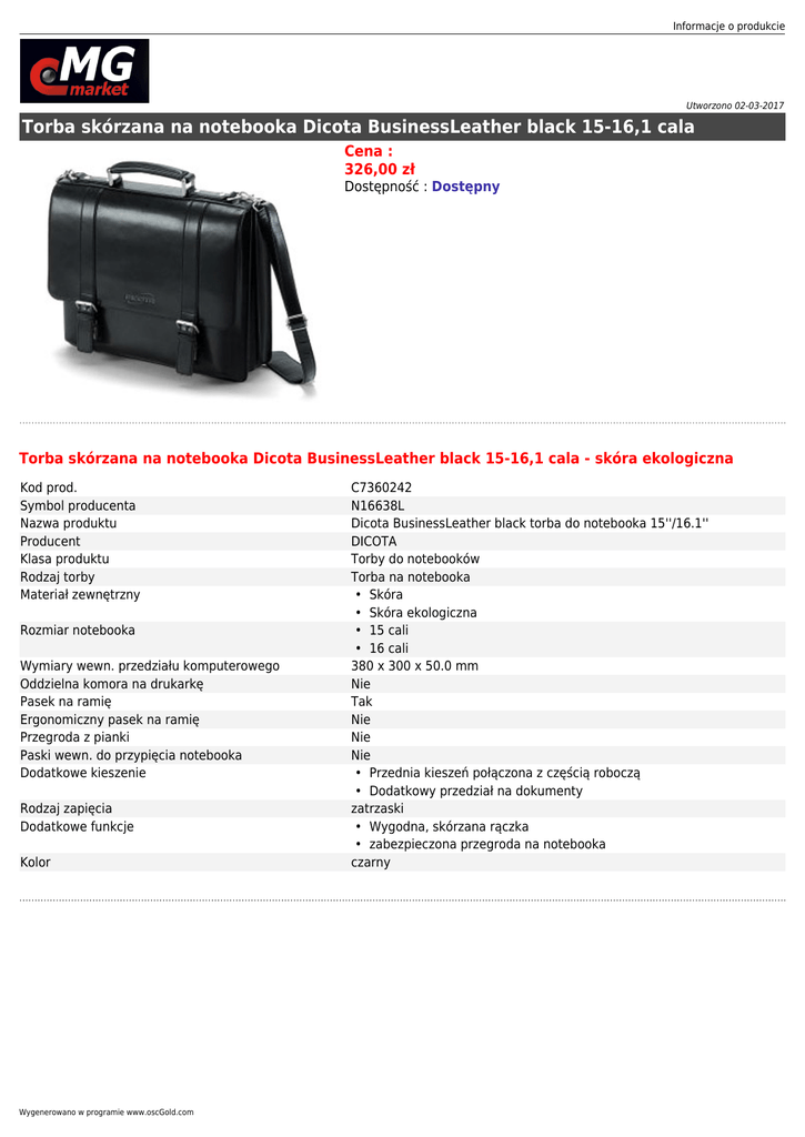 Informacje o produkcie Utworzono 02-03-2017 Torba skórzana na notebooka Dicota BusinessLeather black 15-16,1 cala Cena : 326,00 zł Dostępność : Dostępny Torba skórzana na notebooka Dicota BusinessLeather black 15-16,1 cala - skóra ekologiczna Kod prod. Symbol producenta Nazwa produktu Producent Klasa produktu Rodzaj torby Materiał zewnętrzny Rozmiar notebooka Wymiary wewn. przedziału komputerowego Oddzielna komora na drukarkę Pasek na ramię Ergonomiczny pasek na ramię Przegroda z pianki Paski wewn. do przypięcia notebooka Dodatkowe kieszenie Rodzaj zapięcia Dodatkowe funkcje Kolor Wygenerowano w programie www.oscGold.com C7360242 N16638L Dicota BusinessLeather black torba do notebooka 15''/16.1'' DICOTA Torby do notebooków Torba na notebooka • Skóra • Skóra ekologiczna • 15 cali • 16 cali 380 x 300 x 50.0 mm Nie Tak Nie Nie Nie • Przednia kieszeń połączona z częścią roboczą • Dodatkowy przedział na dokumenty zatrzaski • Wygodna, skórzana rączka • zabezpieczona przegroda na notebooka czarny