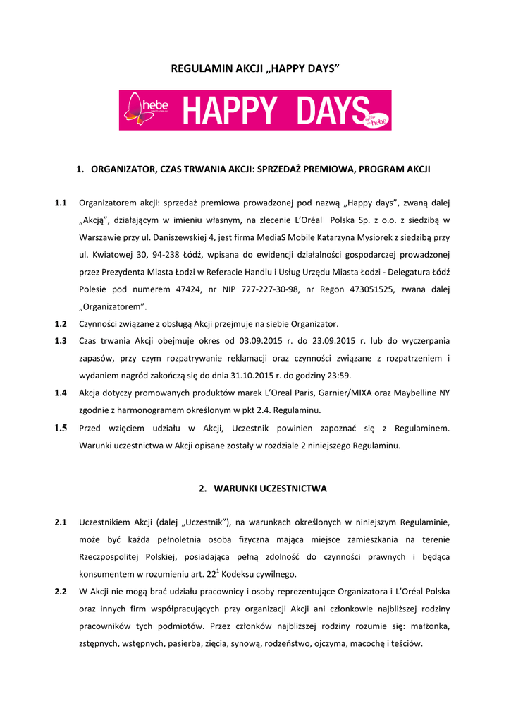 REGULAMIN AKCJI „HAPPY DAYS” 1. ORGANIZATOR, CZAS TRWANIA AKCJI: SPRZEDAŻ PREMIOWA, PROGRAM AKCJI 1.1 Organizatorem akcji: sprzedaż premiowa prowadzonej pod nazwą „Happy days”, zwaną dalej „Akcją”, działającym w imieniu własnym, na zlecenie L’Oréal Polska Sp. z o.o. z siedzibą w Warszawie przy ul. Daniszewskiej 4, jest firma MediaS Mobile Katarzyna Mysiorek z siedzibą przy ul. Kwiatowej 30, 94-238 Łódź, wpisana do ewidencji działalności gospodarczej prowadzonej przez Prezydenta Miasta Łodzi w Referacie Handlu i Usług Urzędu Miasta Łodzi - Delegatura Łódź Polesie pod numerem 47424, nr NIP 727-227-30-98, nr Regon 473051525, zwana dalej „Organizatorem”. 1.2 Czynności związane z obsługą Akcji przejmuje na siebie Organizator. 1.3 Czas trwania Akcji obejmuje okres od 03.09.2015 r. do 23.09.2015 r. lub do wyczerpania zapasów, przy czym rozpatrywanie reklamacji oraz czynności związane z rozpatrzeniem i wydaniem nagród zakończą się do dnia 31.10.2015 r. do godziny 23:59. 1.4 Akcja dotyczy promowanych produktów marek L’Oreal Paris, Garnier/MIXA oraz Maybelline NY zgodnie z harmonogramem określonym w pkt 2.4. Regulaminu. 1.5 Przed wzięciem udziału w Akcji, Uczestnik powinien zapoznać się z Regulaminem. Warunki uczestnictwa w Akcji opisane zostały w rozdziale 2 niniejszego Regulaminu. 2. WARUNKI UCZESTNICTWA 2.1 Uczestnikiem Akcji (dalej „Uczestnik”), na warunkach określonych w niniejszym Regulaminie, może być każda pełnoletnia osoba fizyczna mająca miejsce zamieszkania na terenie Rzeczpospolitej Polskiej, posiadająca pełną zdolność do czynności prawnych i będąca konsumentem w rozumieniu art. 221 Kodeksu cywilnego. 2.2 W Akcji nie mogą brać udziału pracownicy i osoby reprezentujące Organizatora i L’Oréal Polska oraz innych firm współpracujących przy organizacji Akcji ani członkowie najbliższej rodziny pracowników tych podmiotów. Przez członków najbliższej rodziny rozumie się: małżonka, zstępnych, wstępnych, pasierba, zięcia, synową, rodzeństwo, ojczyma, macochę i teściów. 2.3 Warunkiem udziału w Akcji jest zakup w sklepie drogeryjnym HEBE przez Uczestnika 2 produktów promowanych w danym tygodniu. Drugi tańszy produkt Uczestnik otrzymuje za ½ ceny. 2.4 Tygodnie promowane są następujące: 3-9 wrzesień - tydzień makijażu L’Oreal Paris oraz Maybelline NY 10-16 wrzesień – tydzień pielęgnacji twarzy L’Oreal Paris, Garnier i MIXA 17-23 wrzesień – tydzień pielęgnacji włosów i koloryzacji L’Oreal Paris oraz Garnier. 2.5 Uczestnik, który łącznie podczas trzech tygodni akcji zbierze paragony na kwotę 100 zł i prześle ich zdjęcia wraz z formularzem zgłoszeniowym stanowiącym załącznik nr 1 do Regulaminu, na adres mailowy - [email protected], otrzyma zestaw kosmetyków (zwany dalej: „Nagrodą”) w skład w którego wchodzą: płyn micelarny Garnier, olejek do twarzy Nutri Gold, olejek do włosów Elseve, tusz do rzęs Lash Sensational, lakier do paznokci firmy L’Oreal. Wartość zestawu to 130 zł. 2.6 Ilość Nagród w Akcji jest ograniczona i wynosi 2000 tysiące sztuk. 2.7 Przed wzięciem udziału w Akcji Uczestnik zobowiązany jest do zapoznania się z Regulaminem i zaakceptowania go 2.8 Zobowiązanym do wręczenia Nagrody jest Organizator Akcji. 2.9 Uprawniony nie może żądać od Organizatora wypłacenia mu równowartości Nagrody w postaci ekwiwalentu pieniężnego ani zamiany na inna nagrodę. 2.10 Nagrody zostaną przekazane przesyłką kurierską, pod adres podanym w formularzu zgłoszeniowym w ciągu dwóch tygodni od daty przesłania zgłoszenia. 2.11 Organizator nie ponosi odpowiedzialności za nieprawidłowości związane z niedoręczeniem nagrody wynikające z błędnego adresu podanego przez Uczestnika. W takim przypadku Uczestnik traci prawo do nagrody, która przechodzi na własność Organizatora. 3. DANE OSOBOWE 3.1 Administratorem danych osobowych Uczestników Akcji („Dane”) jest L’Oréal Polska Sp. z o.o. z siedzibą w Warszawie (03-230) przy ul. Daniszewskiej 4, zarejestrowana w rejestrze przedsiębiorców przez Sąd Rejonowy dla m. st. Warszawy w Warszawie, XIII Wydział Gospodarczy Krajowego Rejestru Sądowego, nr KRS 0000063684, NIP: 5240303375, kapitał zakładowy 1 886 500,00 ZŁ. 3.2 Dane będą zbierane i przetwarzane w celu prawidłowego przeprowadzenia Akcji, w tym także w celu ewentualnego dochodzenia roszczeń związanych z uczestnictwem w Akcji. Informujemy, iż poza podmiotami uprawnionymi na podstawie przepisów prawa, zebrane dane osobowe nie będą udostępniane. 3.3 Uczestnik ma prawo dostępu do treści swoich danych oraz do ich poprawiania, a także żądania ich usunięcia. 3.4 Dane podawane są dobrowolnie, jednak ich niepodanie przez Uczestnika lub niewyrażenie przez niego zgody na ich przetworzenie w celu niezbędnym dla przeprowadzenia Akcji uniemożliwia jego uczestnictwo w Akcji. 4. 4.1. REKLAMACJE Reklamacje związane z Akcją mogą być zgłaszane w formie pisemnej na adres MediaS Mobile, ul. Kwiatowa 30 94-238 Łódź, najpóźniej w terminie do dnia 12 października 2015 r. O zachowaniu terminu do wniesienia reklamacji decyduje data stempla pocztowego. W terminie 14 dni od dnia otrzymania reklamacji Organizator rozpatrzy reklamację. 4.2. Reklamacja powinna zawierać: imię, nazwisko, dokładny adres Uczestnika oraz przyczynę reklamacji. 4.3. Organizator zastrzega sobie prawo zwrócenia się do uczestnika z prośbą o udzielenie dodatkowych wyjaśnień, co do przedmiotu i treści reklamacji. 4.4. Złożenie reklamacji na podstawie niniejszego Regulaminu nie wyklucza prawa Uczestnika do dochodzenia roszczeń na zasadach określonych w obowiązujących przepisach. 5. POSTANOWIENIA KOŃCOWE 5.1. Niniejszy Regulamin jest dostępny w siedzibie Organizatora oraz na stronie internetowej www.hebe.pl. 5.2. W sprawach nieunormowanych w niniejszym Regulaminie zastosowanie mają przepisy ustawy z dnia 23 kwietnia 19