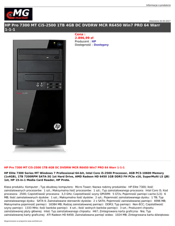 Informacje o produkcie Utworzono 02-03-2017 HP Pro 7300 MT Ci5-2500 1TB 4GB DC DVDRW MCR R6450 Win7 PRO 64 Warr 1-1-1 Cena : 2.896,99 zł Producent : HP Dostępność : Dostępny HP Pro 7300 MT Ci5-2500 1TB 4GB DC DVDRW MCR R6450 Win7 PRO 64 Warr 1-1-1 HP Elite 7300 Series MT Windows 7 Professional 64-bit, Intel Core i5-2500 Processor, 4GB PC3-10600 Memory (1x4GB), 1TB 7200RPM SATA-3G 1st Hard Drive, AMD Radeon HD 6450 1GB DDR3 FH PCIe x16, SuperMulti LS (JB) 1st, HP 15-in-1 Media Card Reader, HP Prote. Klasa produktu: Komputer ; Typ obudowy komputera: Micro Tower; Nazwa rodziny produktów: HP Elite 7300; Ilość zainstalowanych procesorów: 1 szt.; Maksymalna ilość procesorów: 1 szt.; Typ zainstalowanego procesora: Intel Core i5; Kod procesora: 2500; Częstotliwość procesora: 3,3 GHz; Częstotliwość szyny QPI/DMI: 5 GT/s; Pojemność pamięci cache [L3]: 6 MB; Ilość zainstalowanych dysków: 1 szt.; Maksymalna ilość dysków: 2 szt.; Pojemność zainstalowanego dysku: 1 TB; Typ zainstalowanego dysku: SATA II; Zainstalowane sterowniki dysków: 2 x SATA; Pojemność zainstalowanej pamięci: 4096 MB; Maksymalna pojemność pamięci: 16384 MB; Rodzaj zainstalowanej pamięci: DDR3; Typ pamięci: Non-ECC; Częstotliwość szyny pamięci: 1333 MHz; Ilość banków pamięci: 4 szt.; Ilość wolnych banków pamięci: 3 szt.; Producent chipsetu zainstalowanej płyty głównej: Intel; Typ zainstalowanego chipsetu: H67; Zintegrowana karta graficzna: Nie; Typ zainstalowanej karty graficznej: ATI Radeon HD 6450; Zainstalowana pamięć wideo: 1024 MB; Zintegrowana karta dźwiękowa: Wygenerowano w programie www.oscGold.com Tak; Typ zintegrowanej karty dźwiękowej: High Definition Audio; Zintegrowana karta sieciowa: Tak; Typ zintegrowanej karty sieciowej: 10/100/1000 Mbit/s; Bezprzewodowa karta sieciowa: Nie; Bluetooth: Nie; Ilość slotów AGP: 0 szt.; Ilość wolnych slotów AGP: 0 szt.; Ilość slotów PCI: 0 szt.; Ilość wolnych slotów PCI: 0 szt.; Ilość slotów PCI-E 1x: 3 szt.; Ilość wolnych slotów PCI-E 1x: 3 szt.; Ilość slotów PCI-E 4x: 0 szt.; Ilość slotów PCI-E 8x: 0 szt.; Ilość slotów PCI-E 16x: 1 szt.; Ilość wolnych slotów PCI-E 16x: 0 szt.; Ilość slotów PCI-X 64-bit/100MHz Non Hot Plug: 0 szt.; Ilość slotów PCI-X 64-bit/133MHz Non Hot Plug: 0 szt.; Dodatkowe informacje n/t slotów PCI: 1 x slot PCI-E 16x (standard), 3 x slot PCI-E 1x (standard); Ilość wolnych kieszeni 3,5 (zewnętrznych): 0 szt.; Ilość wolnych kieszeni 3,5 slim (zewnętrznych): 0 szt.; Ilość wolnych kieszeni 3,5 (wewnętrznych): 1 szt.; Ilość wolnych kieszeni 5,25 (zewnętrznych): 1 szt.; Interfejsy: 2 x DVI (wyjście na monitor), 12 x USB 2.0, 2 x USB 3.0, 1 x RJ-45 (LAN), 1 x wyjście słuchawkowe (na froncie obudowy), 1 x wejście na mikrofon (na froncie obudowy), 1 x wejście na mikrofon, 1 x wejście liniowe, 1 x wyjście liniowe; Dodatkowe informacje o portach USB 2.0/3.0: 4 x USB 2.0 (tylny panel), 2 x USB 2.0 (przedni panel), 2 x USB 3.0 (przedni panel), 6 x USB 2.0 (opcja); Napędy wbudowane (zainstalowane): DVD±RW Super Multi (+ DVD-RAM) Dual Layer LightScribe; Moc zasilacza (zasilaczy): 300 Wat; Typ PFC (Power Factor Correction): aktywny; System operacyjny: Microsoft Windows 7 Professional PL/ENG 64-bit; Dołączone wyposażenie: Czytnik kart pamięci 15-in-1 (zainstalowany w kieszeni 3,5"); Szerokość: 165 mm; Wysokość: 365 mm; Głębokość: 373 mm; Masa netto: 9,6 kg. Gwarancja producenta - 12 miesięcy.