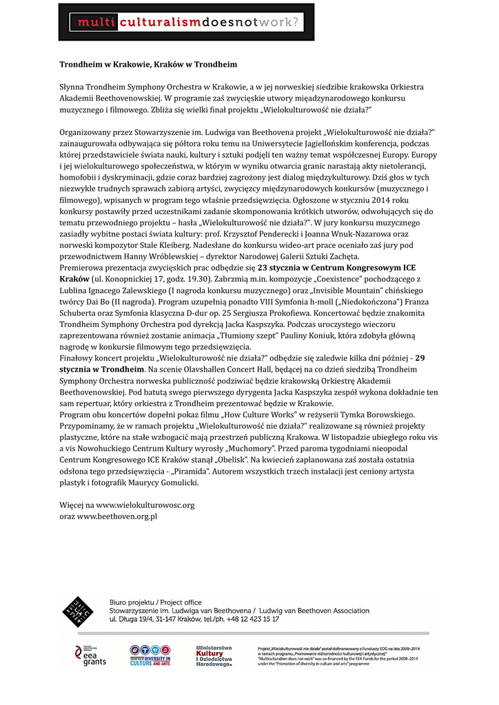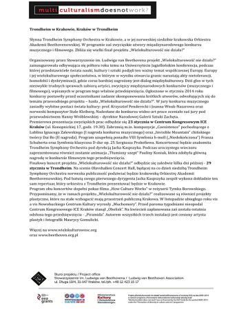 Trondheim w Krakowie, Kraków w Trondheim Słynna Trondheim Symphony Orchestra w Krakowie, a w jej norweskiej siedzibie krakowska Orkiestra Akademii Beethovenowskiej. W programie zaś zwycięskie utwory mięadzynarodowego konkursu muzycznego i filmowego. Zbliża się wielki finał projektu „Wielokulturowość nie działa?” Organizowany przez Stowarzyszenie im. Ludwiga van Beethovena projekt „Wielokulturowość nie działa?” zainaugurowała odbywająca się półtora roku temu na Uniwersytecie Jagiellońskim konferencja, podczas której przedstawiciele świata nauki, kultury i sztuki podjęli ten ważny temat współczesnej Europy. Europy i jej wielokulturowego społeczeństwa, w którym w wyniku otwarcia granic narastają akty nietolerancji, homofobii i dyskryminacji, gdzie coraz bardziej zagrożony jest dialog międzykulturowy. Dziś głos w tych niezwykle trudnych sprawach zabiorą artyści, zwycięzcy międzynarodowych konkursów (muzycznego i filmowego), wpisanych w program tego właśnie przedsięwzięcia. Ogłoszone w styczniu 2014 roku konkursy postawiły przed uczestnikami zadanie skomponowania krótkich utworów, odwołujących się do tematu przewodniego projektu – hasła „Wielokulturowość nie działa?". W jury konkursu muzycznego zasiadły wybitne postaci świata kultury: prof. Krzysztof Penderecki i Joanna Wnuk-Nazarowa oraz norweski kompozytor Stale Kleiberg. Nadesłane do konkursu wideo-art prace oceniało zaś jury pod przewodnictwem Hanny Wróblewskiej – dyrektor Narodowej Galerii Sztuki Zachęta. Premierowa prezentacja zwycięskich prac odbędzie się 23 stycznia w Centrum Kongresowym ICE Kraków (ul. Konopnickiej 17, godz. 19.30). Zabrzmią m.in. kompozycje „Coexistence” pochodzącego z Lublina Ignacego Zalewskiego (I nagroda konkursu muzycznego) oraz „Invisible Mountain” chińskiego twórcy Dai Bo (II nagroda). Program uzupełnią ponadto VIII Symfonia h-moll („Niedokończona”) Franza Schuberta oraz Symfonia klasyczna D-dur op. 25 Sergiusza Prokofiewa. Koncertować będzie znakomita Trondheim Symphony Orchestra pod dyrekcją Jacka Kaspszyka. Podczas uroczystego wieczoru zaprezentowana również zostanie animacja „Tłumiony szept” Pauliny Koniuk, która zdobyła główną nagrodę w konkursie filmowym tego przedsięwzięcia. Finałowy koncert projektu „Wielokulturowość nie działa?” odbędzie się zaledwie kilka dni później - 29 stycznia w Trondheim. Na scenie Olavshallen Concert Hall, będącej na co dzień siedzibą Trondheim Symphony Orchestra norweska publiczność podziwiać będzie krakowską Orkiestrę Akademii Beethovenowskiej. Pod batutą swego pierwszego dyrygenta Jacka Kaspszyka zespół wykona dokładnie ten sam repertuar, który orkiestra z Trondheim prezentować będzie w Krakowie. Program obu koncertów dopełni pokaz filmu „How Culture Works” w reżyserii Tymka Borowskiego. Przypominamy, że w ramach projektu „Wielokulturowość nie działa?” realizowane są również projekty plastyczne, które na stałe wzbogacić mają przestrzeń publiczną Krakowa. W listopadzie ubiegłego roku vis a vis Nowohuckiego Centrum Kultury wyrosły „Muchomory”. Przed paroma tygodniami nieopodal Centrum Kongresowego ICE Kraków stanął „Obelisk”. Na kwiecień zaplanowana zaś została ostatnia odsłona tego przedsięwzięcia - „Piramida”. Autorem wszystkich trzech instalacji jest ceniony artysta plastyk i fotografik Maurycy Gomulicki. Więcej na www.wielokulturowosc.org oraz www.beethoven.org.pl