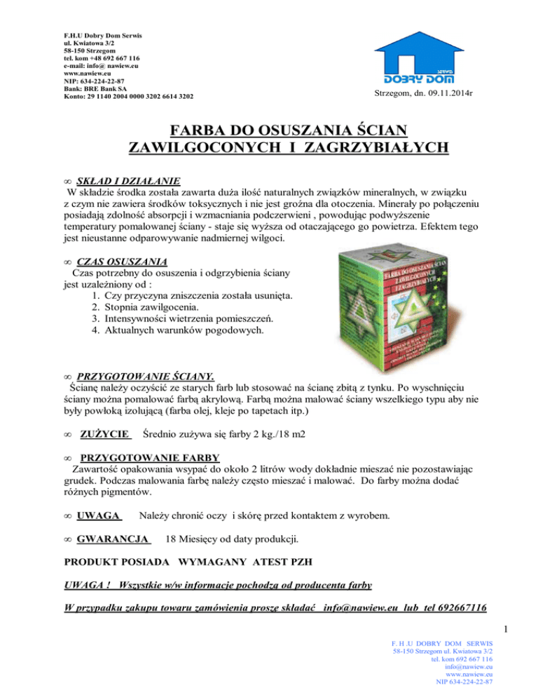 F.H.U Dobry Dom Serwis ul. Kwiatowa 3/2 58-150 Strzegom tel. kom +48 692 667 116 e-mail: info@ nawiew.eu www.nawiew.eu NIP: 634-224-22-87 Bank: BRE Bank SA Konto: 29 1140 2004 0000 3202 6614 3202 Strzegom, dn. 09.11.2014r FARBA DO OSUSZANIA ŚCIAN ZAWILGOCONYCH I ZAGRZYBIAŁYCH • SKŁAD I DZIAŁANIE W składzie środka została zawarta duŜa ilość naturalnych związków mineralnych, w związku z czym nie zawiera środków toksycznych i nie jest groźna dla otoczenia. Minerały po połączeniu posiadają zdolność absorpcji i wzmacniania podczerwieni , powodując podwyŜszenie temperatury pomalowanej ściany - staje się wyŜsza od otaczającego go powietrza. Efektem tego jest nieustanne odparowywanie nadmiernej wilgoci. • CZAS OSUSZANIA Czas potrzebny do osuszenia i odgrzybienia ściany jest uzaleŜniony od : 1. Czy przyczyna zniszczenia została usunięta. 2. Stopnia zawilgocenia. 3. Intensywności wietrzenia pomieszczeń. 4. Aktualnych warunków pogodowych. • PRZYGOTOWANIE ŚCIANY. Ścianę naleŜy oczyścić ze starych farb lub stosować na ścianę zbitą z tynku. Po wyschnięciu ściany moŜna pomalować farbą akrylową. Farbą moŜna malować ściany wszelkiego typu aby nie były powłoką izolującą (farba olej, kleje po tapetach itp.) • ZUśYCIE Średnio zuŜywa się farby 2 kg./18 m2 • PRZYGOTOWANIE FARBY Zawartość opakowania wsypać do około 2 litrów wody dokładnie mieszać nie pozostawiając grudek. Podczas malowania farbę naleŜy często mieszać i malować. Do farby moŜna dodać róŜnych pigmentów. • UWAGA NaleŜy chronić oczy i skórę przed kontaktem z wyrobem. • GWARANCJA 18 Miesięcy od daty produkcji. PRODUKT POSIADA WYMAGANY ATEST PZH UWAGA ! Wszystkie w/w informacje pochodzą od producenta farby W przypadku zakupu towaru zamówienia proszę składać [email protected] lub tel 692667116 1 F. H .U DOBRY DOM SERWIS 58-150 Strzegom ul. Kwiatowa 3/2 tel. kom 692 667 116 [email protected] www.nawiew.eu NIP 634-224-22-87