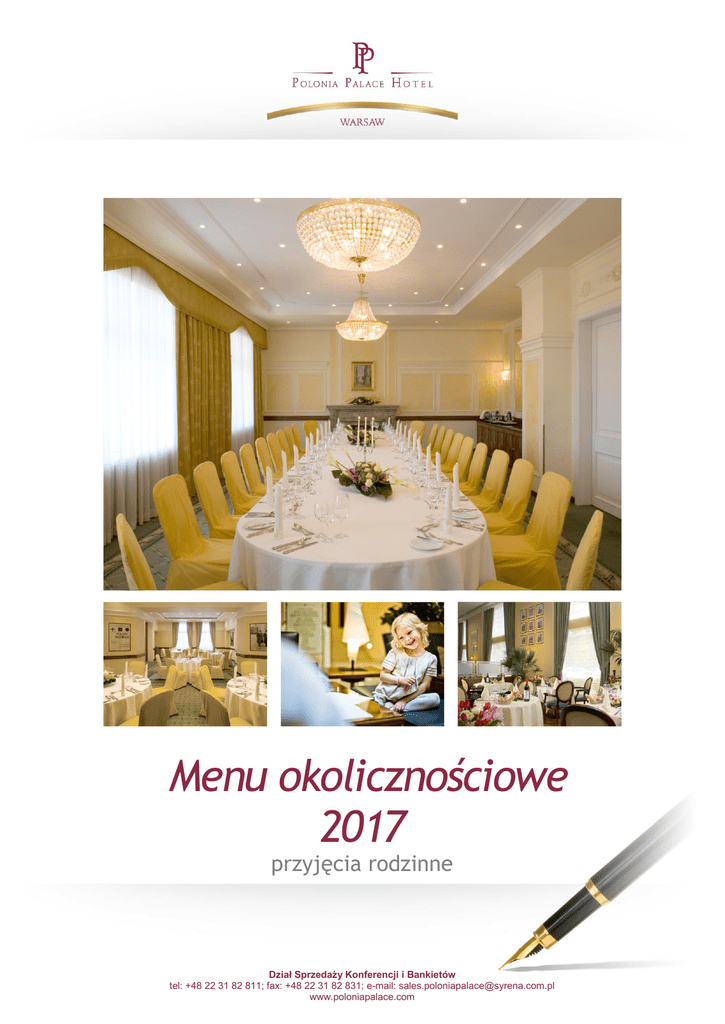 Menu okolicznościowe 2017 przyjęcia rodzinne Dział Sprzedaży Konferencji i Bankietów tel: +48 22 31 82 811; fax: +48 22 31 82 831; e-mail: [email protected] www.poloniapalace.com Menu klasyczne 130 PLN Podane ceny są cenami brutto za osobę. Oferta dla minimum 20 osób. Przekąski zimne Pieczony rostbef z roszponką, szparagami i marynowanymi w occie balsamicznym burakami Plastry łososia norweskiego ułożone na carpaccio z ogórka, chilli i kopru Domowy pasztet z gęsi z prawdziwkami i żurawiną z marynowanymi węgierkami Wybór warzyw pieczonych na grillu skropionych emulsją z ziół prowansalskich i oliwy Sałatka Piccolo Mateo z rukoli, grillowanej papryki, avocado, kurek i płatków sera Parmigiano Reggiano Sałatka orientalna z wieprzowiny, sezamu i makaronu ryżowego Sałatka nicejska z marynowanymi ziemniakami, warzywami, jajkiem i tuńczykiem Wybór świeżo wypiekanego pieczywa z masłem Zupy Consommé wołowe z ziołowym naleśnikiem i warzywami Julien lub W SEZONIE krem z białych szparagów oprószony migdałami (Prosimy organizatora o wybór jednego dania dla każdego gościa) Dania główne Eskalopki z polędwiczek wieprzowych w sosie maderowym z zielonym pieprzem i tymiankiem, pieczoną polentą i warzywami z grilla Dział Sprzedaży Konferencji i Bankietów tel: +48 22 31 82 811; fax: +48 22 31 82 831; e-mail: [email protected] www.poloniapalace.com Menu dla dzieci Rosół z domowym makaronem Chrupiące paluszki z kurczaka z młodą marchewką i frytkami Desery Ciasto marchewkowe z cynamonem Puszysta szarlotka z kremem Sernik z białą czekoladą Menu rozszerzone 160 PLN Podane ceny są cenami brutto za osobę. Oferta dla minimum 20 osób. Przekąski zimne Szparagi z suszoną szynką i truskawkami Pieczony schab wieprzowy w miodzie, orzechach włoskich i kruszonym zielonym pieprzu z gruszką w czerwonym winie i wiśniami w Grappa di Amarone Carpaccio z wołowiny à la Cypriani Galantyna drobiowa z pistacjami i brzoskwinią Wędzona pierś gęsi glazurowana emulsją z czarnej porzeczki i likieru Crème de Cassis na musie z jabłek aromatyzowanym Calvadosem Carpaccio z łososia na emulsji z bazylii Trufle z sera pleśniowego w kruszonych włoskich orzechach na emulsji z czarnej porzeczki Sałatka z kalmarów, bobu, selera naciowego i orzechów ziemnych Sałatka normandzka z serem Brie, gruszkami i cykorią Sałatka nicejska z marynowanymi ziemniakami, warzywami, jajkiem i tuńczykiem Wybór świeżo wypiekanego pieczywa z masłem Dział Sprzedaży Konferencji i Bankietów tel: +48 22 31 82 811; fax: +48 22 31 82 831; e-mail: [email protected] www.poloniapalace.com Zupy Krem z prawdziwków dekorowany musem z miodem akacjowym i pudrem z kasztanów lub W SEZONIE krem z białych szparagów oprószony migdałami (Prosimy organizatora o wybór jednego dania dla każdego gościa) Dania główne Filet z halibuta zapieczony z kruszonką z ziół w sosie z pomidorów koktajlowych, białego wina i szafranu na purée z zielonego groszku i chilli lub Pieczona kaczka w sosie z pomarańczy aromatyzowanym likierem Cointreau z karmelizowanymi jabłkami, ziemniakami au gratin i brokułami (Prosimy organizatora o wybór jednego dania dla każdego gościa) Menu dla dzieci Rosół z domowym makaronem Chrupiące paluszki z kurczaka z młodą marchewką i frytkami Desery Tartoletki z musem cytrynowym i bezą Tort czarny las Sernik połączony z makiem Puszysta szarlotka z kremem Ciasto czekoladowe z orzechami Dodatkowo oferujemy: Fontannę czekoladową z owocami i słodkościami 750 PLN Dział Sprzedaży Konferencji i Bankietów tel: +48 22 31 82 811; fax: +48 22 31 82 831; e-mail: [email protected] www.poloniapalace.com Pakiety napoi Wszystkie podane ceny są cenami brutto i obowiązują tylko w pakiecie okolicznościowym. Pakiet 01 nielimitowana konsumpcja do 4 godzin 30 PLN brutto od osoby nielimitowana konsumpcja do 6 godzin 40 PLN brutto od osoby Bezalkoholowe napoje gazowane: Pepsi, Mirinda, 7up Wybór soków owocowych: pomarańczowy, jabłkowy, czarna porzeczka, grapefruit Woda mineralna gazowana i niegazowana Wybór świeżo mielonych kaw: Espresso, Caffé Crema, Cappuccino, Caffé Latte Gorąca czekolada Wybór herbat Eilles Pakiet 02 nielimitowana konsumpcja do 4 godzin 55 PLN brutto od osoby nielimitowana konsumpcja do 6 godzin 65 PLN brutto od osoby Wino domowe białe i czerwone Piwo Żywiec Bezalkoholowe napoje gazowane: Pepsi, Mirinda, 7up Wybór soków owocowych: pomarańczowy, jabłkowy, czarna porzeczka, grapefruit Woda mineralna gazowana i niegazowana Wybór świeżo mielonych kaw: Espresso, Caffé Crema, Cappuccino, Caffé Latte Gorąca czekolada Wybór herbat Eilles Dział Sprzedaży Konferencji i Bankietów tel: +48 22 31 82 811; fax: +48 22 31 82 831; e-mail: [email protected] www.poloniapalace.com Pakiet 03 nielimitowana konsumpcja do 4 godzin 75 PLN brutto od osoby nielimitowana konsumpcja do 6 godzin 85 PLN brutto od osoby Wódka Wyborowa/ Bols Platinum Wino domowe białe i czerwone Piwo Żywiec Bezalkoholowe napoje gazowane: Pepsi, Mirinda, 7up Wybór soków owocowych: pomarańczowy, jabłkowy, czarna porzeczka, grapefruit Woda mineralna gazowana i niegazowana Wybór świeżo mielonych kaw: Espresso, Caffé Crema, Cappuccino, Caffé Latte Gorąca czekolada Wybór herbat Eilles Pakiet 04 nielimitowana konsumpcja do 4 godzin 110 PLN brutto od osoby nielimitowana konsumpcja do 6 godzin 155 PLN brutto od osoby Wino musujące (kieliszek powitalny) Jack Daniels Gin Finsbury Campari Havana Rum 3 yo Martini Extra Dry, Bianco, Rosso Żubrówka Palona Soplica malinowa, pigwowa, orzech laskowy Wódka Wyborowa/Bols Platinum Wino domowe białe i czerwone Piwo Żywiec Bezalkoholowe napoje gazowane: Pepsi, Mirinda, 7up Wybór soków owocowych: pomarańczowy, jabłkowy, czarna porzeczka, grapefruit Woda mineralna gazowana i niegazowana Wybór świeżo mielonych kaw: Espresso, Caffé Crema, Cappuccino, Caffé Latte Gorąca czekolada Wybór herbat Eilles Dział Sprzedaży Konfer
