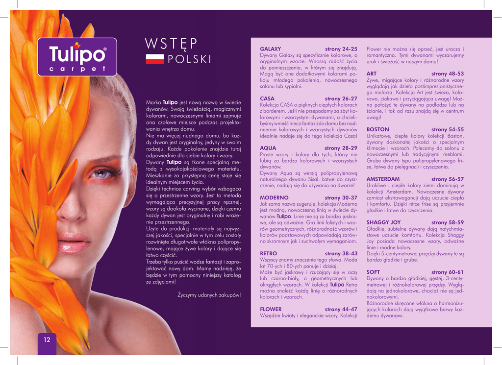 WSTĘP POLSKI Marka Tulipo jest nową nazwą w świecie dywanów. Swoją świeżością, magicznymi kolorami, nowoczesnymi liniami zajmuje ona czołowe miejsce podczas projektowania wnętrza domu. Nie ma więcej nudnego domu, bo każdy dywan jest oryginalny, jedyny w swoim rodzaju. Każde pokolenie znajdzie tutaj odpowiednie dla siebie kolory i wzory. Dywany Tulipo są tkane specjalną metodą z wysokojakościowego materiału. Mieszkanie za przystępną cenę staje się idealnym miejscem życia. Dzięki technice carving wybór wzbogaca się o przestrzenne wzory. Jest to metoda wymagająca precyzyjnej pracy ręcznej, wzory są dookoła wycinane, dzięki czemu każdy dywan jest oryginalny i robi wrażenie przestrzennego. Użyte do produkcji materiały są najwyższej jakości, specjalnie w tym celu zostały rozwinięte długotrwałe włókna polipropylenowe, mające żywe kolory i dające się łatwo czyścić. Trzeba tylko puścić wodze fantazji i zaprojektować nowy dom. Mamy nadzieję, że będzie w tym pomocny niniejszy katalog ze zdjęciami! Życzymy udanych zakupów! GALAXY strony 24-25 Dywany Galaxy są specyficznie kolorowe, o oryginalnym wzorze. Wnoszą radość życia do pomieszczenia, w którym się znajdują. Mogą być one dodatkowymi kolorami pokoju młodego pokolenia, nowoczesnego salonu lub sypialni. CASA strony 26-27 Kolekcja CASA o pięknych ciepłych kolorach z borderem. Jeśli nie przepadamy za zbyt kolorowymi i wzorzystymi dywanami, a chcielibyśmy wnieść nieco fantazji do domu bez nadmiernie kolorowych i wzorzystych dywanów idealnie nadaje się do tego kolekcja Casa! AQUA strony 28-29 Proste wzory i kolory dla tych, którzy nie lubią za bardzo kolorowych i wzorzystych dywanów. Dywany Aqua są wersją polipropylenową naturalnego dywanu Sisal. Łatwe do czyszczenie, nadają się do używania na dworze! MODERNO strony 30-37 Jak sama nazwa sugeruje, kolekcja Moderno jest modną, nowoczesną linią w świecie dywanów Tulipo. Linie nie są za bardzo jaskrawe, ale są odważne. Gra linii falistych i wzorów geometrycznych, różnorodność wzorów i kolorów podstawowych odpowiadają zarówno skromnym jak i zuchwałym wymaganiom. RETRO strony 38-43 Wszyscy znamy znaczenie tego słowa. Moda lat 70-ych i 80-ych panuje i dzisiaj. Może być jaskrawy i rzucający się w oczy lub czarno-biały, o geometrycznych lub okrągłych wzorach. W kolekcji Tulipo Retro można znaleźć każdą linię o różnorodnych kolorach i wzorach. FLOWER strony 44-47 Wszędzie kwiaty i eleganckie wzory. Kolekcji 12 Flower nie można się oprzeć, jest urocza i romantyczna. Tymi dywanami wyczarujemy urok i świeżość w naszym domu! ART strony 48-53 Żywe, migające kolory i różnorodne wzory wyglądają jak dzieło postimpresjonistycznego malarza. Kolekcja Art jest świeża, kolorowa, ciekawa i przyciągająca uwagę! Można położyć te dywany na podłodze lub na ścianie, i tak od razu znajdą się w centrum uwagi! BOSTON strony 54-55 Unikatowe, ciepłe kolory kolekcji Boston, dywany doskonałej jakości o specjalnym klimacie i wzorach. Polecamy do salonu z nowoczesnymi lub tradycyjnymi meblami. Grube dywany typu polipropylenowego frise, łatwe do pielęgnacji i czyszczenia. AMSTERDAM strony 56-57 Urokliwe i ciepłe kolory ziemi dominują w kolekcji Amsterdam. Nowoczesne dywany zamiast ekstrawagancji dają uczucie ciepła i komfortu. Dzięki nitce frise są przyjemnie gładkie i łatwe do czyszczenia. SHAGGY JOY strony 58-59 Gładkie, subtelne dywany dają natychmiastowe uczucie komfortu. Kolekcja Shaggy Joy posiada nowoczesne wzory, odważne linie i modne kolory. Dzięki 5-centymetrowej przędzy dywany te są bardzo gładkie i grube. SOFT strony 60-61 Dywany o bardzo gładkiej, gęstej, 3-centymetrowej i różnokolorowej przędzy. Wyglądają na jednokolorowe, chociaż nie są jednokolorowymi. Różnorodne skręcone włókna o harmonizujących kolorach dają wyjątkowe barwy każdemu dywanowi.