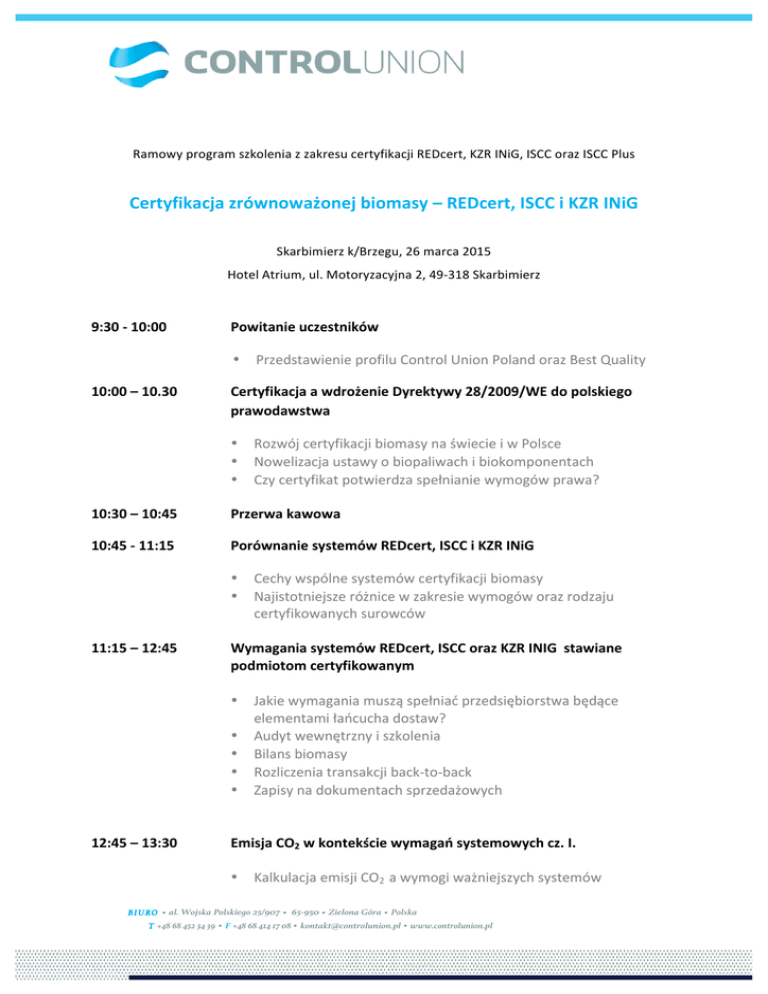 Ramowy program szkolenia z zakresu certyfikacji REDcert, KZR INiG, ISCC oraz ISCC Plus Certyfikacja zrównoważonej biomasy – REDcert, ISCC i KZR INiG Skarbimierz k/Brzegu, 26 marca 2015 Hotel Atrium, ul. Motoryzacyjna 2, 49-‐318 Skarbimierz 9:30 -‐ 10:00 Powitanie uczestników • 10:00 – 10.30 Przedstawienie profilu Control Union Poland oraz Best Quality Certyfikacja a wdrożenie Dyrektywy 28/2009/WE do polskiego prawodawstwa 10:30 – 10:45 Rozwój certyfikacji biomasy na świecie i w Polsce Nowelizacja ustawy o biopaliwach i biokomponentach Czy certyfikat potwierdza spełnianie wymogów prawa? Przerwa kawowa 10:45 -‐ 11:15 Porównanie systemów REDcert, ISCC i KZR INiG • • • • • 11:15 – 12:45 Wymagania systemów REDcert, ISCC oraz KZR INIG stawiane podmiotom certyfikowanym • • • • • 12:45 – 13:30 Cechy wspólne systemów certyfikacji biomasy Najistotniejsze różnice w zakresie wymogów oraz rodzaju certyfikowanych surowców Jakie wymagania muszą spełniać przedsiębiorstwa będące elementami łańcucha dostaw? Audyt wewnętrzny i szkolenia Bilans biomasy Rozliczenia transakcji back-‐to-‐back Zapisy na dokumentach sprzedażowych Emisja CO2 w kontekście wymagań systemowych cz. I. • Kalkulacja emisji CO2 a wymogi ważniejszych systemów BIURO • al. Wojska Polskiego 25/907 • 65-950 • Zielona Góra • Polska T +48 68 452 34 39 • F +48 68 414 17 08 • [email protected] • www.controlunion.pl 13:30 – 14:30 14:30 – 15:15 15:15 -‐ 16:15 Lunch Emisja CO2 w kontekście wymagań systemowych cz. II. • Zasady obliczania emisji CO2 – studium przypadku na przykładzie Biograce (prosimy o zabranie laptopów) ISCC i ISCC plus – podobieństwa i różnice • • Dla kogo ISCC Plus – jakim podmiotom będzie przydatny system ISCC Plus? Dlaczego warto wdrażać system ISCC Plus? 16:15 – 16:45 Dyskusja 16:45 – 17:00 Quiz z nagrodami i zakończenie szkolenia * Organizator zastrzega sobie prawo do zmian w programie szkolenia. Kontrole są przeprowadzane w zakresie instrukcji przekazanych przez Zleceniodawców oraz z zachowaniem należytej staranności i umiejętnościami zgodnie z Ogólnymi