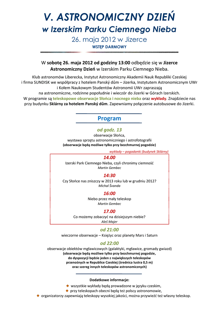 V. ASTRONOMICZNY DZIEŃ w Izerskim Parku Ciemnego Nieba 26. maja 2012 w Jizerce WSTĘP DARMOWY W sobotę 26. maja 2012 od godziny 13:00 odbędzie się w Jizerce Astronomiczny Dzień w Izerskim Parku Ciemnego Nieba. Klub astronomów Liberecka, Instytut Astronomiczny Akademii Nauk Republiki Czeskiej i firma SUNDISK we współpracy z hotelem Panský dům – Jizerka, Instytutem Astronomicznym UWr i Kołem Naukowym Studentów Astronomii UWr zapraszają na astronomiczne, rodzinne popołudnie i wieczór do Jizerki w Górach Izerskich. W programie są teleskopowe obserwacje Słońca i nocnego nieba oraz wykłady. Znajdziecie nas przy budynku Sklárny za hotelem Panský dům. Zapewniamy połączenie autobusowe do Jizerki. Program od godz. 13 obserwacje Słońca, wystawa sprzętu astronomiczniego i astrofotografii (obserwacje będą możliwe tylko przy bezchmurnej pogodzie) wykłady – pogadanki (budynek Sklárny) 14.00 Izerski Park Ciemnego Nieba, czyli chronimy ciemność Martin Gembec 14:30 Czy Słońce nas zniszczy w 2013 roku lub w grudniu 2012? Michal Švanda 16:00 Niebo przez mały teleskop Martin Gembec 17.00 Co możemy zobaczyć na dzisiejszym niebie? Aleš Majer od 21:00 wieczorne obserwacje – Księżyc oraz planety Mars i Saturn od 22:00 obserwacje obiektów mgławicowych (galaktyki, mgławice, gromady gwiazd) (obserwacje będą możliwe tylko przy bezchmurnej pogodzie, do dyspozycji będzie jeden z największych teleskopów przenośnych w Republice Czeskiej (średnica lustra 0,5 m) oraz szereg innych teleskopów astronomicznych) Dodatkowe informacje: wszystkie wykłady będą prowadzone w języku czeskim, przy teleskopach obecni będą też polscy astronomowie, organizatorzy zapewniają teleskopy wysokiej jakości, można przywieźć też własny teleskop. Gdzie odbędzie się impreza? Impreza odbędzie się przy pensjonacie Sklárna (GPS 50°49'8"N, 15°20'41"E), który znajduje się w centrum osady Jizerka. Osada położona jest po czeskiej stronie Gór Izerskich, zaledwie 1,5 km od granicy polskiej. Okolice osady są niezwykle malownicze i ciekawe przyrodniczo oraz doskonale nadają się do uprawiania turystyki pieszej i rowerowej. Jak dotrzeć do Jizerki? pociąg, autobus Pociągiem ze Szklarskiej Poręby dojedziemy do miejscowości Kořenov. Dalej pojedziemy do Jizerki autobusem jeżdżącym na trasie Kořenov – Polubný – Jizerka (rozkład jazdy podany jest poniżej). Do Szklarskiej Poręby łatwo dostaniemy się pociągiem lub autobusem. samochód Najlepszy dojazd do Jizerki prowadzi przez przejście graniczne w Jakuszycach (dalej kierunek Liberec). Do osady Jizerka obowiązuje zakaz wjazdu dla samochodów. Przy wjeździe do osady znajduje się duży parking, od którego do pensjonatu Sklárna drogą prowadzi szlak turystyczny czerwony i niebieski (odległość około 800 m). rowerem, pieszo Do Jizerki łatwo dojedziemy też rowerem lub dojdziemy pieszo. np. z odległych o 7 km Jakuszyc, do których dostać się można autobusem lub pociągiem ze Szklarskiej Poręby Gdzie zanocować? Nocować możemy w Jizerce (duży wybór pensjonatów i schronisk) lub w osadzie Orle (schronisko, 3 km od Jizerki, po polskiej stronie granicy). Komunikacja autobusowa do Jizerki w Astronomiczny Dzień będzie kursować na trasie: Kořenov, dw. kolejowy <–> Kořenov, Příchovice <–> Polubný, kościół <–> Jizerka, Panský dům Autobus jest ozanaczony jako SKIBUS REJDICE i posiada logo Izerskiego Parku Ciemnego Nieba. Odjazdy z Kořenova (dworzec kolejowy) do Jizerki o 11:30, 14:00, 16:00, 18:00 i 19:10. Odjazdy z Jizerki do Kořenova (dworzec kolejowy) o 13:30, 15:30, 17:30 i 18:20. Po nocnych obserwacjach autobus odjedzie o 23:30 (24:00) do Jablonca nad Nisą i na żądanie będzie się zatrzymywał na wszystkich przystankach autobusowych. Z tym kursem skomunikowany będzie w Jabloncu tramwaj do Liberca, który odjeżdża z Tyršových sadů o 0:20 i o 1:15. Mapa okolic