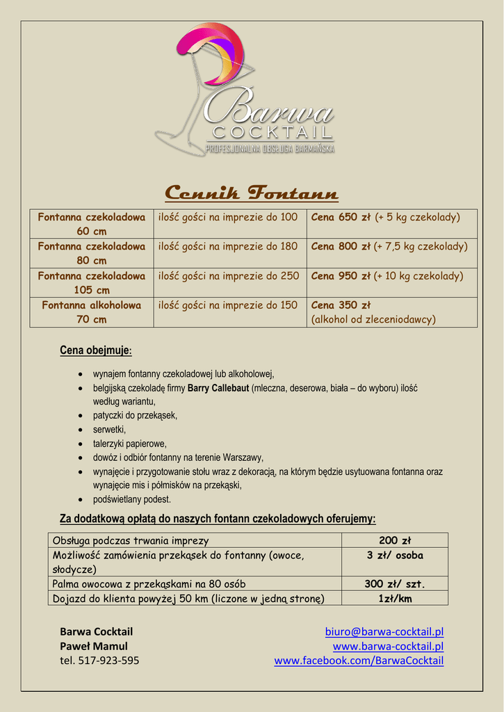 Cennik Fontann Fontanna czekoladowa 60 cm Fontanna czekoladowa 80 cm ilość gości na imprezie do 100 Cena 650 zł (+ 5 kg czekolady) ilość gości na imprezie do 180 Cena 800 zł (+ 7,5 kg czekolady) Fontanna czekoladowa 105 cm Fontanna alkoholowa 70 cm ilość gości na imprezie do 250 Cena 950 zł (+ 10 kg czekolady) ilość gości na imprezie do 150 Cena 350 zł (alkohol od zleceniodawcy) Cena obejmuje: wynajem fontanny czekoladowej lub alkoholowej, belgijską czekoladę firmy Barry Callebaut (mleczna, deserowa, biała – do wyboru) ilość według wariantu, patyczki do przekąsek, serwetki, talerzyki papierowe, dowóz i odbiór fontanny na terenie Warszawy, wynajęcie i przygotowanie stołu wraz z dekoracją, na którym będzie usytuowana fontanna oraz wynajęcie mis i półmisków na przekąski, podświetlany podest. Za dodatkową opłatą do naszych fontann czekoladowych oferujemy: Obsługa podczas trwania imprezy Możliwość zamówienia przekąsek do fontanny (owoce, słodycze) Palma owocowa z przekąskami na 80 osób Dojazd do klienta powyżej 50 km (liczone w jedną stronę) Barwa Cocktail Paweł Mamul tel. 517-923-595 200 zł 3 zł/ osoba 300 zł/ szt. 1zł/km [email protected] www.barwa-cocktail.pl www.facebook.com/BarwaCocktail Realizacje Barwa Cocktail Paweł Mamul tel. 517-923-595 [email protected] www.barwa-cocktail.pl www.facebook.com/BarwaCocktail