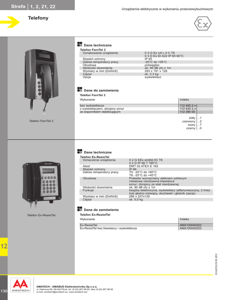 Strefa 1, 2, 21, 22 Urządzenia elektryczne w wykonaniu przeciwwybuchowym Telefony Dane techniczne Telefon FernTel 3 Oznakowanie urządzenia Stopień ochrony Zakres temperatury pracy Obudowa Głośność dzwonienia Wymiary w mm (DxWxS) Ciężar Opcje II 3 G Ex nA L II C T6 II 3 D Ex tD A22 IP 65 80°C IP 65 -20°C do +55°C poliwęglan ok. 95 dB (A) z 1m 293 x 191 x 128 ok. 2,3 kg wyświetlacz Dane do zamówienia Telefon FernTel 3 Wykonanie Indeks bez wyświetlacza z wyświetlaczem, zbrojony sznur ze wspornikiem stabilizującym 112 400 2... 112 430 2... 112 390 00 żółty czerwony szary czarny Telefon FernTel 3 ..1 ..2 ..7 ..0 Dane techniczne Telefon Ex-ResisTel Oznaczenie urządzenia Atest Stopień ochrony Zakres temperatury pracy Obudowa Głośność dzwonienia Funkcje Wymiary w mm (DxWxS) Ciężar II 2 G EEx em[ib] IIC T6 II 2 D IP 66 T 180°C DMT 02 ATEX E 183 IP 66 T5: -25°C do +60°C T6: -25°C do +40°C Poliester wzmacniany włóknem szklanym metalowa nierdzewna klawiatura sznur: zbrojony ze stali nierdzewnej ok. 90 dB (A) z 1m książka telefoniczna, wyświetlacz (alfanumeryczny, 2 linie) tryb głośno mówiący, słuchawki i głośnik (opcja) 266 x 227x135 ok. 5,5 kg Dane do zamówienia Telefon Ex-ResistTel Telefon Ex-ResistTel Wykonanie Indeks Ex-ResistTel Ex-ResistTel bez klawiatury i wyświetlacza AMA100040202 AMA100040203 EX.KAT.03.03/03.2012 12 AMATECH - AMABUD Elektrotechnika Sp z o.o. 130 ul. Kalinowa 68, 09-402 Płock, tel. (0-24) 267 88 60, faks (0-24) 267 88 62 e-mail: [email protected], www.amatech.eul