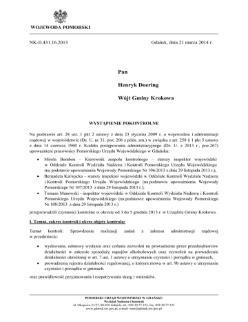 WOJEWODA POMORSKI Gdańsk, dnia 21 marca 2014 r. NK-II.431.16.2013 Pan Henryk Doering Wójt Gminy Krokowa WYSTĄPIENIE POKONTROLNE Na podstawie art. 28 ust. 1 pkt 2 ustawy z dnia 23 stycznia 2009 r. o wojewodzie i administracji rządowej w województwie (Dz. U. nr 31, poz. 206 z późn. zm.) w związku z art. 258 § 1 pkt 5 ustawy z dnia 14 czerwca 1960 r. Kodeks postępowania administracyjnego (Dz. U. z 2013 r., poz.267) upoważnieni pracownicy Pomorskiego Urzędu Wojewódzkiego w Gdańsku: Mirela Bemben – Kierownik zespołu kontrolnego – starszy inspektor wojewódzki w Oddziale Kontroli Wydziału Nadzoru i Kontroli Pomorskiego Urzędu Wojewódzkiego (na podstawie upoważnienia Wojewody Pomorskiego Nr 106/2013 z dnia 29 listopada 2013 r.), Bernadeta Karwacka – starszy inspektor wojewódzki w Oddziale Kontroli Wydziału Nadzoru i Kontroli Pomorskiego Urzędu Wojewódzkiego (na podstawie upoważnienia Wojewody Pomorskiego Nr 107/2013 z dnia 29 listopada 2013 r.); Tomasz Manowski - inspektor wojewódzki w Oddziale Kontroli Wydziału Nadzoru i Kontroli Pomorskiego Urzędu Wojewódzkiego (na podstawie upoważnienia Wojewody Pomorskiego Nr 108/2013 z dnia 29 listopada 2013 r.) przeprowadzili czynności kontrolne w okresie od 3 do 5 grudnia 2013 r. w Urzędzie Gminy Krokowa. I. Temat, zakres kontroli i okres objęty kontrolą: Temat kontroli: w przedmiocie: Sprawdzenie realizacji zadań z zakresu administracji rządowej wydawania, odmowy wydania oraz cofania zezwoleń na prowadzenie przez przedsiębiorców działalności w zakresie sprzedaży napojów alkoholowych oraz zezwoleń na prowadzenie działalności określonej w art. 7 ust. 1 ustawy o utrzymaniu czystości i porządku w gminach, prowadzenia rejestru działalności regulowanej, o którym mowa w art. 9b ustawy o utrzymaniu czystości i porządku w gminach. oraz prawidłowość przyjmowania i rozpatrywania skarg i wniosków. POMORSKI URZĄD WOJEWÓDZKI W GDAŃSKU Wydział Nadzoru i Kontroli ul. Okopowa 21/27, 80-810 Gdańsk, tel.: 058 30 77 233, fax: 058 30 77 125 www.gdansk.uw.gov.pl, e-mail: [email protected] Okres objęty kontrolą: od 1 stycznia 2012 r. do dnia rozpoczęcia kontroli. Ilekroć w projekcie wystąpienia pokontrolnego jest mowa o: Urzędzie Gminy – rozumie się przez to Urząd Gminy Krokowa; GKRPA – rozumie się przez to Gminną Komisję ds. Rozwiązywania Problemów Alkoholowych; Kpa – należy przez to rozumieć ustawę z dnia 14 czerwca 1960 r. Kodeks postępowania administracyjnego (Dz. U. z 2013 r., poz.267); Wójcie – rozumie się przez to Wójta Gminy Krokowa. II. Ocena: 1. Wykonywanie poszczególnych zadań w Urzędzie Gminy Krokowa oceniono w następujący sposób: w zakresie sposobu wydawania, odmowy wydania oraz cofania zezwoleń na prowadzenie działalności w zakresie sprzedaży napojów alkoholowych – skontrolowano 49 na 196 decyzji i w tym zakresie realizację zadań ocenia się pozytywnie, w zakresie prowadzenia rejestru działalności regulowanej skontrolowano wszystkie sprawy, tj. 15 wniosków wraz z wydanymi zaświadczeniami – realizację wykonywania zadań ocenia się pozytywnie, w zakresie udzielania zezwoleń dotyczących opróżniania zbiorników bezodpływowych i transport nieczystości ciekłych - skontrolowano wszystkie sprawy, tj. 6 wniosków wraz z wydanymi decyzjami – realizację wykonywania zadań ocenia się pozytywnie z uchybieniami. Powyższą ocenę uzasadnia wydawanie decyzji niezgodnie z wnioskiem strony, w zakresie ochrony przed bezdomnymi zwierzętami, a także prowadzenia schronisk dla bezdomnych zwierząt, grzebowisk i spalarni zwłok zwierzęcych i ich części – odstąpiono od kontroli, bowiem w kontrolowanym okresie nie wydano żadnych zezwoleń w tym zakresie, w zakresie sposobu przyjmowania i rozpatrywania skarg i wniosków kontrolą objęto 1 skargę, która jako jedyna w okresie poddanym kontroli wpłynęła do Wójta. Sposób jej rozpatrzenia oceniono negatywnie. Ocenę uzasadnia nieprzestrzeganie przez Wójta właściwości w przedmiocie przyjmowania i rozpatrywania skarg i wniosków. Powyższe oceny sformułowano na podstawie dokonanych ustaleń: W zakresie wydawania zezwoleń na sprzedaż napojów alkoholowych: Przygotowywaniem projektów zezwoleń na sprzedaż napojów alkoholowych zajmuje się w Urzędzie Gminy Referat Spraw Obywatelskich i Informacji. Ustalono liczbę wydanych zezwoleń na sprzedaż napojów alkoholowych przeznaczonych do spożycia w miejscu lub poza miejscem sprzedaży z rozbiciem na rodzaj napojów alkoholowych, liczbę wydanych jednorazowych zezwoleń na sprzedaż napojów alkoholowych, liczbę cofniętych zezwoleń oraz liczbę wygaszonych zezwoleń. Dane liczbowe zostały zestawione w tabeli 1. POMORSKI URZĄD WOJEWÓDZKI W GDAŃSKU Wydział Nadzoru i Kontroli ul. Okopowa 21/27, 80-810 Gdańsk, tel.: 058 30 77 233, fax: 058 30 77 125 www.gdansk.uw.gov.pl, e-mail: [email protected] Strona 2 z 6 Tabela. 1 Liczba wydanych zezwoleń na sprzedaż napojów alkoholowych przeznaczonych do spożycia w miejscu lub poza miejscem sprzedaży do 4,5% zawartości alkoholu oraz na piwo powyżej 4,5% do 18% zawartości alkoholu (z wyjątkiem piwa) powyżej 18% zawartości alkoholu 87 58 53 Liczba wydanych jednorazowych Liczba Liczba zezwoleń na cofniętych wygaszonych sprzedaż zezwoleń zezwoleń napojów alkoholowych 19 4 Liczba uchylonych zezwoleń 184 W okresie objętym kontrolą Wójt wydał 406 zezwoleń i decyzji dotyczących prowadzenia działalności w zakresie sprzedaży napojów alkoholowych w tym: 198 zezwoleń na sprzedaż napojów alkoholowych przeznaczonych do spożycia w miejscu lub poza miejscem, 19 zezwoleń jednorazowych na sprzedaż napojów alkoholowych, 4 decyzje o cofnięciu zezwolenia, 184 decyzji o wygaśnięciu zezwolenia na sprzedaż napojów alkoholowych, 1 decyzję umarzającą postępowanie W celu dokonania oceny prawidłowości prowadzonych spraw skontrolowano 25% spraw, tj. 49 losowo wybranych wniosków (w ty
