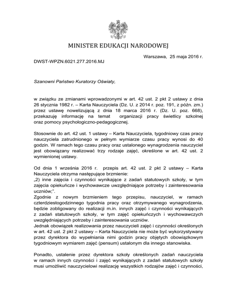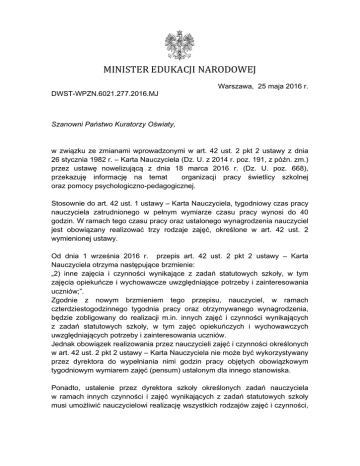 MINISTER EDUKACJI NARODOWEJ Warszawa, 25 maja 2016 r. DWST-WPZN.6021.277.2016.MJ Szanowni Państwo Kuratorzy Oświaty, w związku ze zmianami wprowadzonymi w art. 42 ust. 2 pkt 2 ustawy z dnia 26 stycznia 1982 r. – Karta Nauczyciela (Dz. U. z 2014 r. poz. 191, z późn. zm.) przez ustawę nowelizującą z dnia 18 marca 2016 r. (Dz. U. poz. 668), przekazuję informację na temat organizacji pracy świetlicy szkolnej oraz pomocy psychologiczno-pedagogicznej. Stosownie do art. 42 ust. 1 ustawy – Karta Nauczyciela, tygodniowy czas pracy nauczyciela zatrudnionego w pełnym wymiarze czasu pracy wynosi do 40 godzin. W ramach tego czasu pracy oraz ustalonego wynagrodzenia nauczyciel jest obowiązany realizować trzy rodzaje zajęć, określone w art. 42 ust. 2 wymienionej ustawy. Od dnia 1 września 2016 r. przepis art. 42 ust. 2 pkt 2 ustawy – Karta Nauczyciela otrzyma następujące brzmienie: „2) inne zajęcia i czynności wynikające z zadań statutowych szkoły, w tym zajęcia opiekuńcze i wychowawcze uwzględniające potrzeby i zainteresowania uczniów;”. Zgodnie z nowym brzmieniem tego przepisu, nauczyciel, w ramach czterdziestogodzinnego tygodnia pracy oraz otrzymywanego wynagrodzenia, będzie zobligowany do realizacji m.in. innych zajęć i czynności wynikających z zadań statutowych szkoły, w tym zajęć opiekuńczych i wychowawczych uwzględniających potrzeby i zainteresowania uczniów. Jednak obowiązek realizowania przez nauczycieli zajęć i czynności określonych w art. 42 ust. 2 pkt 2 ustawy – Karta Nauczyciela nie może być wykorzystywany przez dyrektora do wypełniania nimi godzin pracy objętych obowiązkowym tygodniowym wymiarem zajęć (pensum) ustalonym dla innego stanowiska. Ponadto, ustalenie przez dyrektora szkoły określonych zadań nauczyciela w ramach innych czynności i zajęć wynikających z zadań statutowych szkoły musi umożliwić nauczycielowi realizację wszystkich rodzajów zajęć i czynności, o których mowa w art. 42 ust. 2 pkt 1 – 3 ustawy – Karta Nauczyciela w ramach jego tygodniowego czasu pracy. W okresie przejściowym, do czasu systemowego rozwiązania organizacji ww. zajęć, dyrektorzy powinni motywować nauczycieli do realizacji zajęć, o których mowa w art. 42 ust. 2 pkt 2 ustawy – Karta Nauczyciela, w ramach ich tygodniowego czasu pracy, wykorzystując funkcję wspierającą dodatku motywacyjnego. Odnosząc się do organizacji pracy świetlicy, należy zauważyć, że zgodnie z ustawą z dnia 7 września 1991 r. o systemie oświaty (Dz. U. z 2015 r. poz. 2156, z późn. zm.), zapewnienie uczniom możliwości korzystania ze świetlicy jest jednym ze statutowych zadań szkoły publicznej. W myśl ramowego statutu publicznej szkoły podstawowej oraz ramowego statutu publicznego gimnazjum, stanowiących załączniki nr 2 i 3 do rozporządzenia Ministra Edukacji Narodowej z dnia 21 maja 2001 r. sprawie ramowych statutów publicznego przedszkola oraz publicznych szkół (Dz. U. Nr 61, poz. 624, z późn. zm.), dla uczniów, którzy muszą dłużej przebywać w szkole podstawowej lub gimnazjum, w tym specjalnych, ze względu na czas pracy ich rodziców (prawnych opiekunów), organizację dojazdu do szkoły podstawowej, gimnazjum w tym specjalnych lub inne okoliczności wymagające zapewnienia uczniowi opieki w szkole, szkoła organizuje świetlicę. W świetlicy prowadzone są zajęcia w grupach wychowawczych. Liczba uczniów w grupie nie powinna przekraczać 25, z tym że w szkołach specjalnych liczba uczniów w grupach wychowawczych powinna odpowiadać liczbie uczniów określonej dla oddziału szkoły podstawowej specjalnej lub gimnazjum specjalnego. Uczniowie przebywający w świetlicy, muszą mieć stałą opiekę; w tym celu dyrektor szkoły zatrudnia wychowawców świetlicy, których tygodniowy, obowiązkowy wymiar zajęć, zgodnie z art. 42 ust. 3 lp. 6 ustawy – Karta Nauczyciela, wynosi 26 godzin. Godzinami pracy w świetlicy nauczyciele mogą mieć także uzupełniony tygodniowy obowiązkowy wymiar zajęć dydaktycznych, wychowawczych lub opiekuńczych; w tym przypadku, ze względu na realizowanie obowiązków określonych dla stanowisk o różnym tygodniowym obowiązkowym wymiarze godzin, do określenia tygodniowego obowiązkowego wymiaru zajęć nauczyciela będzie miał zastosowanie art. 42 ust. 7 pkt 3 ustawy – Karta Nauczyciela. Wychowawca świetlicy realizuje w ciągu roku szkolnego zajęcia zgodne z planem pracy świetlicy. Świetlica zapewnia dzieciom bezpieczeństwo przez stałą obecność wychowawcy. Świetlica szkolna pełni ważną rolę w realizacji zadań opiekuńczo-wychowawczych szkoły, wspomaga i uzupełnia pracę szkoły we wszystkich jej zakresach, tj. w zakresie opieki, wychowania, dydaktyki oraz w zakresie oddziaływań profilaktyczno-terapeutycznych. W szkole podstawowej, w tym specjalnej i integracyjnej, może być zatrudniony asystent wychowawcy świetlicy (art. 7 ust. 1e ustawy o systemie oświaty). Do zadań asystenta należy wspieranie wychowawcy świetlicy. Asystent wykonuje zadania wyłącznie pod kierunkiem wychowawcy świetlicy i nie może zastępować lub pełnić roli wychowawcy świetlicy. Stanowisko wychowawcy świetlicy, wraz z wymiarem godzin, musi być zaplanowane w arkuszu organizacji szkoły. Przypominam, że organizacja pracy szkoły musi być zaopiniowana przez radę pedagogiczną. Przy opracowaniu arkusza organizacji szkoły dyrektor powinien zaplanować liczbę miejsc dla uczniów, którzy rozpoczną naukę od 1 września. Planowanie to powinno wynikać z analizy ostatnich lat i znajomości środowiska szkolnego. Organ prowadzący szkołę powinien zatwierdzić arkusz organizacji szkoły do końca maja roku poprzedzającego dany rok szkolny. Zatwierdzony arkusz stanowi dla dyrektora gwarancję, że szkoła otrzyma środki potrzebne na organizację świetlicy. Gdyby organ prowadzący, mimo występujących w szkole potrzeb, nie chciał zagwarantować środków na sta