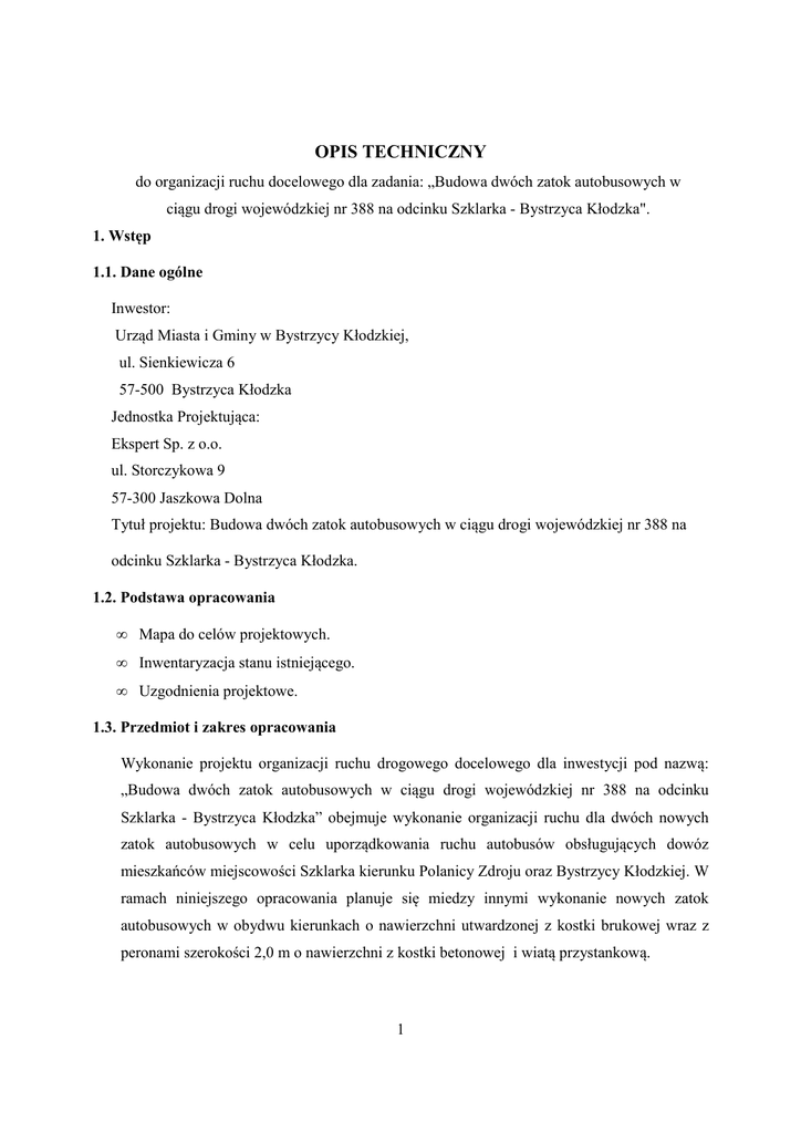 OPIS TECHNICZNY do organizacji ruchu docelowego dla zadania: „Budowa dwóch zatok autobusowych w ciągu drogi wojewódzkiej nr 388 na odcinku Szklarka - Bystrzyca Kłodzka". 1. Wstęp 1.1. Dane ogólne Inwestor: Urząd Miasta i Gminy w Bystrzycy Kłodzkiej, ul. Sienkiewicza 6 57-500 Bystrzyca Kłodzka Jednostka Projektująca: Ekspert Sp. z o.o. ul. Storczykowa 9 57-300 Jaszkowa Dolna Tytuł projektu: Budowa dwóch zatok autobusowych w ciągu drogi wojewódzkiej nr 388 na odcinku Szklarka - Bystrzyca Kłodzka. 1.2. Podstawa opracowania • Mapa do celów projektowych. • Inwentaryzacja stanu istniejącego. • Uzgodnienia projektowe. 1.3. Przedmiot i zakres opracowania Wykonanie projektu organizacji ruchu drogowego docelowego dla inwestycji pod nazwą: „Budowa dwóch zatok autobusowych w ciągu drogi wojewódzkiej nr 388 na odcinku Szklarka - Bystrzyca Kłodzka” obejmuje wykonanie organizacji ruchu dla dwóch nowych zatok autobusowych w celu uporządkowania ruchu autobusów obsługujących dowóz mieszkańców miejscowości Szklarka kierunku Polanicy Zdroju oraz Bystrzycy Kłodzkiej. W ramach niniejszego opracowania planuje się miedzy innymi wykonanie nowych zatok autobusowych w obydwu kierunkach o nawierzchni utwardzonej z kostki brukowej wraz z peronami szerokości 2,0 m o nawierzchni z kostki betonowej i wiatą przystankową. 1 a. Zatoka autobusowa w kierunku Bystrzycy Kłodzkiej: Istniejącą, nienormatywną, zatokę autobusową wraz z przestarzałą wiatą przystankową, poddaje się likwidacji. W zamian projektuje się nową, normatywną, zatokę w nowej lokalizacji zgodnie z załączonym planem sytuacyjnym. Ze wzglądów bezpieczeństwa poruszania się pieszych projektuje się chodnik (nawierzchnia także z kostki betonowej) o długości ok. 25 mb i szerokości 2,0 m zlokalizowanego od zjazdu z drogi wojewódzkiej na drogę gminną (działka nr 96) do początku peronu niniejszej zatoki. Stosuje się oznakowanie pionowe zatoki znakiem D-15 wielkości (S). b. Zatoka autobusowa w kierunku Polanicy Zdroju: Projektuje się zatokę autobusową w miejscu już istniejącej zatoki o nawierzchni nieutwardzonej z doprowadzeniem jej parametrów do wartości normatywnych wskazanych w Rozporządzenie Ministra Transportu i Gospodarki Morskiej z dnia 2 marca 1999 r. w sprawie warunków technicznych, jakim powinny odpowiadać drogi publiczne i ich usytuowanie. Stosuje się oznakowanie pionowe zatoki znakiem D-15 wielkości (S). Ponadto projektuje się budowę czterech punktów oświetleniowych (po dwa punkty dla każdej zatoki), c. Miejsce po istniejącej zatoce w kierunku Bystrzycy Kłodzkiej Miejsce po istniejącej zatoce należy uporządkować. Istniejącą wiatę zlikwidować oraz ograniczyć dostęp do zagospodarowanego terenu (wg zaleceń DSDiK) przy użyciu słupków blokujących U-12c ustawionych na długości 14 mb w odstępie co 1 m i w odległości od krawędzi jezdni wynoszącej 1 m. Całość zamierzonych robót budowlanych będzie wykonywane w pasie drogowym (działka nr 100 obręb 0033 Szklarka), do którego Inwestor (Gmina Bystrzyca Kłodzka) posiada tytuł prawny do dysponowania gruntem. 2. Lokalizacja Projektowana inwestycja zlokalizowana jest w pasie drogowym drogi wojewódzkiej 388 na działce nr 100 obręb Szklarka w miejscowości Szklarka w gminie Bystrzyca Kłodzka, powiat kłodzki, województwo dolnośląskie. Zarządcą działki, na której przeprowadzana jest inwestycja jest Dolnośląska Służba Dróg i Kolei we Wrocławiu z siedzibą na ulicy 2 Krakowskiej 28; 50-425 Wrocław natomiast właścicielem jest Gmina w Bystrzyca Kłodzka, ul. Sienkiewicza 6, 57-500 Bystrzyca Kłodzka. 3. Stan istniejący: Odcinek drogi wojewódzkiej nr 388 w miejscowości Szklarka (klasa drogi G) znajduje się w terenie zabudowanym otoczonym budynkami jedno i wielorodzinnymi. W strefie budowy nowych zatok autobusowych szerokość drogi wynosi około 5,0 m o daszkowym przekroju poprzecznym. Spadki podłużne jezdni kierują się w stronę mostu, który jest położony w samym środku miejscowości Spadek podłużny jezdni wzdłuż zatoki w stronę Bystrzycy Kłodzkiej wynosi ok. 0,5%, natomiast wzdłuż zatoki w kierunku Polanicy Zdroju ok. 1,5%. Wzdłuż całego odcinka miejscowości Szklarka, pomiędzy znakami D-42 i D-43, występuje tylko jeden znak pionowy - D-15, którego stan techniczny jest niezadawalający. Oznakowanie poziome nie występuje. Liczba pojazdów na dobę wynosiła 1750 pojazdów na dobę wg pomiaru ruchu DSDiK z 2010 r. Natomiast prognozowana 1888 pojazdów na dobę w roku 2013 wg "Zasady prognozowania wskaźników wzrostu ruchu wewnętrznego na okres 2008-2040 na sieci drogowej do celów planistyczno projektowych". Elementy drogi wykazują na braki w należytym utrzymaniu jej konstrukcji oraz odwodnienia na przestrzeni wielu lat. Nawierzchnia bitumiczna tego odcinka jezdni charakteryzuje się dużymi deformacjami podłużnymi oraz poprzecznym. Liczne ubytki i spękania nawierzchni w szczególności typu pajęczynowego (szczególnie przy krawędziach) sugerują pewne wątpliwości w zakresie aktualnej nośności konstrukcji istniejącej podbudowy w zewnętrznych strefach jezdni. Pobocza drogi, częściowo zarośnięte roślinnością, w szczególności na obiekcie mostowym, ograniczają prawidłowy spływ wód opadowych z jezdni, co powoduje ich penetrację w głąb konstrukcji jezdni, a następnie niszczenie jej dolnych warstw. W miejscu projektowanej zatoki autobusowej obsługującej ruch w kierunku Polanicy Zdroju znajduje się plac o nawierzchni częściowo utwardzonej nierównej z nadmiernymi deformacjami oraz licznymi ubytkami, który wykorzystywany jest jako miejsce zatrzymania i postoju różnego typu pojazdów w tym autobusów. Po przeciwnej stronie jezdni na istniejącym nieutwardzonym placu, wykorzystywanym także do zatrzymywania się i postoju różnego typu pojazdów w tym autobusów, zlokalizowana jest nienormatywna, o przestarzałej konstrukcji, wi