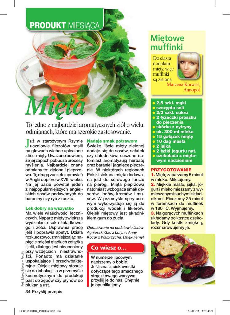 PRODUKT MIESIĄCA Miętowe muffinki Mięta To jedno z najbardziej aromatycznych ziół o wielu odmianach, które ma szerokie zastosowanie. J Fot.: Marco Mayer – Fotolia uż w starożytnym Rzymie uczniowie filozofów nosili na głowach wieńce uplecione z liści mięty. Uważano bowiem, że jej zapach pobudza procesy myślenia. Najbardziej znane odmiany to: zielona i pieprzowa. Tę drugą zaczęto uprawiać w Anglii dopiero w XVIII wieku. Na jej bazie powstał jeden z najpopularniejszych angielskich sosów podawanych do baraniny czy ryb z rusztu. Nadaje smak potrawom Świeże liście mięty zielonej dodaje się do sosów, sałatek czy chłodników, suszone natomiast aromatyzują herbatę oraz baranie i jagnięce pieczenie. W niektórych regionach Polski siekana mięta dodawana jest do serowego farszu na pierogi. Mięta pieprzowa natomiast wzbogaca smak deserów, lodów, kremów i musów. W przemyśle spirytusowym wykorzystuje się ją do Lek dobry na wszystko produkcji wódek i likierów. Ma wiele właściwości leczni- Olejek miętowy jest składniczych. Napar z mięty zwiększa kiem gum do żucia. wydzielanie soku żołądkowego i żółci. Usprawnia pracę Opracowano na podstawie listów jelit i poprawia apetyt. Działa Agnieszki Gac z Lutyni i Anny rozkurczowo, zmniejszając na- Kocur z Wałbrzycha. Dziękujemy! pięcie mięśni gładkich żołądka i jelit, dlatego jest nieoceniony Co wiesz o... przy wzdęciach i niestrawności. Ponadto ma działanie W numerze lipcowym uspokajające i przeciwbaktenapiszemy o bobie. ryjne. Olejek miętowy stosuje Jeśli znasz ciekawostki się do inhalacji, a w przemyśle dotyczące tego smacznego kosmetycznym do produkcji strączkowego warzywa, przyślij je do nas. Chętnie past do zębów czy płynów do je opublikujemy. płukania ust. Do ciasta dodałam mięty, więc muffinki są zielone. Marzena Korwiel, Annopol 2,5 szkl. mąki szczypta soli 2/3 szkl. cukru 2 łyżeczki proszku do pieczenia ● skórka z cytryny ● ok. 300 ml mleka ● 15 gałązek mięty ● 10 dag masła ● 2 jajka ● 2 łyżki jogurtu nat. ● czekolada z miętowym nadzieniem ● ● ● ● PRZYGOTOWANIE 1. Miętę zaparzamy 5 minut w mleku. Miksujemy. 2. Miękkie masło, jajka, jogurt i mleko mieszamy z wymieszanymi suchymi składnikami. Pieczemy 25 minut w foremkach do muffinek w 180 °C. Wyjmujemy. 3. Na gorących muffinkach układamy po kostce czekolady. Gdy kostki zmiękną, rozsmarowujemy je. 34 Przyślij przepis PP0511s3434_PRODn.indd 34 15-03-11 12:34:29
