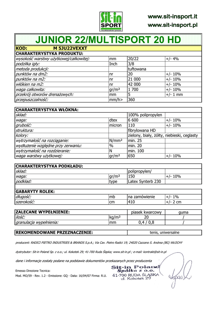 JUNIOR 22/MULTISPORT 20 HD KOD: M 5JU22VEXXT CHARAKTERYSTYKA PRODUKTU: wysokość warstwy użytkowej/całkowitej: podziłka igły: metoda produkcji: punktów na dm2: punktów na m2: włókien na m2: waga całkowita: przekrój otworów drenażowych: przepuszczalność: mm Inch nr nr nr gr/m² mm mm/h> 20/22 3/8 tuftowana 20 21 000 42 000 1 700 5 360 +/- 4% +/+/+/+/+/- 10% 10% 10% 10% 1 mm CHARAKTERYSTYKA WŁÓKNA: skład: waga: grubość: struktura: kolory: wytrzymałość na rozciąganie: wydłużenie względne przy zerwaniu: wytrzymałość na rozdzieranie: waga warstwy użytkowej: niebieski, ceglasty N/mm² % N gr/m² 100% polipropylen 6 600 110 fibrylowana HD zielony, biały, żółty, min. 25 min. 20 min. 100 650 gr/m² type polipropylen/ 150 Latex Synterb 230 +/- 10% mb cm na zamówienie 410 +/- 1% +/- 2 cm dtex micron +/- 10% +/- 10% +/- 10% CHARAKTERYSTYKA PODKŁADU: skład: waga: podkład: GABARYTY ROLEK: długość: szerokość: ZALECANE WYPEŁNIENIE: ilość: granulacja wypełnienia: REKOMENDOWANE PRZEZNACZENIE: kg/m² mm piasek kwarcowy 20 0,4 / 0,8 guma / / tenis, uniwersalne producent: RADICI PIETRO INDUSTRIES & BRANDS S.p.A.; Via Cav. Pietro Radici 19; 24020 Cazzano S. Andrea (BG) WŁOCHY dystrybutor: Sit-in Poland Sp. z o.o.; ul. Kokotek 29; 41-700 Ruda Śląska; www.sit-in.pl ; e-mail: [email protected] dane i informacje zostały podane na podstawie dokumentów przekazanych przez producenta Emesso Direzione Tecnica: Mod. MO/59 - Rev. 1.2 - Emissione: GQ - Data: 16/04/07 Firma: R.U.