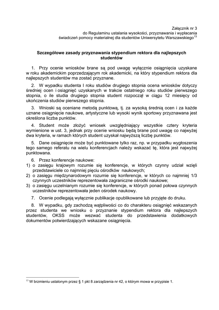 Załącznik nr 3 do Regulaminu ustalania wysokości, przyznawania i wypłacania świadczeń pomocy materialnej dla studentów Uniwersytetu Warszawskiego 13 Szczegółowe zasady przyznawania stypendium rektora dla najlepszych studentów 1. Przy ocenie wniosków brane są pod uwagę wyłącznie osiągnięcia uzyskane w roku akademickim poprzedzającym rok akademicki, na który stypendium rektora dla najlepszych studentów ma zostać przyznane. 2. W wypadku studenta I roku studiów drugiego stopnia ocena wniosków dotyczy średniej ocen i osiągnięć uzyskanych w trakcie ostatniego roku studiów pierwszego stopnia, o ile studia drugiego stopnia student rozpoczął w ciągu 12 miesięcy od ukończenia studiów pierwszego stopnia. 3. Wnioski są oceniane metodą punktową, tj. za wysoką średnią ocen i za każde uznane osiągnięcie naukowe, artystyczne lub wysoki wynik sportowy przyznawana jest określona liczba punktów. 4. Student może złożyć wniosek uwzględniający wszystkie cztery kryteria wymienione w ust. 3, jednak przy ocenie wniosku będą brane pod uwagę co najwyżej dwa kryteria, w ramach których student uzyskał najwyższą liczbę punktów. 5. Dane osiągnięcie może być punktowane tylko raz, np. w przypadku wygłoszenia tego samego referatu na wielu konferencjach należy wskazać tę, która jest najwyżej punktowana. 6. Przez konferencje naukowe: 1) o zasięgu krajowym rozumie się konferencje, w których czynny udział wzięli przedstawiciele co najmniej pięciu ośrodków naukowych; 2) o zasięgu międzynarodowym rozumie się konferencje, w których co najmniej 1/3 czynnych uczestników reprezentowała zagraniczne ośrodki naukowe; 3) o zasięgu uczelnianym rozumie się konferencje, w których ponad połowa czynnych uczestników reprezentowała jeden ośrodek naukowy. 7. Ocenie podlegają wyłącznie publikacje opublikowane lub przyjęte do druku. 8. W wypadku, gdy zachodzą wątpliwości co do charakteru osiągnięć wskazanych przez studenta we wniosku o przyznanie stypendium rektora dla najlepszych studentów, OKSS może wezwać studenta do przedstawienia dodatkowych dokumentów potwierdzających wskazane osiągnięcia. 13 W brzmieniu ustalonym przez § 1 pkt 8 zarządzenia nr 42, o którym mowa w przypisie 1. Kryterium I – wysoka średnia ocen 1. Dla obliczenia liczby punktów przyjmowanej dla tego kryterium stosuje się następujący wzór: Lp=100*(średnia_ocen-4.00) gdzie: Lp = Liczba punktów średnia_ocen = arytmetyczna średnia ocen obliczona zgodnie z ust. 2 lub 3 odpowiednio. 2. Średnia ocen studenta z etapu studiów zakończonego na Uniwersytecie Warszawskim obliczana jest zgodnie z zasadami Regulaminu Studiów na Uniwersytecie Warszawskim z uwzględnieniem zasad studiowania obowiązujących w danej jednostce. 3. Średnie ocen uzyskane przez studenta w skali, w której najwyższą oceną jest 6,0 lub 5,5 (tj. średnia_ocen_obca) zastępuje się odpowiednikami przeliczonymi według następujących wzorów, z zaokrągleniem do drugiego miejsca po przecinku: 1) ze skali ocen 2-5,5 średnia_ocen = (średnia_ocen_obca*5)/5,5 2) ze skali ocen 2-6,0 średnia_ocen = (średnia_ocen_obca*5)/6,0 4. Za kryterium wysokiej średniej ocen można otrzymać od 0 do 100 punktów. 5. Student, który uzyskał wpis warunkowy na kolejny rok studiów otrzymuje 0 punktów za kryterium wysokiej średniej ocen. Kryterium II – osiągnięcia naukowe1 Typy osiągnięć naukowych Publikacje Osiągnięcia Punkty Recenzowana książka o charakterze naukowym 10 Rozdział w recenzowanej książce o charakterze naukowym lub recenzowanej publikacji pokonferencyjnej 3 Artykuł naukowy w czasopiśmie naukowym znajdującym się na liście w Części A, Części B lub w Części C ujednoliconego i ostatniego ogłoszonego wykazu czasopism naukowych MNiSW 5 maksymalnie 25 za całą kategorię Przekłady Konferencje naukowe Konkursy naukowe 1 Artykuł naukowy w czasopiśmie o charakterze naukowym nie ujętym w Części A, Części B lub Części C ujednoliconego i ostatniego ogłoszonego wykazu czasopism naukowych MNiSW 3 Przekład książki o charakterze naukowym 7 Przekład rozdziału książki zamieszczony w recenzowanej książce o charakterze naukowym lub czasopiśmie naukowym 3 Przekładu artykułu naukowego zamieszczonego w recenzowanej książce o charakterze naukowym lub czasopiśmie naukowym 3 Czynny udział (tj. wygłoszenie referatu lub zaprezentowanie posteru) w konferencji naukowej o zasięgu międzynarodowym 5 Czynny udział w konferencji naukowej o zasięgu krajowym 3 Czynny udział w konferencji naukowej o zasięgu uczelnianym 1 Miejsca I-III w konkursach naukowych o zasięgu międzynarodowym 10 Miejsca I-III w konkursach naukowych o zasięgu krajowym 5 maksymalnie 25 za całą kategorię maksymalnie 25 za całą kategorię maksymalnie 25 za całą kategorię w szczególnie uzasadnionych wypadkach OKSS może przyznać do 100 punktów za osiągnięcie naukowe znacznej wagi. Kryterium III – osiągnięcia artystyczne1 Kategorie osiągnięć Publikacje Konkursy/Festiwale artystyczne Wystawy 1 Osiągnięcia Punkty Książka artystyczna, np. album z reprodukcjami lub przekład dzieła literackiego 10 Zamieszczenie dzieła artystycznego w publikacji zbiorowej 8 maksymalnie 40 za całą kategorię Miejsca I-III w konkursach lub festiwalach artystycznych o zasięgu międzynarodowym I – 10 II – 8 III – 6 Miejsca I-III w konkursach lub festiwalach artystycznych o zasięgu krajowym I–6 II – 4 III – 2 Wystawienie dzieła na wystawie o zasięgu międzynarodowym 10 Wystawienie dzieła na wystawie o zasięgu krajowym 5 maksymalnie 40 za całą kategorię maksymalnie 20 za całą kategorię w szczególnie uzasadnionych wypadkach OKSS może przyznać do 100 punktów za osiągnięcie artystyczne znacznej wagi. Kryterium IV – osiągnięcia sportowe1 Osiągnięcia Udział w igrzyskach olimpijskich lub paraolimpijskich Udział w Mistrzostwach Świata, Mistrzostwach Europy, Uniw