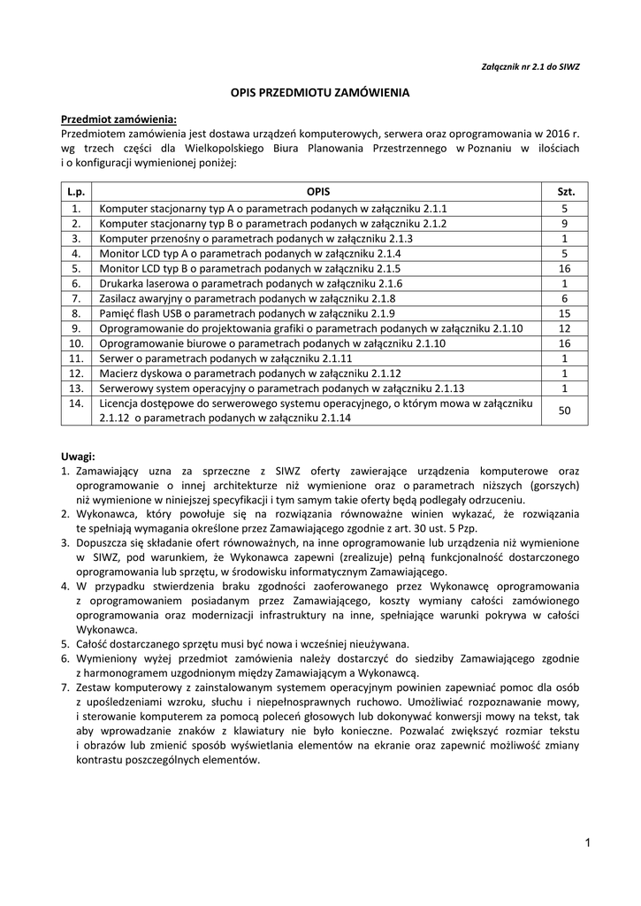 Załącznik nr 2.1 do SIWZ OPIS PRZEDMIOTU ZAMÓWIENIA Przedmiot zamówienia: Przedmiotem zamówienia jest dostawa urządzeń komputerowych, serwera oraz oprogramowania w 2016 r. wg trzech części dla Wielkopolskiego Biura Planowania Przestrzennego w Poznaniu w ilościach i o konfiguracji wymienionej poniżej: L.p. 1. 2. 3. 4. 5. 6. 7. 8. 9. 10. 11. 12. 13. 14. OPIS Komputer stacjonarny typ A o parametrach podanych w załączniku 2.1.1 Komputer stacjonarny typ B o parametrach podanych w załączniku 2.1.2 Komputer przenośny o parametrach podanych w załączniku 2.1.3 Monitor LCD typ A o parametrach podanych w załączniku 2.1.4 Monitor LCD typ B o parametrach podanych w załączniku 2.1.5 Drukarka laserowa o parametrach podanych w załączniku 2.1.6 Zasilacz awaryjny o parametrach podanych w załączniku 2.1.8 Pamięć flash USB o parametrach podanych w załączniku 2.1.9 Oprogramowanie do projektowania grafiki o parametrach podanych w załączniku 2.1.10 Oprogramowanie biurowe o parametrach podanych w załączniku 2.1.10 Serwer o parametrach podanych w załączniku 2.1.11 Macierz dyskowa o parametrach podanych w załączniku 2.1.12 Serwerowy system operacyjny o parametrach podanych w załączniku 2.1.13 Licencja dostępowe do serwerowego systemu operacyjnego, o którym mowa w załączniku 2.1.12 o parametrach podanych w załączniku 2.1.14 Szt. 5 9 1 5 16 1 6 15 12 16 1 1 1 50 Uwagi: 1. Zamawiający uzna za sprzeczne z SIWZ oferty zawierające urządzenia komputerowe oraz oprogramowanie o innej architekturze niż wymienione oraz o parametrach niższych (gorszych) niż wymienione w niniejszej specyfikacji i tym samym takie oferty będą podlegały odrzuceniu. 2. Wykonawca, który powołuje się na rozwiązania równoważne winien wykazać, że rozwiązania te spełniają wymagania określone przez Zamawiającego zgodnie z art. 30 ust. 5 Pzp. 3. Dopuszcza się składanie ofert równoważnych, na inne oprogramowanie lub urządzenia niż wymienione w SIWZ, pod warunkiem, że Wykonawca zapewni (zrealizuje) pełną funkcjonalność dostarczonego oprogramowania lub sprzętu, w środowisku informatycznym Zamawiającego. 4. W przypadku stwierdzenia braku zgodności zaoferowanego przez Wykonawcę oprogramowania z oprogramowaniem posiadanym przez Zamawiającego, koszty wymiany całości zamówionego oprogramowania oraz modernizacji infrastruktury na inne, spełniające warunki pokrywa w całości Wykonawca. 5. Całość dostarczanego sprzętu musi być nowa i wcześniej nieużywana. 6. Wymieniony wyżej przedmiot zamówienia należy dostarczyć do siedziby Zamawiającego zgodnie z harmonogramem uzgodnionym między Zamawiającym a Wykonawcą. 7. Zestaw komputerowy z zainstalowanym systemem operacyjnym powinien zapewniać pomoc dla osób z upośledzeniami wzroku, słuchu i niepełnosprawnych ruchowo. Umożliwiać rozpoznawanie mowy, i sterowanie komputerem za pomocą poleceń głosowych lub dokonywać konwersji mowy na tekst, tak aby wprowadzanie znaków z klawiatury nie było konieczne. Pozwalać zwiększyć rozmiar tekstu i obrazów lub zmienić sposób wyświetlania elementów na ekranie oraz zapewnić możliwość zmiany kontrastu poszczególnych elementów. 1 Załącznik 2.1.1 Komputer stacjonarny typ A Procesor: Intel® Core™ i7-6700K lub równoważny na poziomie wydajności liczonej w punktach na podstawie testu Passmark (http://www.cpubenchmark.net/). Wykonawca w składanej ofercie winien podać dokładny model oferowanego podzespołu, Układ chłodzenia procesora: wyposażony w minimum: - 1 wentylator 120 mm, - regulację prędkości obrotowej wentylatora, - maksymalna prędkość obrotowa wentylatora 1600 obr./min - maksymalna głośność 15 dB, - aluminiowo-miedziany radiator, - dostosowany do zaoferowanego procesora i chipsetu płyty głównej, - wymiary dostosowane do zaproponowanej obudowy komputera, Płyta główna: wyposażona w minimum: - 4 sloty pamięci, umożliwiająca obsługę min. 32GB dwukanałowej pamięci RAM DDR4-2400 (PC4-19200), - 2 złącza PCI-Express x16, - 2 złącza PCI-Express x1, - 4 złącza do dysków i napędów Serial ATA III, - 1 zintegrowaną kartę sieciową Gigabit LAN, - 1 zintegrowaną kartę dźwiękową, - 6 złącz USB, - 1 złącze PS2, - 1 złącze RJ45, - 1 złącze VGA, - 1 złącze Display Port, - 1 złącze DVI-D, - złącza audio (słuchawki i mikrofon), - obsługę technologii CrossFire, Chipset: Dostosowany do zaoferowanego procesora, Pamięć RAM: minimum 16 GB po 8GB DDR4-2400 (PC4-19200), w jednej kości pamięci, z możliwością rozbudowy do minimum 64 GB, z możliwością obsługi dwukanałowej pamięci, Pierwszy Dysk twardy: o parametrach minimum: - pojemność 250GB SSD, - interfejs Serial ATA III, - szybkość zapisu 500 MB/s, - szybkośc odczytu 520 MB/s, Drugi Dysk twardy: o parametrach minimum: - pojemność 1024GB, - prędkość obrotowa 7200 obrotów na minutę, - pamięć cache 128 MB, - interfejs Serial ATA III, - transfer wewnętrzny 170 MB/s, - transfer zewnętrzny 600 MB/s, - maksymalna głośność 2,8 dB, Karta graficzna o parametrach minimum: - typ złącza PCI-Express x16, - pamięć 4098 MB GDDR5, - maksymalne taktowanie rdzenia 1000 MHz, - maksymalne taktowanie pamięci 5500 MHz, - szyna danych pamięci 256 bit, - wyposażona w 1 złącze HDMI, 2 - wyposażona w 1 złącze Display Port, - wyposażona w 1 złącze DVI, - wyposażona w 1 złącze DVI-D, - kompatybilna z technologią CrossFire, - obsługująca OpenGL 4,4, - chłodzona wentylatorem, Napęd optyczny: o parametrach minimum: - napęd wewnętrzny, - prędkość zapisu i odczytu płyt CD – 48x, - prędkość zapisu i odczytu płyt DVD+/-R – 16x, - interfejs Serial ATA, Czytnik kart pamięci: o parametrach minimum: - czytnik wewnętrzny, - obługa kart xD Picture, MMC, SD, microSD, Memory Stick Pro Duo, Memory Stick M2, Compact Flash Typ I, - wyposażony w złącze USB 3.0 Dodatkowe wyposażenie/funkcjonalność: - klawiatura przewodowa USB (układ pol