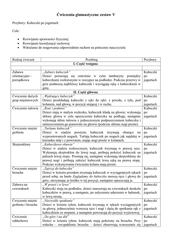 Ćwiczenia gimnastyczne zestaw V Przybory: Kubeczki po jogurtach Cele: Rozwijanie sprawności fizycznej Rozwijanie koordynacji ruchowej Wdrażanie do reagowania odpowiednim ruchem na polecenie nauczyciela Rodzaj ćwiczeń Zabawa orientacyjno porządkowa Ćwiczenie dużych grup mięśniowych Ćwiczenie tułowia Ćwiczenie mięśni grzbietu Skrętoskłony Ćwiczenie mięśni brzucha Zabawa na czworakach Ćwiczenie mięśni grzbietu i brzucha Ćwiczenie oddechowe Przebieg I. Część wstępna „Zabierz kubeczek” Dzieci poruszają się ostrożnie w rytm tamburyny pomiędzy kubeczkami rozłożonymi w rozsypce na podłodze. Podczas przerwy w grze podnoszą najbliższy kubeczek i wyciągają rękę z kubeczkiem w górę. II. Część główna „Wędrujący kubeczek” Dzieci przekładają kubeczki z ręki do ręki: z przodu, z tyłu, pod kolanem, nad głową, w pozycji stojącej i w ruchu. „Rzuć i podnieś” Dzieci stają w małym rozkroku, kubeczek kładą na głowie; wykonują skłony głową w celu upuszczenia kubeczka na podłogę; następnie wykonują skłon tułowia z jednoczesnym podpuszczeniem kubeczka i umieszczeniem go ponownie na głowie (podczas skłonu nogi proste). „Turlamy kubeczek” Dzieci w siadzie prostym; kubeczek trzymają oburącz na wyprostowanych nogach. Turlają kubeczek po nogach jak najdalej w kierunku stóp i z powrotem, mając nogi proste w kolanach. „Kubeczkowe obuwie” Dzieci w siadzie rozkrocznym, kubeczek trzymają w prawej ręce. Wykonują skrętoskłon do lewej nogi, próbują położyć kubeczek na palcach lewej stopy. Prostują się, następnie wykonują skrętoskłony do prawej nogi i próbują założyć kubeczek lewą ręką na prawą stopę. Podczas wykonywania ćwiczenia kolana mają proste. „Zajrzyj do kubeczka” Dzieci w leżeniu przodem trzymają kubeczek w wyciągniętych rękach przed sobą; na hasło Zaglądamy do kubeczka unoszą ręce i głowę do góry, utrzymując je krótko w tej pozycji, następnie opuszczają je. „W prawi i w lewo” Kubeczki stoją na podłodze, dzieci maszerują na czworakach dookoła kubeczków w prawą, a następnie, po usłyszeniu uderzenia w bębenek, w lewą stronę. „Niezwykłe spotkanie” Dzieci w leżeniu tyłem, kubeczek trzymają w rękach wyciągniętych za głową; jednocześnie wznoszą ręce i nogi i dążą do spotkania rąk z kubeczkiem ze stopami, a następnie powracają do pozycji wyjściowej. „Do góry i na dół” Dzieci w leżeniu tyłem, kubeczek mają położony na brzuchu. Przy wdechu – uwypuklenie brzucha – dzieci obserwują wznoszenie się Przybory Kubeczki po jogurtach Kubeczki po jogurtach Kubeczki po jogurtach Kubeczki po jogurtach Kubeczki po jogurtach Kubeczki po jogurtach Kubeczki po jogurtach Kubeczki po jogurtach Kubeczki po jogurtach Ćwiczenie równowagi Zabawa bieżna Rzuty Ćwiczenia stóp Ćwiczenia wyprostne Ćwiczenia rytmiczne Marsz kubeczka do góry; przy wydechu – obserwują jego opadanie. „Jesteśmy uważni” Dzieci w pozycji stojącej; kubeczek mają umieszczony otworem na głowie. Trzy kroki marszu, potem powolny przysiad i powrót do pozycji wyjściowej tak, aby kubeczek nie spadł. „Na druga stronę” Dzieci ustawiają się w szeregu po jednej stronie sali, kubeczki stoją na podłodze przed nimi. Na hasło Na drugą stronę dzieci podnoszą kubeczki, biegną na drugą stronę sali i ustawiają je na podłodze. „Sprytne ręce” Dzieci podrzucają kubeczki obiema rękami, a następnie jedną ręką, i łapią (w miejscu i w ruchu). Potem podrzucają kubeczki, klaszczą w ręce i łapią kubeczki. III. Część końcowa „Sprawne stopy” Dzieci w pozycji stojącej; podnoszą palcami stóp kubeczki i podają sobie do rąk. Wykonują siad skulny podparty, kubeczek mają pomiędzy stopami. Podnoszą stopy z kubeczkami do góry i powracają do pozycji wyjściowej. W pozycji stojącej turlają kubeczek od jednej strony do drugiej. „Jak najwyżej” Dzieci maszerują na palcach po obwodzie koła z rękami trzymającymi kubeczki wyciągniętymi jak najwyżej nad głowę, następnie maszerują na całych stopach. „Podaj rytm” Dzieci siedzą skrzyżnie; nauczyciel wystukuje na bębenku prosty rytm, który dzieci starają się zapamiętać. Na umówiony sygnał powtarzają podany rytm, stukając denkiem kubeczka o podłogę. Dzieci maszerują po obwodzie koła z rytmicznym powtarzaniem rymowanki: Gimnastyka, fajna sprawa, dla nas dzieci to zabawa. Odkładają kubeczki na wskazane miejsce. Kubeczki po jogurtach Kubeczki po jogurtach Kubeczki po jogurtach Kubeczki po jogurtach Kubeczki po jogurtach Kubeczki po jogurtach Kubeczki po jogurtach