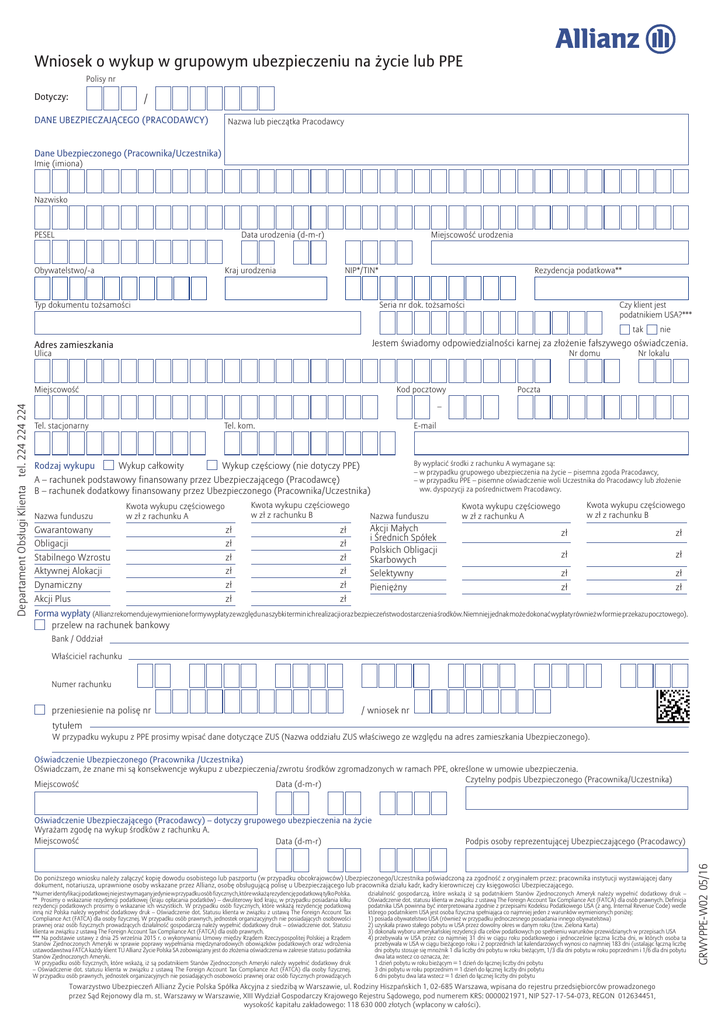 Wniosek o wykup w grupowym ubezpieczeniu na życie lub PPE Polisy nr Dotyczy: / DANE UBEZPIECZAJĄCEGO (PRACODAWCY) Nazwa lub pieczątka Pracodawcy Dane Ubezpieczonego (Pracownika/Uczestnika) Imię (imiona) Nazwisko PESEL Data urodzenia (d-m-r) Obywatelstwo/-a Kraj urodzenia Miejscowość urodzenia NIP*/TIN* Typ dokumentu tożsamości Rezydencja podatkowa** Seria nr dok. tożsamości Czy klient jest podatnikiem USA?*** tak Ulica Nr domu Miejscowość Kod pocztowy Nr lokalu Poczta – Tel. stacjonarny Rodzaj wykupu Wykup całkowity Tel. kom. E-mail Wykup częściowy (nie dotyczy PPE) By wypłacić środki z rachunku A wymagane są: – w przypadku grupowego ubezpieczenia na życie – pisemna zgoda Pracodawcy, – w przypadku PPE – pisemne oświadczenie woli Uczestnika do Pracodawcy lub złożenie ww. dyspozycji za pośrednictwem Pracodawcy. A – rachunek podstawowy finansowany przez Ubezpieczającego (Pracodawcę) B – rachunek dodatkowy finansowany przez Ubezpieczonego (Pracownika/Uczestnika) Nazwa funduszu Kwota wykupu częściowego w zł z rachunku B Kwota wykupu częściowego w zł z rachunku A Gwarantowany Obligacji Stabilnego Wzrostu Aktywnej Alokacji Dynamiczny Akcji Plus zł zł zł zł zł zł zł zł zł zł zł zł Nazwa funduszu Akcji Małych i Średnich Spółek Polskich Obligacji Skarbowych Selektywny Pieniężny Kwota wykupu częściowego w zł z rachunku B Kwota wykupu częściowego w zł z rachunku A zł zł zł zł zł zł zł zł Forma wypłaty ( Allianz rekomenduje wymienione formy wypłaty ze względu na szybki termin ich realizacji oraz bezpieczeństwo dostarczenia środków. Niemniej jednak może dokonać wypłaty również w formie przekazu pocztowego). przelew na rachunek bankowy Bank / Oddział Właściciel rachunku Numer rachunku przeniesienie na polisę nr / wniosek nr tytułem W przypadku wykupu z PPE prosimy wpisać dane dotyczące ZUS (Nazwa oddziału ZUS właściwego ze względu na adres zamieszkania Ubezpieczonego). Oświadczenie Ubezpieczonego (Pracownika /Uczestnika) Oświadczam, że znane mi są konsekwencje wykupu z ubezpieczenia/zwrotu środków zgromadzonych w ramach PPE, określone w umowie ubezpieczenia. Czytelny podpis Ubezpieczonego (Pracownika/Uczestnika) Miejscowość Data (d-m-r) Oświadczenie Ubezpieczającego (Pracodawcy) – dotyczy grupowego ubezpieczenia na życie Wyrażam zgodę na wykup środków z rachunku A. Miejscowość Data (d-m-r) Podpis osoby reprezentującej Ubezpieczającego (Pracodawcy) Do poniższego wniosku należy załączyć kopię dowodu osobistego lub paszportu (w przypadku obcokrajowców) Ubezpieczonego/Uczestnika poświadczoną za zgodność z oryginałem przez: pracownika instytucji wystawiającej dany dokument, notariusza, uprawnione osoby wskazane przez Allianz, osobę obsługującą polisę u Ubezpieczającego lub pracownika działu kadr, kadry kierowniczej czy księgowości Ubezpieczającego. * Numer identyfikacji podatkowej nie jest wymagany jedynie w przypadku osób fizycznych, które wskażą rezydencję podatkową tylko Polska. ** Prosimy o wskazanie rezydencji podatkowej (kraju opłacania podatków) – dwuliterowy kod kraju, w przypadku posiadania kilku rezydencji podatkowych prosimy o wskazanie ich wszystkich. W przypadku osób fizycznych, które wskażą rezydencję podatkową inną niż Polska należy wypełnić dodatkowy druk – Oświadczenie dot. Statusu klienta w związku z ustawą The Foreign Account Tax Compliance Act (FATCA) dla osoby fizycznej. W przypadku osób prawnych, jednostek organizacyjnych nie posiadających osobowości prawnej oraz osób fizycznych prowadzących działalność gospodarczą należy wypełnić dodatkowy druk – oświadczenie dot. Statusu klienta w związku z ustawą The Foreign Account Tax Compliance Act (FATCA) dla osób prawnych. *** Na podstawie ustawy z dnia 25 września 2015 r. o wykonywaniu Umowy między Rządem Rzeczypospolitej Polskiej a Rządem Stanów Zjednoczonych Ameryki w sprawie poprawy wypełniania międzynarodowych obowiązków podatkowych oraz wdrożenia ustawodawstwa FATCA każdy klient TU Allianz Życie Polska SA zobowiązany jest do złożenia oświadczenia w zakresie statusu podatnika Stanów Zjednoczonych Ameryki. W przypadku osób fizycznych, które wskażą, iż są podatnikiem Stanów Zjednoczonych Ameryki należy wypełnić dodatkowy druk – Oświadczenie dot. statusu klienta w związku z ustawą The Foreign Account Tax Compliance Act (FATCA) dla osoby fizycznej. W przypadku osób prawnych, jednostek organizacyjnych nie posiadających osobowości prawnej oraz osób fizycznych prowadzących działalność gospodarczą, które wskażą iż są podatnikiem Stanów Zjednoczonych Ameryk należy wypełnić dodatkowy druk – Oświadczenie dot. statusu klienta w związku z ustawą The Foreign Account Tax Compliance Act (FATCA) dla osób prawnych. Definicja podatnika USA powinna być interpretowana zgodnie z przepisami Kodeksu Podatkowego USA (z ang. Internal Revenue Code) wedle którego podatnikiem USA jest osoba fizyczna spełniająca co najmniej jeden z warunków wymienionych poniżej: 1) posiada obywatelstwo USA (również w przypadku jednoczesnego posiadania innego obywatelstwa) 2) uzyskała prawo stałego pobytu w USA przez dowolny okres w danym roku (tzw. Zielona Karta) 3) dokonała wyboru amerykańskiej rezydencji dla celów podatkowych po spełnieniu warunków przewidzianych w przepisach USA 4) przebywała w USA przez co najmniej 31 dni w ciągu roku podatkowego i jednocześnie łączna liczba dni, w których osoba ta przebywała w USA w ciągu bieżącego roku i 2 poprzednich lat kalendarzowych wynosi co najmniej 183 dni (ustalając łączną liczbę dni pobytu stosuje się mnożnik 1 dla liczby dni pobytu w roku bieżącym, 1/3 dla dni pobytu w roku poprzednim i 1/6 dla dni pobytu dwa lata wstecz co oznacza, że: 1 dzień pobytu w roku bieżącym = 1 dzień do łącznej liczby dni pobytu 3 dni pobytu w roku poprzednim = 1 dzień do łącz