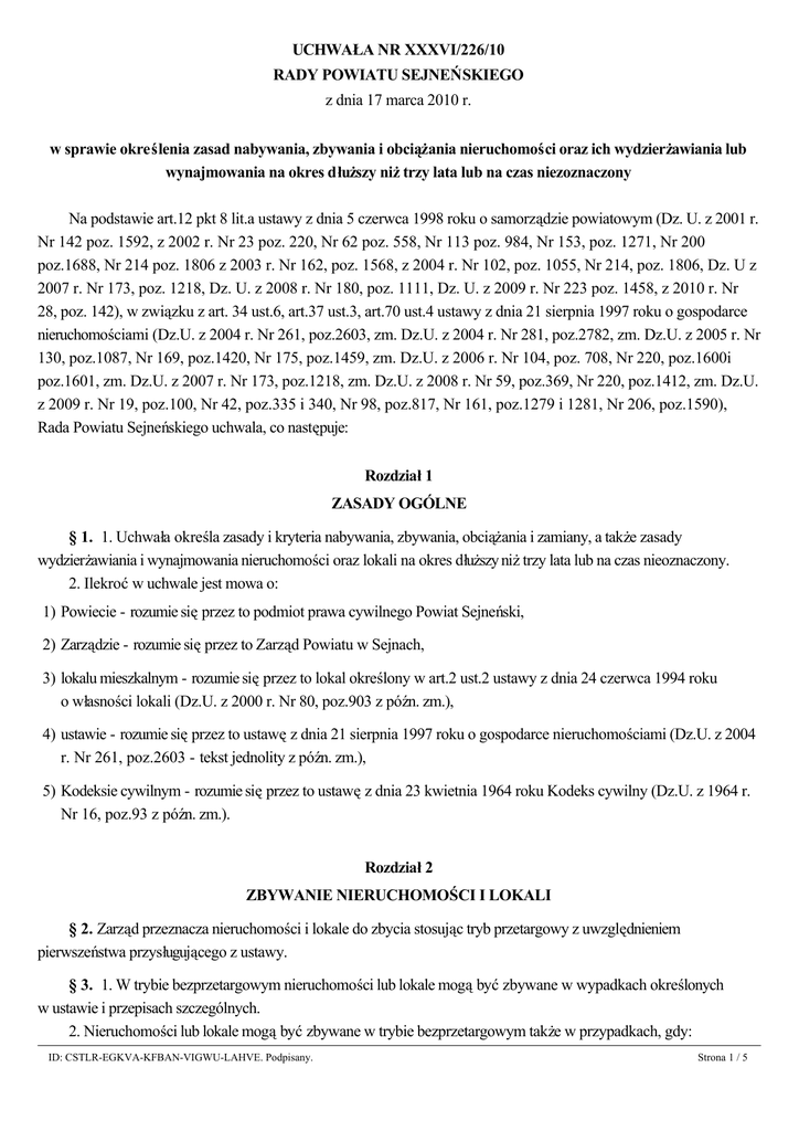 UCHWAŁA NR XXXVI/226/10 RADY POWIATU SEJNEŃSKIEGO z dnia 17 marca 2010 r. w sprawie określenia zasad nabywania, zbywania i obciążania nieruchomości oraz ich wydzierżawiania lub wynajmowania na okres dłuższy niż trzy lata lub na czas niezoznaczony Na podstawie art.12 pkt 8 lit.a ustawy z dnia 5 czerwca 1998 roku o samorządzie powiatowym (Dz. U. z 2001 r. Nr 142 poz. 1592, z 2002 r. Nr 23 poz. 220, Nr 62 poz. 558, Nr 113 poz. 984, Nr 153, poz. 1271, Nr 200 poz.1688, Nr 214 poz. 1806 z 2003 r. Nr 162, poz. 1568, z 2004 r. Nr 102, poz. 1055, Nr 214, poz. 1806, Dz. U z 2007 r. Nr 173, poz. 1218, Dz. U. z 2008 r. Nr 180, poz. 1111, Dz. U. z 2009 r. Nr 223 poz. 1458, z 2010 r. Nr 28, poz. 142), w związku z art. 34 ust.6, art.37 ust.3, art.70 ust.4 ustawy z dnia 21 sierpnia 1997 roku o gospodarce nieruchomościami (Dz.U. z 2004 r. Nr 261, poz.2603, zm. Dz.U. z 2004 r. Nr 281, poz.2782, zm. Dz.U. z 2005 r. Nr 130, poz.1087, Nr 169, poz.1420, Nr 175, poz.1459, zm. Dz.U. z 2006 r. Nr 104, poz. 708, Nr 220, poz.1600i poz.1601, zm. Dz.U. z 2007 r. Nr 173, poz.1218, zm. Dz.U. z 2008 r. Nr 59, poz.369, Nr 220, poz.1412, zm. Dz.U. z 2009 r. Nr 19, poz.100, Nr 42, poz.335 i 340, Nr 98, poz.817, Nr 161, poz.1279 i 1281, Nr 206, poz.1590), Rada Powiatu Sejneńskiego uchwala, co następuje: Rozdział 1 ZASADY OGÓLNE § 1. 1. Uchwała określa zasady i kryteria nabywania, zbywania, obciążania i zamiany, a także zasady wydzierżawiania i wynajmowania nieruchomości oraz lokali na okres dłuższy niż trzy lata lub na czas nieoznaczony. 2. Ilekroć w uchwale jest mowa o: 1) Powiecie - rozumie się przez to podmiot prawa cywilnego Powiat Sejneński, 2) Zarządzie - rozumie się przez to Zarząd Powiatu w Sejnach, 3) lokalu mieszkalnym - rozumie się przez to lokal określony w art.2 ust.2 ustawy z dnia 24 czerwca 1994 roku o własności lokali (Dz.U. z 2000 r. Nr 80, poz.903 z późn. zm.), 4) ustawie - rozumie się przez to ustawę z dnia 21 sierpnia 1997 roku o gospodarce nieruchomościami (Dz.U. z 2004 r. Nr 261, poz.2603 - tekst jednolity z późn. zm.), 5) Kodeksie cywilnym - rozumie się przez to ustawę z dnia 23 kwietnia 1964 roku Kodeks cywilny (Dz.U. z 1964 r. Nr 16, poz.93 z późn. zm.). Rozdział 2 ZBYWANIE NIERUCHOMOŚCI I LOKALI § 2. Zarząd przeznacza nieruchomości i lokale do zbycia stosując tryb przetargowy z uwzględnieniem pierwszeństwa przysługującego z ustawy. § 3. 1. W trybie bezprzetargowym nieruchomości lub lokale mogą być zbywane w wypadkach określonych w ustawie i przepisach szczególnych. 2. Nieruchomości lub lokale mogą być zbywane w trybie bezprzetargowym także w przypadkach, gdy: CSTLR-EGKVA-KFBAN-VIGWU-LAHVE. Podpisany. Strona 1 / 5 1)ID:sprzedaż nieruchomości następuje na rzecz osoby, która dzierżawi nieruchomość na podstawie umowy zawartej co najmniej na 10 lat, a nieruchomość ta została zabudowana na podstawie zezwolenia na budowę przez dzierżawcę lub jego poprzednika prawnego, w ustawie i przepisach szczególnych. 2. Nieruchomości lub lokale mogą być zbywane w trybie bezprzetargowym także w przypadkach, gdy: 1) sprzedaż nieruchomości następuje na rzecz osoby, która dzierżawi nieruchomość na podstawie umowy zawartej co najmniej na 10 lat, a nieruchomość ta została zabudowana na podstawie zezwolenia na budowę przez dzierżawcę lub jego poprzednika prawnego, 2) przeznaczone są na realizację urządzeń infrastruktury technicznej albo innych celów publicznych; jeżeli cele te będą realizowane przez podmioty, dla których są to cele statutowe i których dochody przeznaczone są w całości na działalność statutową, 3) Przepis ust.1 i 2 nie stosuje się, gdy o nabycie nieruchomości ubiega się więcej niż jeden podmiot spełniający powyższe warunki. § 4. W trybie bezprzetargowym nieruchomości i lokale zbywa się za cenę ustaloną po przeprowadzeniu rokowań, jednakże nie niższą od ich wartości, chyba że zastosowano przewidzianą ustawą bonifikatę. § 5. 1. Zarząd przeznacza nieruchomości lub lokale do zbycia w drodze uchwały o przeznaczeniu do zbycia. 2. Zarząd ustalając cenę zbycia lub cenę wywoławczą nieruchomości lub lokalu stosuje następujące zasady: 1) cenę ustala się w oparciu o wycenę rzeczoznawcy majątkowego sporządzoną nie dalej jak 3 miesiące przed podjęciem uchwały o przeznaczeniu do zbycia, 2) postanowienia dotyczące ceny sprzedaży nieruchomości lub lokalu wiążą w okresie 6 miesięcy od dnia podjęcia uchwały, 3) na poczet ceny zalicza się uzgodnione z wynajmującym lub dzierżawcą nakłady dokonane na przedmiocie podlegającym zbyciu, a poniesione przez niego i nie rozliczone uprzednio przez wynajmującego, 4) cenę nieruchomości wpisanych do rejestru zabytków, ustaloną przez rzeczoznawcę majątkowego obniża się o 30%. 3. Postanowienia ustępów poprzedzających stosuje się odpowiednio do oddania nieruchomości w użytkowanie, do wynajmowania i wydzierżawiania nieruchomości. Rozdział 3 ZAMIANA NIERUCHOMOŚCI LUB LOKALI § 6. 1. Zamiany nieruchomości lub lokali dokonuje się w wypadkach uzasadnionych interesami Powiatu. 2. Zamiany dokonuje się w szczególności ze względu na: 1) zamierzenia inwestycyjne Powiatu, 2) konieczność realizacji zadań własnych i zleconych, 3) obowiązki wynikające z przepisów szczególnych, 4) realizację innych celów publicznych. 3. Zamiany nieruchomości lub lokali dokonuje się po przeprowadzeniu rokowań, w których uzgadnia się istotne postanowienia przyszłej umowy. 4. Dokonując zamiany bierze się pod uwagę wartość zamienianych nieruchomości lub lokali według wyceny rzeczoznawcy majątkowego. 5. Rozliczenie należności stron z tytułu zamiany nieruchomości lub lokali obejmować może oprócz wartości nieruchomości również odszkodowania i inne wzajemne zobowiązania stron. ID: CSTLR-EGKVA-KFBAN-VIGWU-LAHVE. Podpisany. Strona 2 / 5 Rozdział 4 NABYWANIE NIERUCHOMOŚCI I LOKALI 5. Rozliczenie nale
