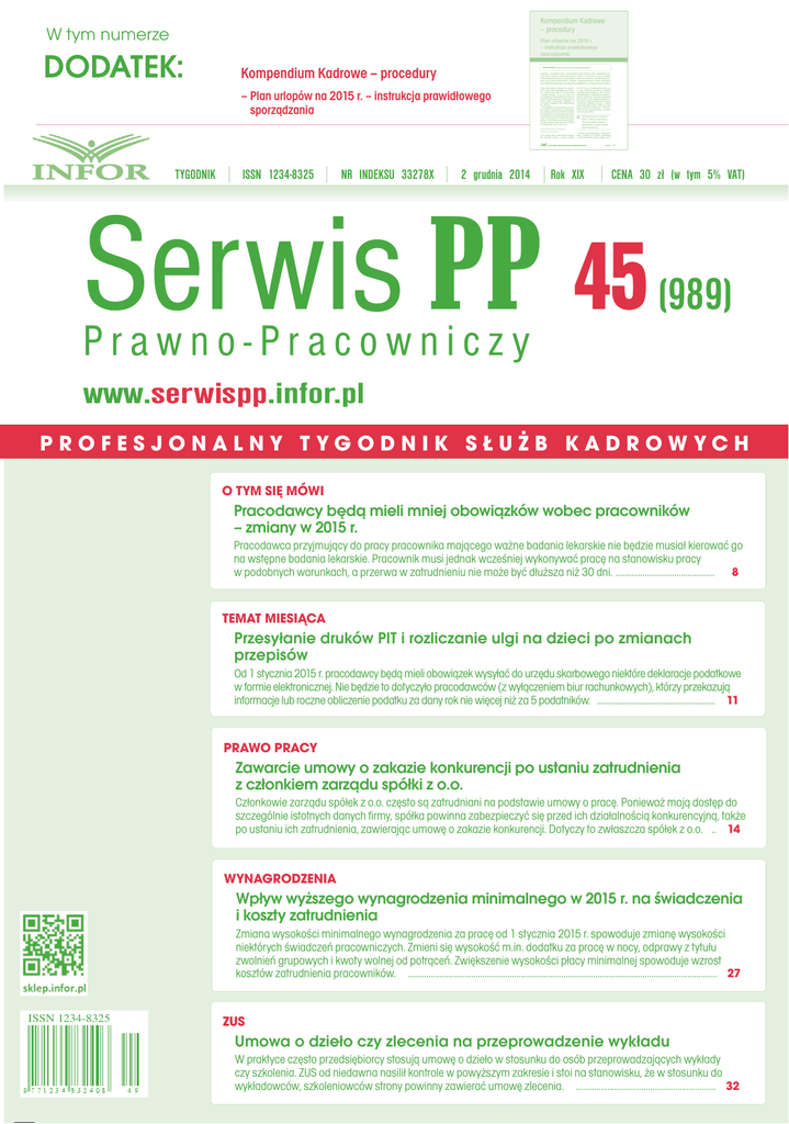 W tym numerze DODATEK: Kompendium Kadrowe – procedury – Plan urlopów na 2015 r. – instrukcja prawidłowego sporządzania TYGODNIK ISSN 1234-8325 NR INDEKSU 33278X 2 grudnia 2014 Rok XIX CENA 30 zł (w tym 5% VAT) Serwis PP 45 (989) Prawno-Pracowniczy www.serwispp.infor.pl PROFESJONALNY TYGODNIK SŁUŻB KADROWYCH O TYM SIĘ MÓWI Pracodawcy będą mieli mniej obowiązków wobec pracowników – zmiany w 2015 r. Pracodawca przyjmujący do pracy pracownika mającego ważne badania lekarskie nie będzie musiał kierować go na wstępne badania lekarskie. Pracownik musi jednak wcześniej wykonywać pracę na stanowisku pracy w podobnych warunkach, a przerwa w zatrudnieniu nie może być dłuższa niż 30 dni. ............................................ 8 TEMAT MIESIĄCA Przesyłanie druków PIT i rozliczanie ulgi na dzieci po zmianach przepisów Od 1 stycznia 2015 r. pracodawcy będą mieli obowiązek wysyłać do urzędu skarbowego niektóre deklaracje podatkowe w formie elektronicznej. Nie będzie to dotyczyło pracodawców (z wyłączeniem biur rachunkowych), którzy przekazują informacje lub roczne obliczenie podatku za dany rok nie więcej niż za 5 podatników. ........................................................... 11 PRAWO PRACY Zawarcie umowy o zakazie konkurencji po ustaniu zatrudnienia z członkiem zarządu spółki z o.o. Członkowie zarządu spółek z o.o. często są zatrudniani na podstawie umowy o pracę. Ponieważ mają dostęp do szczególnie istotnych danych firmy, spółka powinna zabezpieczyć się przed ich działalnością konkurencyjną, także po ustaniu ich zatrudnienia, zawierając umowę o zakazie konkurencji. Dotyczy to zwłaszcza spółek z o.o. .. 14 WYNAGRODZENIA Wpływ wyższego wynagrodzenia minimalnego w 2015 r. na świadczenia i koszty zatrudnienia Zmiana wysokości minimalnego wynagrodzenia za pracę od 1 stycznia 2015 r. spowoduje zmianę wysokości niektórych świadczeń pracowniczych. Zmieni się wysokość m.in. dodatku za pracę w nocy, odprawy z tytułu zwolnień grupowych i kwoty wolnej od potrąceń. Zwiększenie wysokości płacy minimalnej spowoduje wzrost kosztów zatrudnienia pracowników. ......................................................................................................................................... 27 ISSN 1234-8325 ZUS Umowa o dzieło czy zlecenia na przeprowadzenie wykładu W praktyce często przedsiębiorcy stosują umowę o dzieło w stosunku do osób przeprowadzających wykłady czy szkolenia. ZUS od niedawna nasilił kontrole w powyższym zakresie i stoi na stanowisku, że w stosunku do wykładowców, szkoleniowców strony powinny zawierać umowę zlecenia. .............................................................. 32 PRENUMERATA 2015 OPŁAĆ PRENUMERATĘ SERWISU PRAWNO-PRACOWNICZEGO na 2015 rok w grudniu br. i wybierz prezent: POWER BANK przenośna bateria do ładowania telefonu lub tabletu PENDRIVE przenośna pamięć o pojemności 8 GB Już dziś wejdź na www.sklep.infor.pl/oferta i wybierz prezent! Dodatkowo prezent gwarantowany kalendarz książkowy na 2015 rok. www.sklep.infor.pl/oferta 801 626 666, 22 212 07 30 [email protected] SPIS TREŚCI Spis treści AKTUALNOŚCI DZIAŁALNOŚĆ SOCJALNA Przegląd zmian prawa ............................................ 4 Korekta odpisu na zfśs – jak prawidłowo ją Kalendarz ważnych terminów .............................. 5 Wskaźniki i stawki ................................................. 6 przeprowadzić ......................................................... 37 O TO PYTAJĄ KADROWI Czy polski pracodawca musi płacić O TYM SIĘ MÓWI wynagrodzenie urlopowe pracownikowi, Pracodawcy będą mieli mniej obowiązków który dostał je za granicą ....................................... 39 wobec pracowników – zmiany w 2015 r. ............. 8 Czy za czas poświęcony badaniom kontrolnym pracownik zachowuje prawo TEMAT MIESIĄCA – ZMIANY W PDOF W 2015 R. do wynagrodzenia .................................................. 39 Przesyłanie druków PIT i rozliczanie ulgi na dzieci Czy staż pracy przyjmowany do obliczenia po zmianach przepisów ......................................... 11 wymiaru urlopu wypoczynkowego może być ustalany na podstawie oświadczenia PRAWO PRACY Zawarcie umowy o zakazie konkurencji po ustaniu pracownika .............................................................. 39 Czy lekarz może zdecydować, jaka praca jest niewskazana dla pracownicy w ciąży ................... 39 zatrudnienia z członkiem zarządu spółki z o.o. .. 14 Czy czas ewakuacji należy wliczać do czasu pracy pracowników ........................................................... 17 Z WOKANDY Imprezy integracyjne nie stanowią przychodu pracownika .............................................................. 40 WYNAGRODZENIA PYTANIA Z FORUM Wpływ wyższego wynagrodzenia minimalnego w 2015 r. na świadczenia i koszty zatrudnienia .. 27 Jak obliczyć ekwiwalent za urlop wypoczynkowy Ile paczek świątecznych powinno dostać dziecko, którego rodzice zatrudnieni są u tego samego pracodawcy .............................................................. 41 na przełomie roku .................................................. 30 ZUS Umowa o dzieło czy zlecenia na przeprowadzenie DODATEK wykładu .................................................................... 32 Kompendium Kadrowe – procedury Czy ubezpieczona ma prawo do zasiłku Plan urlopów na 2015 r. – instrukcja opiekuńczego, jeżeli jej mąż prowadzi działalność prawidłowego sporządzania .......................... 19 gospodarczą ............................................................. 35 BAZA WIEDZY Z ZAKRESU PODATKÓW, RACHUNKOWOŚCI I PRAWA nr 45/2014 3 AKTUALNOŚCI I. PRZEGLĄD ZMIAN PRAWA Ułatwienia w usługowym prowadzeniu ksiąg rachunkowych Od 13 listopada 2014 r. zostały zniesione obowiązki w zakresie stażu adaptacyjnego i testu umiejętności dla osób ub