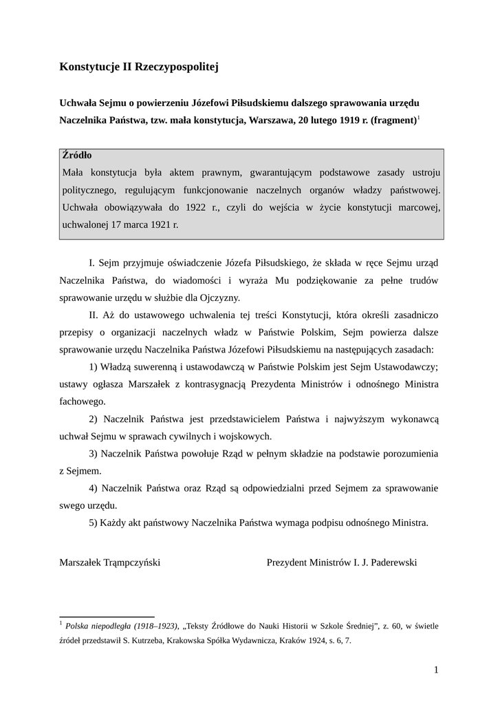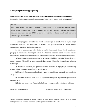 Konstytucje II Rzeczypospolitej Uchwała Sejmu o powierzeniu Józefowi Piłsudskiemu dalszego sprawowania urzędu Naczelnika Państwa, tzw. mała konstytucja, Warszawa, 20 lutego 1919 r. (fragment)1 Źródło Mała konstytucja była aktem prawnym, gwarantującym podstawowe zasady ustroju politycznego, regulującym funkcjonowanie naczelnych organów władzy państwowej. Uchwała obowiązywała do 1922 r., czyli do wejścia w życie konstytucji marcowej, uchwalonej 17 marca 1921 r. I. Sejm przyjmuje oświadczenie Józefa Piłsudskiego, że składa w ręce Sejmu urząd Naczelnika Państwa, do wiadomości i wyraża Mu podziękowanie za pełne trudów sprawowanie urzędu w służbie dla Ojczyzny. II. Aż do ustawowego uchwalenia tej treści Konstytucji, która określi zasadniczo przepisy o organizacji naczelnych władz w Państwie Polskim, Sejm powierza dalsze sprawowanie urzędu Naczelnika Państwa Józefowi Piłsudskiemu na następujących zasadach: 1) Władzą suwerenną i ustawodawczą w Państwie Polskim jest Sejm Ustawodawczy; ustawy ogłasza Marszałek z kontrasygnacją Prezydenta Ministrów i odnośnego Ministra fachowego. 2) Naczelnik Państwa jest przedstawicielem Państwa i najwyższym wykonawcą uchwał Sejmu w sprawach cywilnych i wojskowych. 3) Naczelnik Państwa powołuje Rząd w pełnym składzie na podstawie porozumienia z Sejmem. 4) Naczelnik Państwa oraz Rząd są odpowiedzialni przed Sejmem za sprawowanie swego urzędu. 5) Każdy akt państwowy Naczelnika Państwa wymaga podpisu odnośnego Ministra. Marszałek Trąmpczyński 1 Prezydent Ministrów I. J. Paderewski Polska niepodległa (1918–1923), „Teksty Źródłowe do Nauki Historii w Szkole Średniej”, z. 60, w świetle źródeł przedstawił S. Kutrzeba, Krakowska Spółka Wydawnicza, Kraków 1924, s. 6, 7. 1 Pytania, zadania, problemy 1. Wyjaśnij pojęcie „kontrasygnata”. 2. Określ zakres i pochodzenie władzy Naczelnika Państwa. 3. Kto, według małej konstytucji, sprawował władzę ustawodawczą, a kto wykonawczą? 2 Konstytucja marcowa, 1921 r.2 Źródło Pierwsza polska konstytucja uchwalona po odzyskaniu niepodległości ustanowiła republikańską formę państwa i ustrój parlamentarno-gabinetowy. Władzę ustawodawczą powierzono sejmowi i senatowi, wykonawczą – prezydentowi i rządowi, wymiar sprawiedliwości – niezawisłym sądom. Po przewrocie majowym konstytucja została znowelizowana 2 sierpnia 1926 r. tzw. nowelą sierpniową, która zwiększyła uprawnienia prezydenta kosztem parlamentu. W 1935 r. zastąpiła ją konstytucja kwietniowa. W Imię Boga Wszechmogącego! […] Rozdział I. RZECZPOSPOLITA Art. 1. Państwo Polskie jest Rzecząpospolitą. Art. 2. Władza zwierzchnia w Rzeczypospolitej Polskiej należy do Narodu. Organami Narodu w zakresie ustawodawstwa są Sejm i Senat, w zakresie władzy wykonawczej – Prezydent Rzeczypospolitej łącznie z odpowiedzialnymi ministrami, w zakresie wymiaru sprawiedliwości – niezawisłe Sądy. Rozdział II. WŁADZA USTAWODAWCZA Art. 3. Zakres ustawodawstwa państwowego obejmuje stanowienie wszelkich praw publicznych i prywatnych i sposobu ich wykonania. Nie ma ustawy bez zgody Sejmu, wyrażonej w sposób regulaminowo ustalony. Ustawa, uchwalona przez Sejm, zyskuje moc obowiązującą w czasie przez nią samą określonym. Rzeczpospolita Polska, opierając swój ustrój na zasadzie szerokiego samorządu terytorialnego, przekaże przedstawicielstwom tego samorządu właściwy zakres ustawodawstwa, zwłaszcza z dziedziny administracji, kultury i gospodarstwa, który zostanie bliżej określony ustawami państwowymi. Rozporządzenia władzy, z których wynikają prawa lub obowiązki obywateli, mają moc obowiązującą tylko wtedy, gdy zostały wydane z upoważnienia ustawy i z powołaniem się na nią. [...] 2 Konstytucja Rzeczypospolitej Polskiej z 17 marca 1921 r., „Dziennik Ustaw Rzeczypospolitej Polskiej”, 1 VI 1921, nr 44. 3 Art. 11. Sejm składa się z posłów wybranych na lat pięć, licząc od dnia otwarcia Sejmu, w głosowaniu powszechnym, tajnym, bezpośrednim, równym i stosunkowym. Art. 12. Prawo wybierania ma każdy obywatel polski bez różnicy płci, który w dniu ogłoszenia wyborów ukończył lat 21, używa w pełni praw cywilnych i zamieszkuje w okręgu wyborczym przynajmniej od przedednia ogłoszenia wyborów w Dzienniku Ustaw. Prawo głosowania może być wykonywane tylko osobiście. Wojskowi w służbie czynnej nie mają prawa głosowania. Art. 13. Prawo wybieralności ma każdy obywatel, mający prawo wybierania do Sejmu, nie wyjmując wojskowych w służbie czynnej, niezależnie od miejsca zamieszkania, o ile ukończył lat 25. [...] Art. 21. Posłowie nie mogą być pociągani do odpowiedzialności za swoją działalność w Sejmie lub poza Sejmem, wchodzącą w zakres wykonania mandatu poselskiego, ani w czasie trwania mandatu, ani po jego wygaśnięciu. Za przemówienia i odezwania się, tudzież manifestacje w Sejmie posłowie odpowiadają tylko przed Sejmem. Za naruszenie prawa osoby trzeciej mogą być pociągnięci do odpowiedzialności sądowej, o ile władza sądowa uzyska na to zezwolenie Sejmu. Postępowanie karno-sądowe, karno-administracyjne lub dyscyplinarne, wdrożone przeciw posłowi przed uzyskaniem mandatu poselskiego, ulegnie na żądanie Sejmu zawieszeniu aż do wygaśnięcia mandatu. Bieg przedawnienia przeciw posłowi w postępowaniu karnym ulega przerwie na czas trwania mandatu poselskiego. Przez cały czas trwania mandatu posłowie nie mogą być pociągani do odpowiedzialności karno-sądowej, karno-administracyjnej i dyscyplinarnej ani pozbawieni wolności bez zezwolenia Sejmu. W wypadku schwytania posła na gorącym uczynku zbrodni pospolitej, jeżeli jego przytrzymanie jest niezbędne dla zabezpieczenia wymiaru sprawiedliwości, względnie dla unieszkodliwienia skutków przestępstwa, władza sądowa ma obowiązek bezzwłocznego zawiadomienia o tym Marszałka Sejmu dla uzyskania zezwol