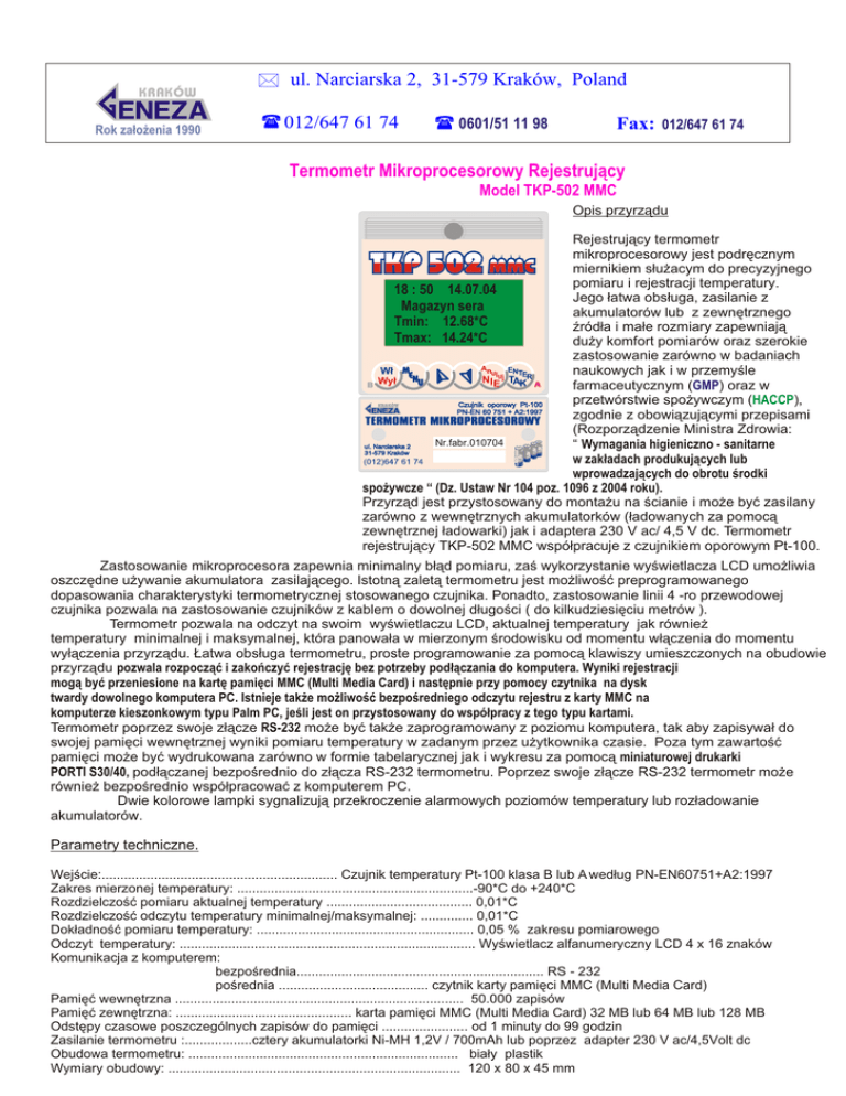 KRAKÓW Rok za³o¿enia 1990 * ul. Narciarska 2, 31-579 Kraków, Poland ( 012/647 61 74 0601/51 1170 98 95 ( 012/643 Fax: 012/422 36 06 012/647 61 74 Termometr Mikroprocesorowy Rejestruj¹cy Model TKP-502 MMC Opis przyrz¹du Rejestruj¹cy termometr mikroprocesorowy jest podrêcznym miernikiem s³u¿acym do precyzyjnego pomiaru i rejestracji temperatury. 18 : 50 14.07.04 Jego ³atwa obs³uga, zasilanie z Magazyn sera akumulatorów lub z zewnêtrznego Tmin: 12.68*C Ÿród³a i ma³e rozmiary zapewniaj¹ Tmax: 14.24*C du¿y komfort pomiarów oraz szerokie zastosowanie zarówno w badaniach naukowych jak i w przemyœle farmaceutycznym (GMP) oraz w przetwórstwie spo¿ywczym (HACCP), zgodnie z obowi¹zuj¹cymi przepisami (Rozporz¹dzenie Ministra Zdrowia: Nr.fabr.010704 “ Wymagania higieniczno - sanitarne w zak³adach produkuj¹cych lub wprowadzaj¹cych do obrotu œrodki spo¿ywcze “ (Dz. Ustaw Nr 104 poz. 1096 z 2004 roku). Przyrz¹d jest przystosowany do monta¿u na œcianie i mo¿e byæ zasilany zarówno z wewnêtrznych akumulatorków (³adowanych za pomoc¹ zewnêtrznej ³adowarki) jak i adaptera 230 V ac/ 4,5 V dc. Termometr rejestruj¹cy TKP-502 MMC wspó³pracuje z czujnikiem oporowym Pt-100. Zastosowanie mikroprocesora zapewnia minimalny b³¹d pomiaru, zaœ wykorzystanie wyœwietlacza LCD umo¿liwia oszczêdne u¿ywanie akumulatora zasilaj¹cego. Istotn¹ zalet¹ termometru jest mo¿liwoœæ preprogramowanego dopasowania charakterystyki termometrycznej stosowanego czujnika. Ponadto, zastosowanie linii 4 -ro przewodowej czujnika pozwala na zastosowanie czujników z kablem o dowolnej d³ugoœci ( do kilkudziesiêciu metrów ). Termometr pozwala na odczyt na swoim wyœwietlaczu LCD, aktualnej temperatury jak równie¿ temperatury minimalnej i maksymalnej, która panowa³a w mierzonym œrodowisku od momentu w³¹czenia do momentu wy³¹czenia przyrz¹du. £atwa obs³uga termometru, proste programowanie za pomoc¹ klawiszy umieszczonych na obudowie przyrz¹du pozwala rozpocz¹æ i zakoñczyæ rejestracjê bez potrzeby pod³¹czania do komputera. Wyniki rejestracji mog¹ byæ przeniesione na kartê pamiêci MMC (Multi Media Card) i nastêpnie przy pomocy czytnika na dysk twardy dowolnego komputera PC. Istnieje tak¿e mo¿liwoœæ bezpoœredniego odczytu rejestru z karty MMC na komputerze kieszonkowym typu Palm PC, jeœli jest on przystosowany do wspó³pracy z tego typu kartami. Termometr poprzez swoje z³¹cze RS-232 mo¿e byæ tak¿e zaprogramowany z poziomu komputera, tak aby zapisywa³ do swojej pamiêci wewnêtrznej wyniki pomiaru temperatury w zadanym przez u¿ytkownika czasie. Poza tym zawartoœæ pamiêci mo¿e byæ wydrukowana zarówno w formie tabelarycznej jak i wykresu za pomoc¹ miniaturowej drukarki PORTI S30/40, pod³¹czanej bezpoœrednio do z³¹cza RS-232 termometru. Poprzez swoje z³¹cze RS-232 termometr mo¿e równie¿ bezpoœrednio wspó³pracowaæ z komputerem PC. Dwie kolorowe lampki sygnalizuj¹ przekroczenie alarmowych poziomów temperatury lub roz³adowanie akumulatorów. Parametry techniczne. Wejœcie:............................................................... Czujnik temperatury Pt-100 klasa B lub A wed³ug PN-EN60751+A2:1997 Zakres mierzonej temperatury: ...............................................................-90*C do +240*C Rozdzielczoœæ pomiaru aktualnej temperatury ....................................... 0,01*C Rozdzielczoœæ odczytu temperatury minimalnej/maksymalnej: .............. 0,01*C Dok³adnoœæ pomiaru temperatury: .......................................................... 0,05 % zakresu pomiarowego Odczyt temperatury: ............................................................................... Wyœwietlacz alfanumeryczny LCD 4 x 16 znaków Komunikacja z komputerem: bezpoœrednia.................................................................. RS - 232 poœrednia ........................................ czytnik karty pamiêci MMC (Multi Media Card) Pamiêæ wewnêtrzna ............................................................................. 50.000 zapisów Pamiêæ zewnêtrzna: ............................................... karta pamiêci MMC (Multi Media Card) 32 MB lub 64 MB lub 128 MB Odstêpy czasowe poszczególnych zapisów do pamiêci ....................... od 1 minuty do 99 godzin Zasilanie termometru :..................cztery akumulatorki Ni-MH 1,2V / 700mAh lub poprzez adapter 230 V ac/4,5Volt dc Obudowa termometru: ........................................................................ bia³y plastik Wymiary obudowy: .............................................................................. 120 x 80 x 45 mm