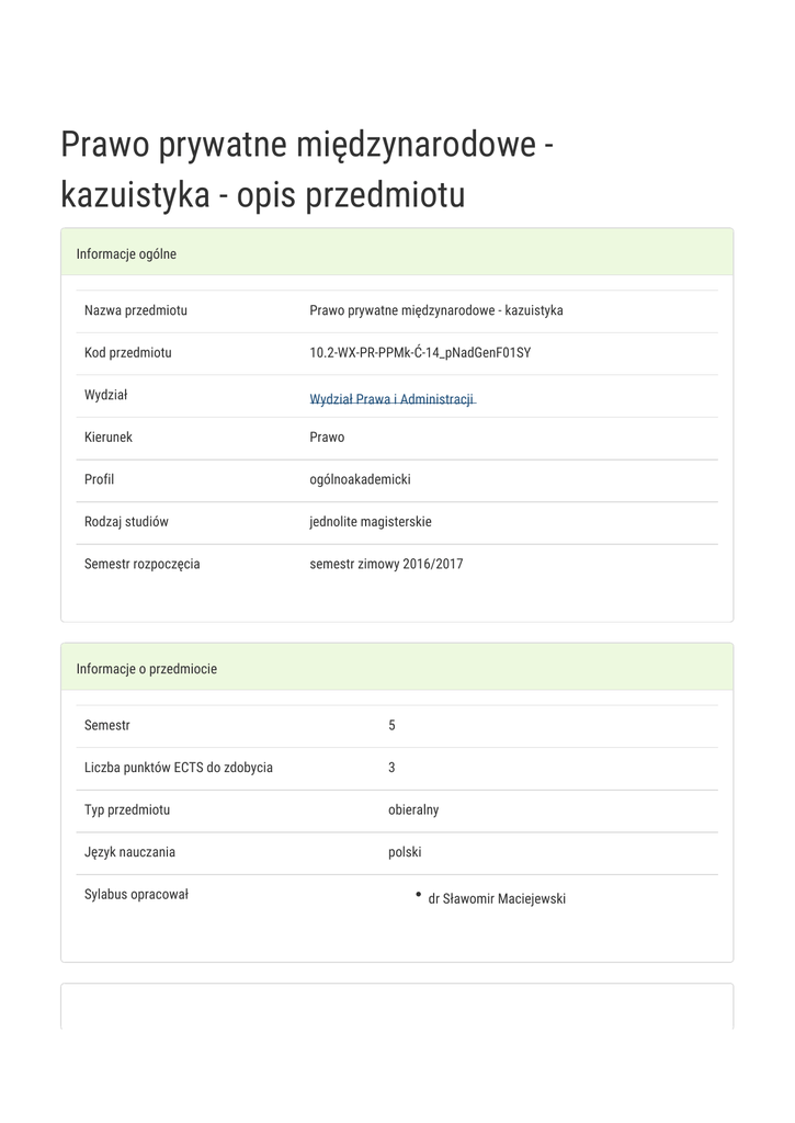Prawo prywatne międzynarodowe kazuistyka - opis przedmiotu Informacje ogólne Nazwa przedmiotu Prawo prywatne międzynarodowe - kazuistyka Kod przedmiotu 10.2-WX-PR-PPMk-Ć-14_pNadGenF01SY Wydział Wydział Prawa i Administracji Kierunek Prawo Profil ogólnoakademicki Rodzaj studiów jednolite magisterskie Semestr rozpoczęcia semestr zimowy 2016/2017 Informacje o przedmiocie Semestr 5 Liczba punktów ECTS do zdobycia 3 Typ przedmiotu obieralny Język nauczania polski Sylabus opracował dr Sławomir Maciejewski Formy zajęć Forma Liczba godzin w Liczba godzin w Liczba godzin w Liczba godzin w Forma zajęć semestrze tygodniu semestrze tygodniu zaliczenia (stacjonarne) (stacjonarne) (niestacjonarne) (niestacjonarne) 30 2 18 1,2 Ćwiczenia Zaliczenie na ocenę Cel przedmiotu Celem przedmiotu jest rozszerzenie umiejętności studenta praktycznego stosowania przepisów prawa prywatnego międzynarodowego. Wymagania wstępne brak Zakres tematyczny Prawo prywatne międzynarodowe – pojęcie, zasady źródła. Osoby fizyczne. Osoby prawne i inne jednostki organizacyjne. Przedstawicielstwo. Dokonanie czynności prawnej i jej forma. Przedawnienie roszczeń i inne instytucje związane z upływem czasu. Zobowiązania. Umowa o arbitraż. Własność i inne prawa rzeczowe. Posiadanie. Własność intelektualna. Sprawy małżeńskie. Stosunki między rodzicami a dzieckiem. Przysposobienie. Opieka i kuratela. Obowiązki alimentacyjne. Sprawy spadkowe. Inne stosunki prawne. Międzynarodowe postępowanie cywilne. Metody kształcenia Studium przypadku, ćwiczenia przedmiotowe, praca w grupach, dyskusja dydaktyczna, metoda aktywizująca, analiza źródeł rozwiązywanie problemów praktycznych. Przygotowanie umów, pism, opinii i analiz prawnych oraz ich prezentacja. Efekty kształcenia i metody weryfikacji osiągania efektów kształcenia Opis efektu Symbole Metody weryfikacji Forma zajęć efektów student ma rozszerzona wiedze na temat pojęć, K_W02 kolokwium terminologii, instytucji i metod właściwych dla prawa K_W03 obserwacja i międzynarodowego prywatnego oraz na temat źródeł K_W06 ocena prawa; zna zasady i procedury powstawania aktów K_W07 aktywności prawnych powszechnie obowiązujących oraz aktów Ćwiczenia na zajęciach prawa wewnętrznego, posiada wiedzę na temat powiązań wewnątrzsystemowych w polskim systemie prawa oraz powiązań tego systemu z systemem prawa międzynarodowego, w szczególności z systemem prawnym Unii Europejskiej oraz posiada rozszerzoną wiedzę o interpretacji i stosowaniu prawa ma rozszerzoną wiedzę z zakresu prawa prywatnego materialnego oraz dziedzin pokrewnych student umie odnaleźć obowiązujące przepisy prawne K_U01 kolokwium w kontekście określonych stanów faktycznych oraz K_U02 obserwacja i umie wykorzystać wiedzę teoretyczną z zakresu K_U04 ocena różnych dziedzin prawa w analizie konkretnych stanów K_U09 aktywności faktycznych, również z wykorzystaniem właściwej literatury; umie posługiwać się językiem prawnym i prawniczym z zastosowaniem terminologii z właściwych dziedzin prawa, a także bibliografiami i umie zbierać materiały konieczne do przygotowania wystąpień ustnych i prac pisemnych na zajęciach Ćwiczenia Opis efektu Symbole Metody weryfikacji Forma zajęć efektów student rozumie potrzebę śledzenia zmian przepisów K_K01 kolokwium prawnych oraz rozumie znaczenie orzecznictwa w K_K02 obserwacja i procesie stosowania prawa i potrzebę śledzenia jego K_K03 ocena zmian; jest przygotowany do dalszego kształcenia, K_K07 aktywności również samodzielnego oraz ma świadomość K_K08 na zajęciach Ćwiczenia mechanizmów życia społecznego i umie współpracować w grupie Warunki zaliczenia Ćwiczenia – Weryfikacja przygotowania do zajęć, aktywności na zajęciach i w grupach. Kolokwium w formie pisemnej test na który składają się pytania jednokrotnego wyboru, pytania otwarte oraz zagadnienia do uzupełnienia. Obciążenie pracą Obciążenie pracą Studia Studia niestacjonarne stacjonarne (w godz.) (w godz.) Godziny kontaktowe (udział w zajęciach; konsultacjach; egzaminie, itp.) 38 26 Samodzielna praca studenta (przygotowanie do: zajęć, kolokwium, 37 49 Łącznie 75 75 Punkty ECTS Studia Studia niestacjonarne egzaminu; studiowanie literatury przygotowanie: pracy pisemnej, projektu, prezentacji, raportu, wystąpienia; itp.) stacjonarne Zajęcia z udziałem nauczyciela akademickiego 2 1 Zajęcia bez udziału nauczyciela akademickiego 1 2 Łącznie 3 3 Literatura podstawowa 1. Pazdan M. Prawo prywatne międzynarodowe Warszawa 2012 2. Białogłowska T., Kamarad E., Kaperczak K., Kiedacz Z., Sarwicka A., Stankiewicz M. Prawo prywatne międzynarodowe i międzynarodowe postępowanie cywilne Warszawa 2010 3. Łaski P. Prawo prywatne międzynarodowe. Pytania. Testy. Kazusy. Tablice. Warszawa 2011 Literatura uzupełniająca Uwagi Zmodyfikowane przez dr Sławomir Maciejewski (ostatnia modyfikacja: 12-09-2016 22:42)