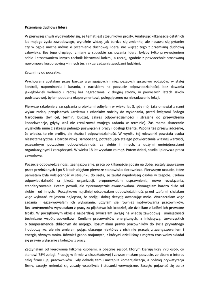 Przemiana duchowa lidera W pierwszej chwili wydawałoby się, że temat jest stosunkowo prosty. Analizując kilkanaście ostatnich lat mojego życia zawodowego, wyraźnie widzę, jak bardzo się zmieniło, ale nasuwa się pytanie: czy w ogóle można mówić o przemianie duchowej lidera, nie wiążąc tego z przemianą duchową człowieka. Bez tego drugiego, zmiany w sposobie zachowania lidera, byłyby tylko przyswojeniem sobie i stosowaniem innych technik kierowani ludźmi, a raczej, zgodnie z powszechnie stosowaną nowomową korporacyjną – innych technik zarządzania zasobami ludzkimi. Zacznijmy od początku. Wychowana zostałam przez bardzo wymagających i nieznoszących sprzeciwu rodziców, w stałej kontroli, napominaniu i karaniu, z naciskiem na poczucie odpowiedzialności, bez dawania jakiejkolwiek wolności i raczej bez nagradzania. Z drugiej strony, w pierwszych latach szkoły podstawowej, byłam poddana eksperymentowi, polegającemu na niezadawaniu lekcji. Pierwsze szkolenie z zarządzania projektami odbyłam w wieku lat 8, gdy mój tata omawiał z nami wykaz zadań, przypisanych każdemu z członków rodziny do wykonania, przed świętami Bożego Narodzenia (był cel, termin, budżet, zakres odpowiedzialności i straszne do przewidzenia konsekwencje, gdyby ktoś nie zrealizował swojego zadania w terminie). Zaś mama skutecznie wyszkoliła mnie z zakresu pełnego poświęcenia pracy i obsługi klienta. Wpoiła też przeświadczenie, że władza, to nie profity, ale służba i odpowiedzialność. W wyniku tej mieszanki powstała osoba niesystematyczna, z bardzo niską samooceną, potrzebująca stałego potwierdzania własnej wartości, przesadnym poczuciem odpowiedzialności za siebie i innych, z dużymi umiejętnościami organizacyjnymi i zarządczymi. W wieku 18 lat wyszłam za mąż. Potem dzieci, studia i pierwsza praca zawodowa. Poczucie odpowiedzialności, zaangażowanie, praca po kilkanaście godzin na dobę, zostały zauważone przez przełożonych i po 5 latach objęłam pierwsze stanowisko kierownicze. Pierwszym uczucie, które pamiętam była wdzięczność w stosunku do szefa, że zaufał najmłodszej osobie w zespole. Czułam odpowiedzialność za jakość organizacji, proponowałam usprawnienia, nowe rozwiązania, standaryzowanie. Potem powoli, ale systematycznie awansowałam. Wymagałam bardzo dużo od siebie i od innych. Początkowo najsilniej odczuwałam odpowiedzialność przed szefami, chciałam więc wykazać, że jestem najlepsza, że podjęli dobrą decyzję awansując mnie. Wyznaczałam więc zadania i egzekwowałam ich wykonanie, uczyłam się również motywowania pracowników. Bez sentymentów wyrzucałam z pracy za pijaństwo lub kradzież, ale dzieliłam z ludźmi ich prywatne troski. W początkowym okresie najbardziej zwracałam uwagę na wiedzę zawodową i umiejętności techniczne współpracowników. Ceniłam pracowników energicznych, z inicjatywą, towarzyskich o temperamencie zbliżonym do mojego. Rozumiałam prawo pracowników do życia prywatnego i odpoczynku, ale nie umiałam pojąć, dlaczego niektórzy z nich nie pracują z zaangażowaniem i energią równym moim. Również grono znajomych, z którymi dzieliliśmy z mężem czas wolny składał się prawie wyłącznie z kolegów z pracy. Zaczynałam od kierowania kilkoma osobami, a obecnie zespół, którym kieruję liczy 770 osób, co stanowi 75% załogi. Pracuję w firmie wielozakładowej i zawsze miałam poczucie, że dbam o interes całej firmy i jej pracowników. Gdy dekadę temu nastąpiła komercjalizacja, a później prywatyzacja firmy, zaczęły zmieniać się zasady współżycia i stosunki wewnętrzne. Zaczęło pojawiać się coraz więcej osób, które wg mojej ówczesnej opinii, w sposób agresywny walczyły jedynie o zaspokojenie potrzeb własnych lub wąskiej grupy współpracowników, za to potrafiły się świetnie wypromować. Miałam wrażenie, że są tacy, którym zależy przede wszystkim na tym, żeby wylansować się, zdeklasować i wykorzystać mój zespół oraz zniszczyć moją pozycję. Rzuciłam się, więc jeszcze intensywniej w wir pracy. Walczyłam o moich ludzi, o możliwość wpływu na decyzje w firmie, ale też i o moją własną pozycję. Oczekiwałam od innych dyrektorów uczciwej współpracy, bez walki o władzę, nie zdając sobie sprawy z tego, że tak naprawdę ja również pragnęłam władzy. Uważałam, że to właśnie ja robię najlepszą robotę, ze jestem najbardziej zaangażowana i tylko ja naprawdę dbam o ludzi. Podczas dyskusji ostro forsowałam swoje zdanie, nie przyjmując, że ktokolwiek inny może mieć rację, szczególnie, jeśli był to ktoś, kogo postrzegałam, jako zagrożenie. Życzyłam ludziom, żeby czuli się w moim towarzystwie tak, jak ja się czuję w ich i żeby spotykało ich to, co mi robią. Niby nic złego, ale .. Pragnąc być najlepszą, starałam się robić wszystko samodzielnie; polegałam wyłącznie na własnej wiedzy, inteligencji i niezawodności. Brnęłam w obsesyjny aktywizm, który często nie przynosił oczekiwanych rezultatów. Nie prosiłam nikogo o pomoc, bo wierzyłam w swoją nieomylność, szczególnie nie czułam potrzeby pytania o zdanie pracowników i osób, których nie darzyłam sympatią, przecież przechodząc całą ścieżkę kariery od referenta do dyrektora nabrałam olbrzymiego doświadczenia. Porównywałam się do innych, udowadniając, że jestem najlepsza i bardzo dotkliwie przeżywałam ich wyższe pensje, premie i nagrody, których to ja się spodziewałam. Głosiłam, że praca jest największą wartością, a tak naprawdę, to bałam się głębszej refleksji nad własnym życiem. Miałam wówczas stałą potrzebę dowartościowywania się i poczucie, że jedyne, co mogę zaoferować innym, to moje umiejętności zawodowe. Swoich oponentów serdecznie nie znosiłam – swoją ocenę opierałam przede wszystkim tylko na ich zachowaniu podczas publicznych spotkań. Mimo c